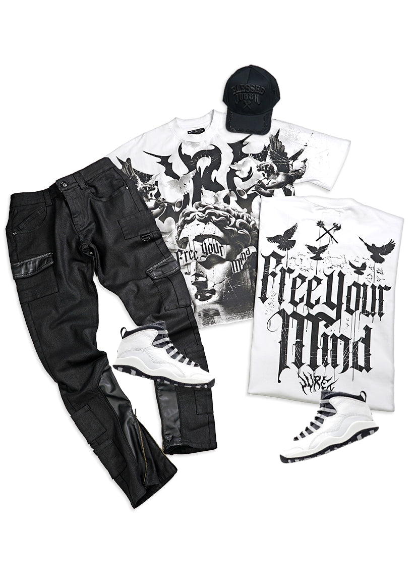 Free Your Mind White T-Shirt, Black Denim Jeans and Leather Trucker Hat Combo (Shoes Not Included)