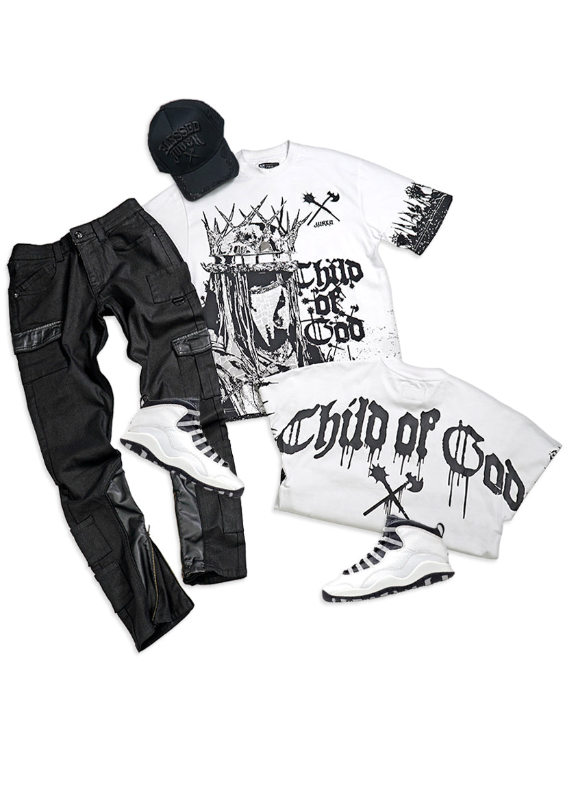 Child of God White T-Shirt, Black Denim Jeans and Leather Trucker Hat Combo (Shoes Not Included)