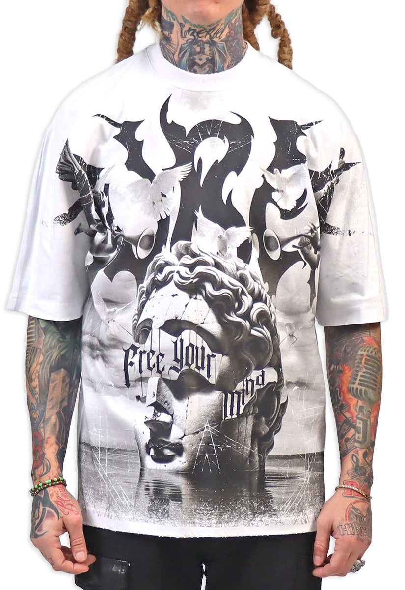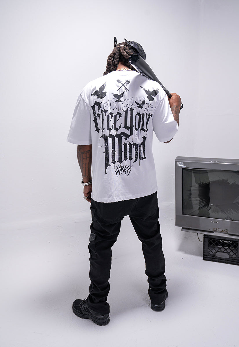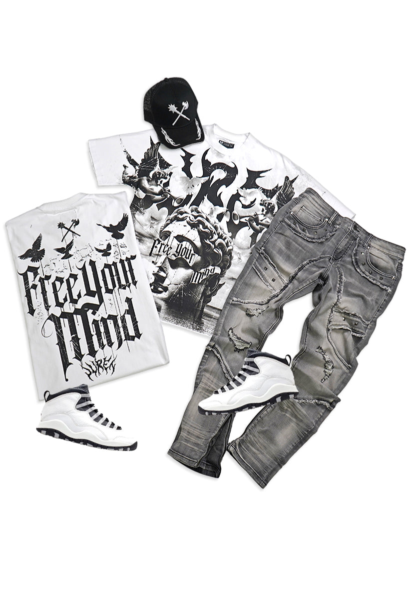 Free Your Mind White T-Shirt, Grey Denim Jeans and Leather Trucker Hat Combo Include: