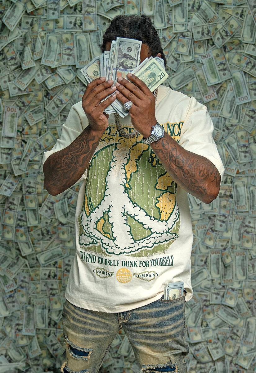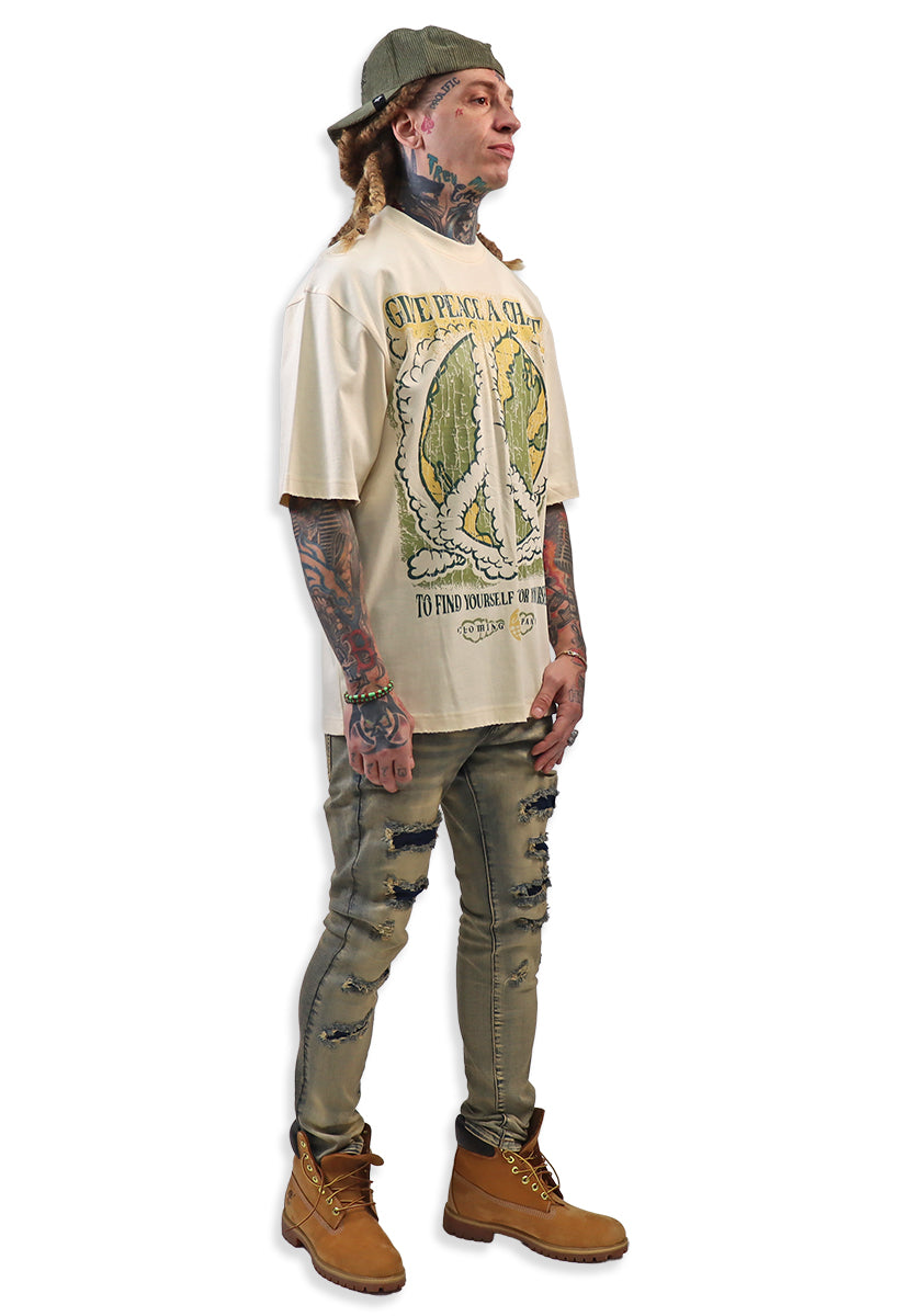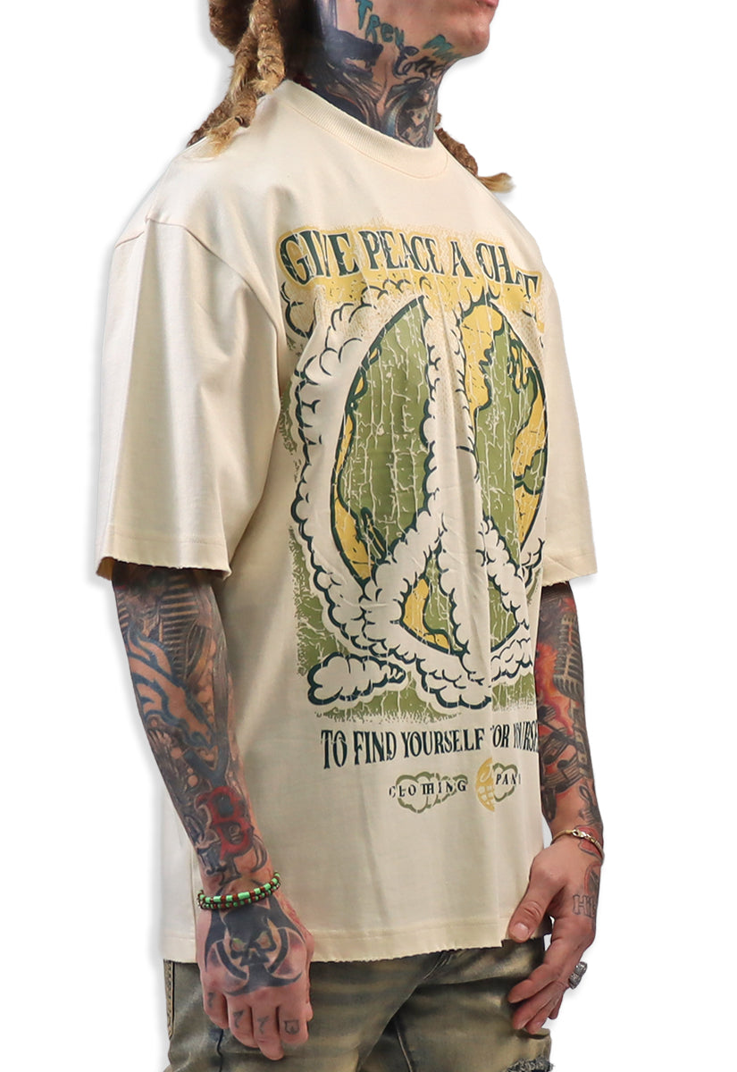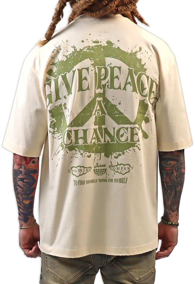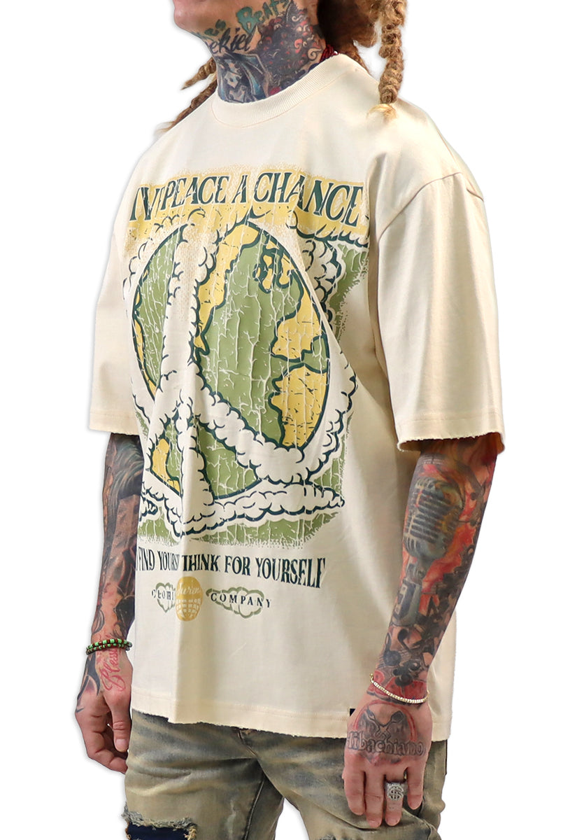 The Give Peace A Chance Cream shirt features a distinctive design combining artistic elements and a powerful message. On the front, an intricate smoke peace symbol is integrated into the typography, blending creativity with symbolism. The back showcases a bold, splattered peace symbol accompanied by the phrase "Give Peace A Chance," emphasizing a call for harmony and unity. Crafted for those who appreciate meaningful art and activism, this shirt serves as both a statement piece and a conversation starter, encouraging wearers to embrace and promote peace in daily life.