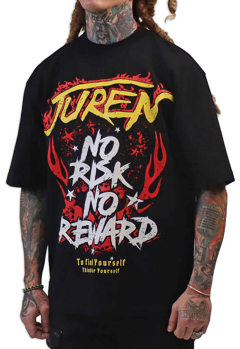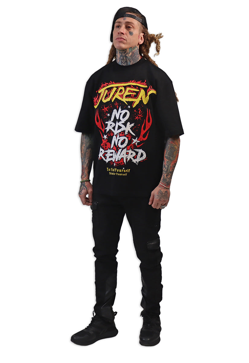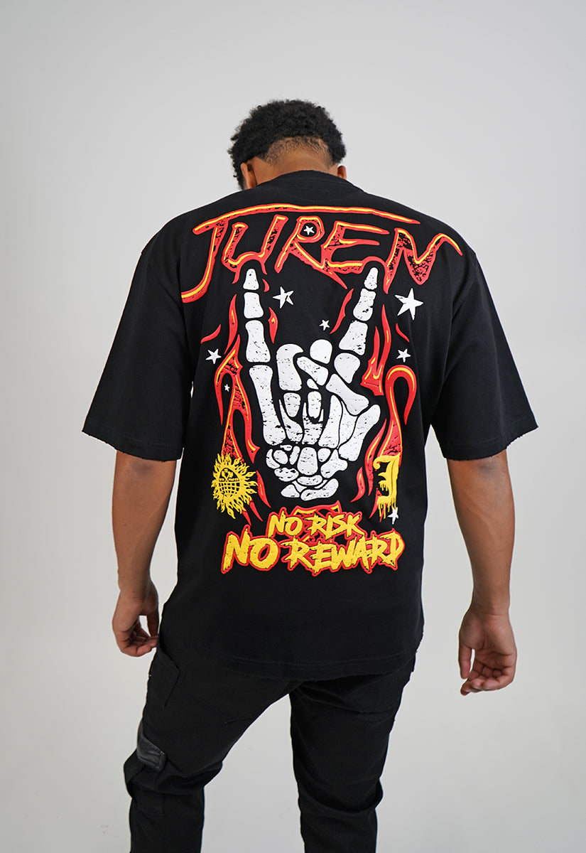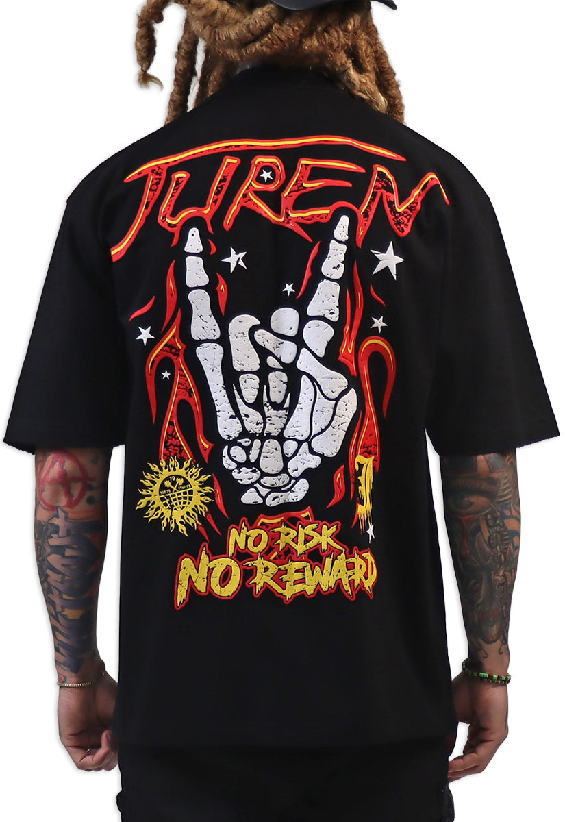 The No Risk No Rewards Black Shirt from Juren Clothing features a bold design that blends attitude and style. On the front, the classic Juren logo appears in sleek yellow, surrounded by vivid red flames that add dynamic energy and visual impact. The "No Risk No Reward" message is also encircled by the same striking red flames, emphasizing its empowering message. The back showcases a detailed skeleton rock hand symbol in White, reinforcing the shirt’s edgy, fearless spirit. Crafted with quality materials, this shirt is perfect for those who embrace challenge and confidence in their everyday wear.