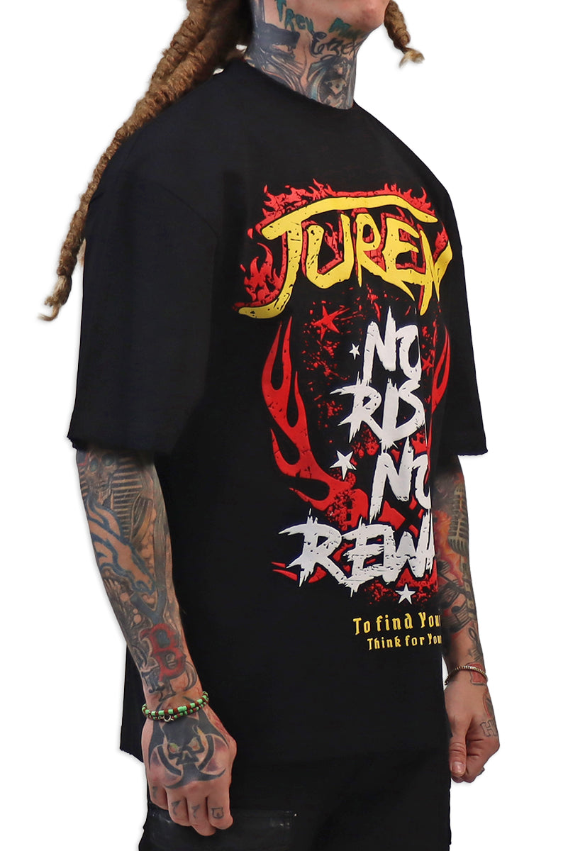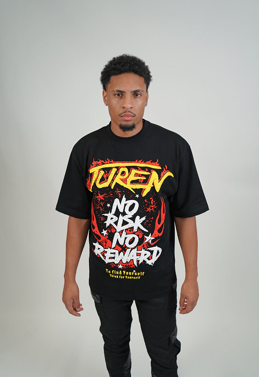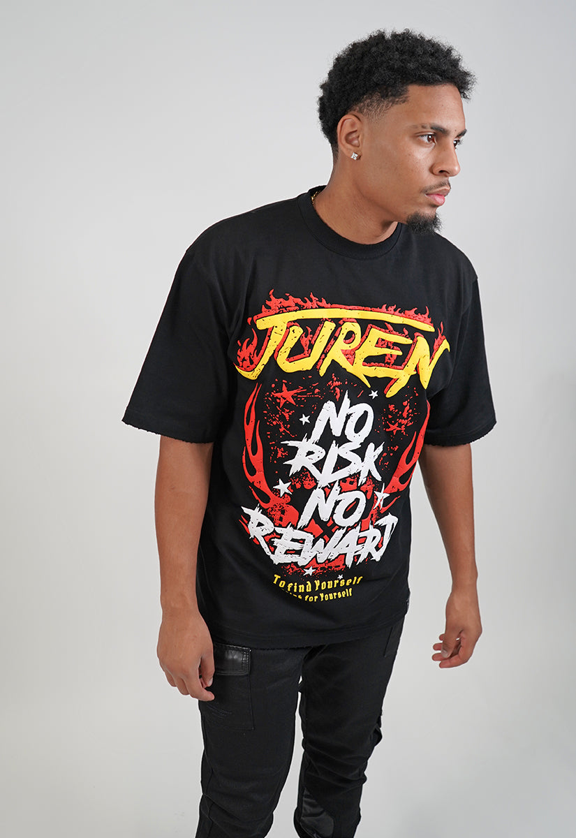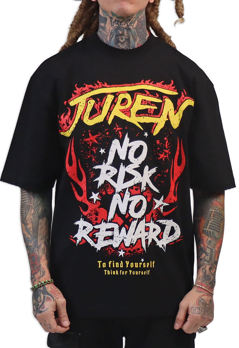 The No Risk No Rewards Black Shirt from Juren Clothing features a bold design that blends attitude and style. On the front, the classic Juren logo appears in sleek yellow, surrounded by vivid red flames that add dynamic energy and visual impact. The "No Risk No Reward" message is also encircled by the same striking red flames, emphasizing its empowering message. The back showcases a detailed skeleton rock hand symbol in White, reinforcing the shirt’s edgy, fearless spirit. Crafted with quality materials, this shirt is perfect for those who embrace challenge and confidence in their everyday wear.