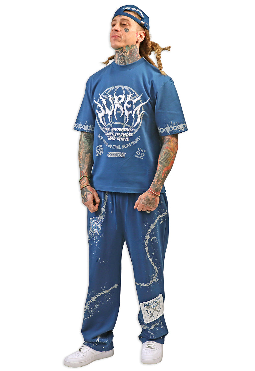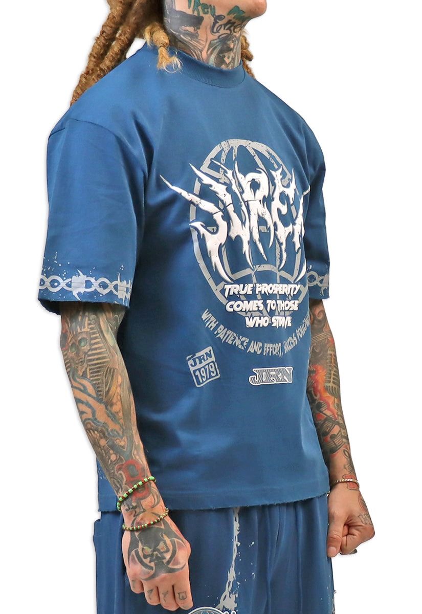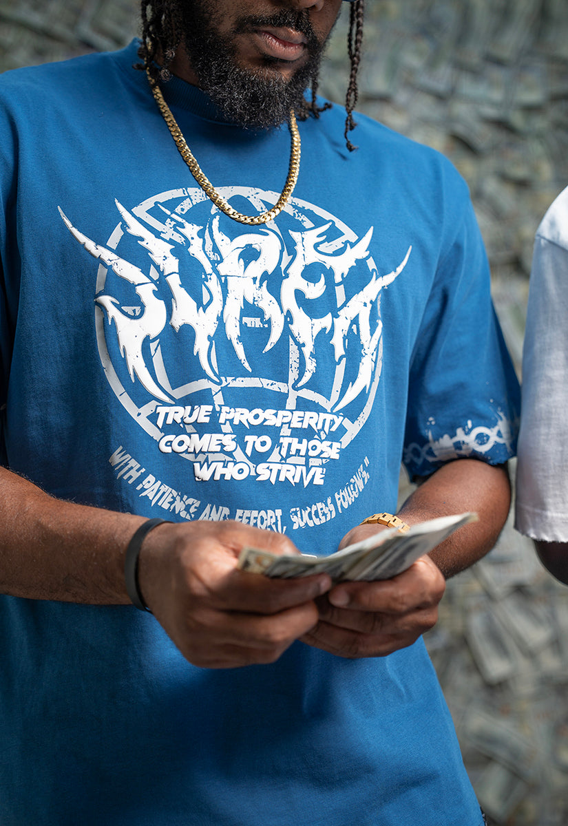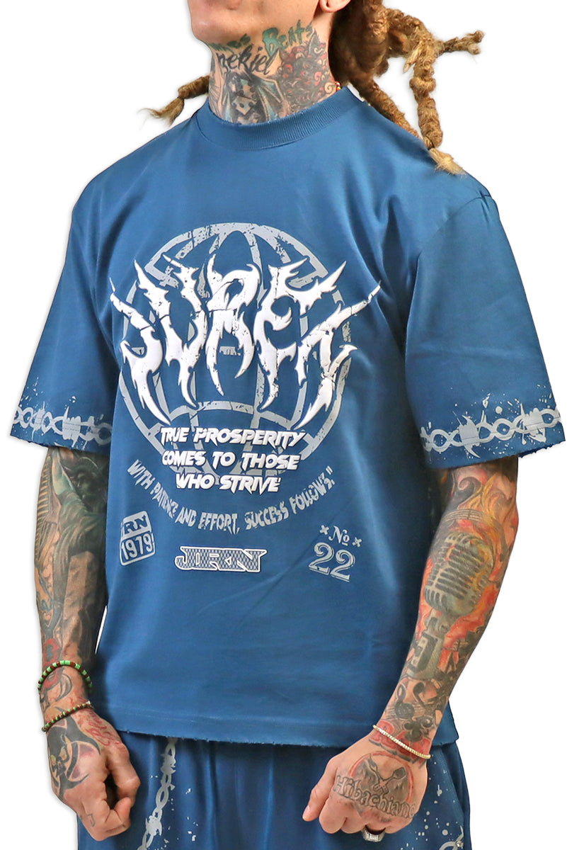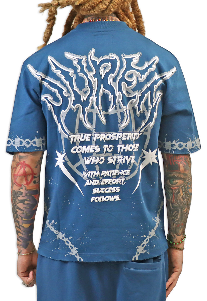 The True Prosperity T-Shirt in French Blue showcases a distinctive gray globe design featuring the Juren logo, symbolizing global ambition and success. Emblazoned with the phrase "The World's True Prosperity Comes to Those Who Strive," it inspires relentless pursuit of goals. The gray barbed wire print on the sleeves and back adds a bold, edgy element that emphasizes resilience and determination. Crafted with attention to detail, this shirt blends meaningful symbolism with contemporary style, making it an ideal choice for those who value both fashion and purpose.