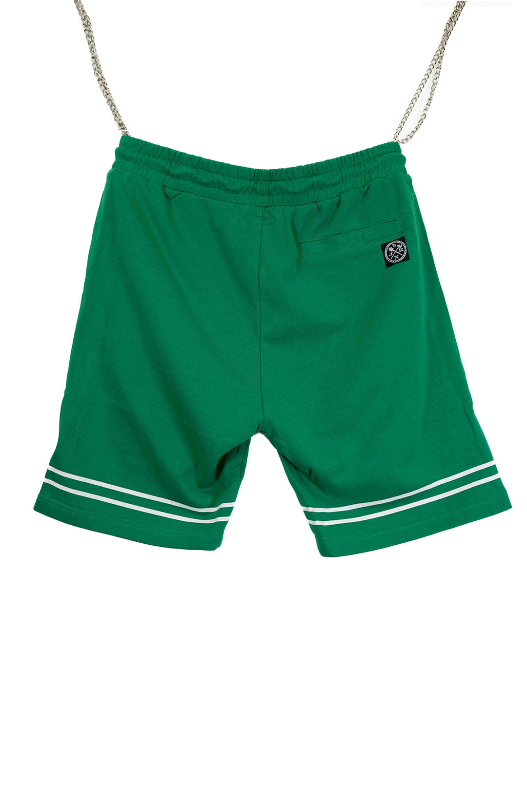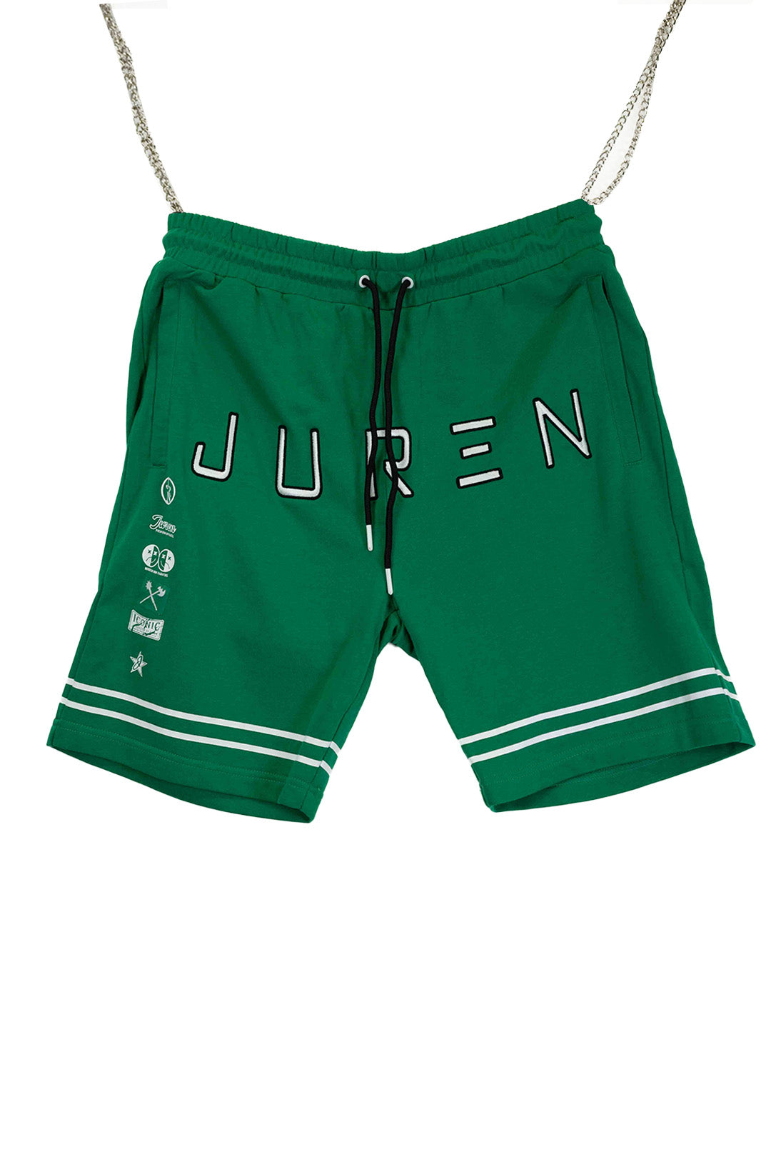 The "Juren Signature Green Shorts" feature a refined embroidered knit design, adding sophistication to their classic green hue. Perfect for any occasion, these shorts effortlessly blend style and comfort, making them a versatile wardrobe staple.