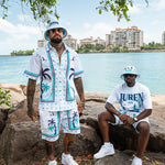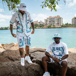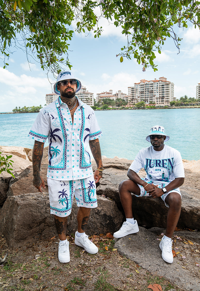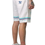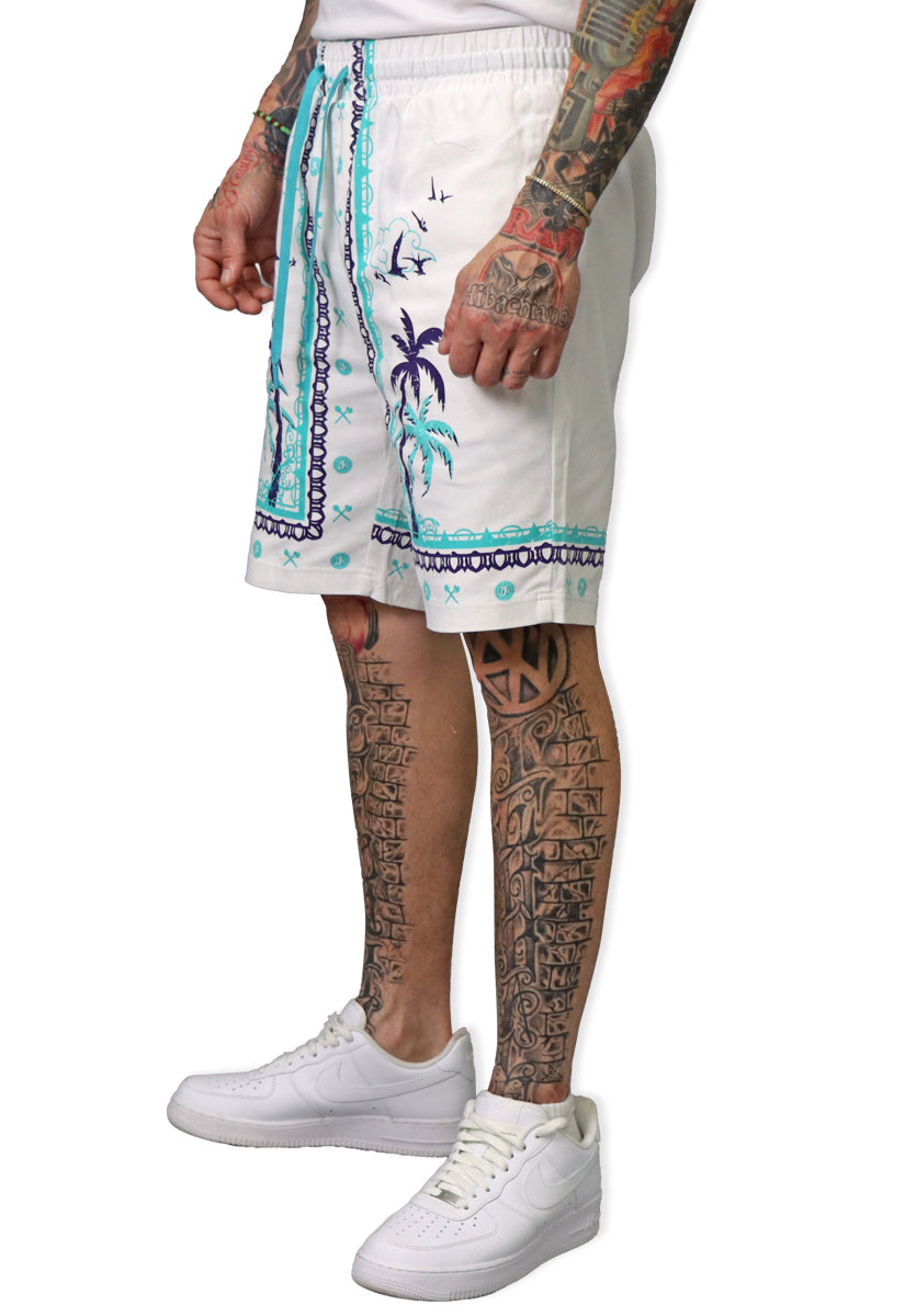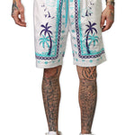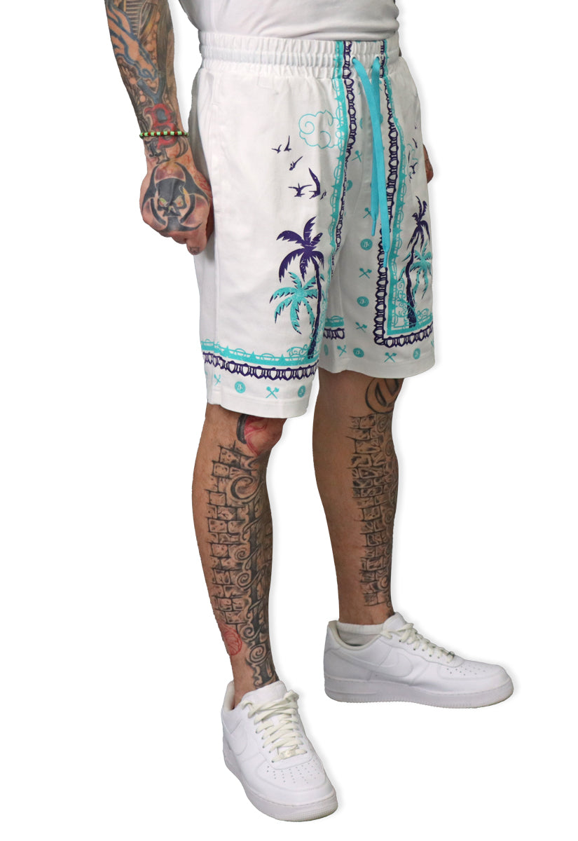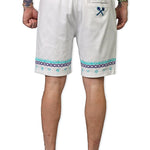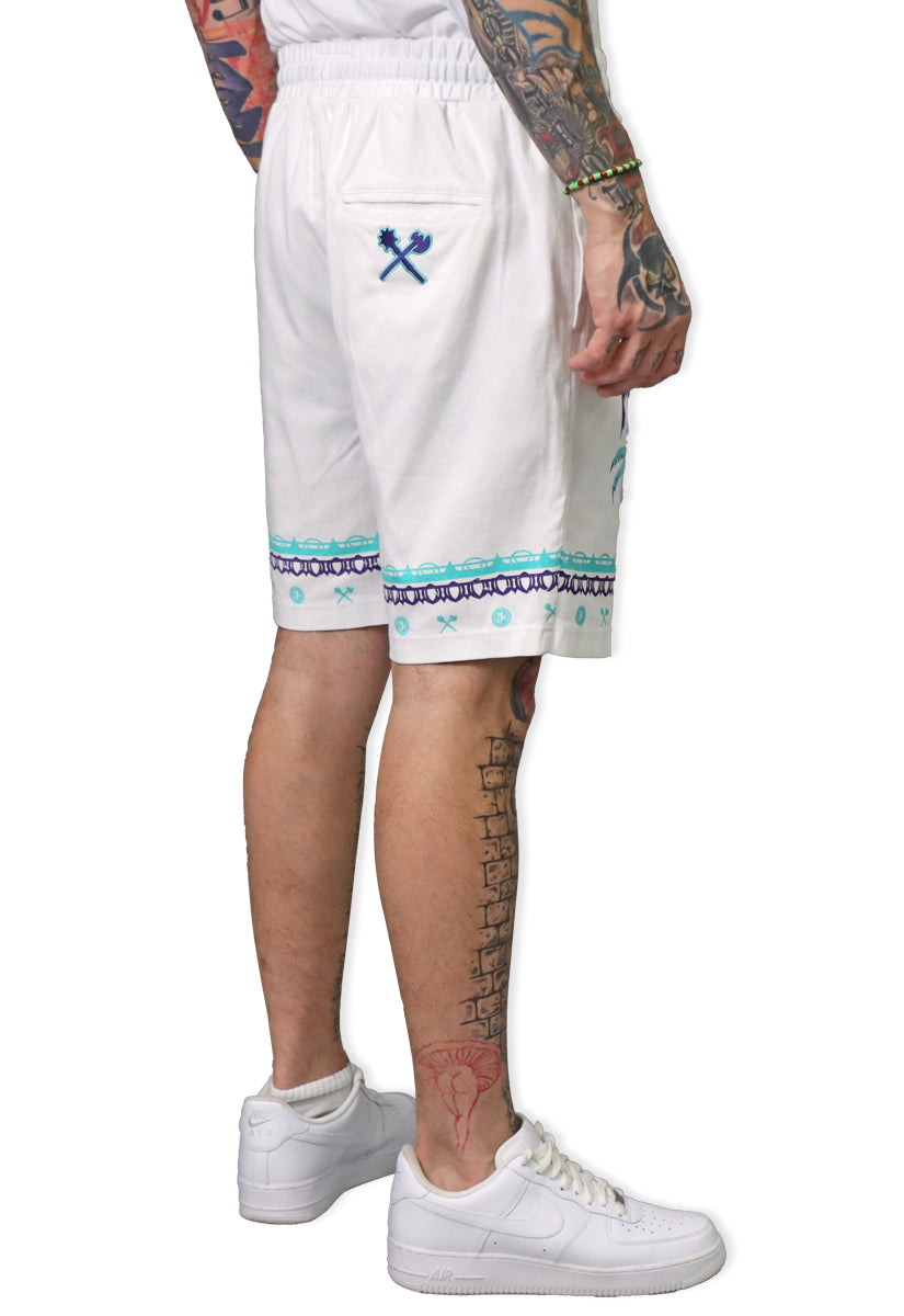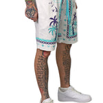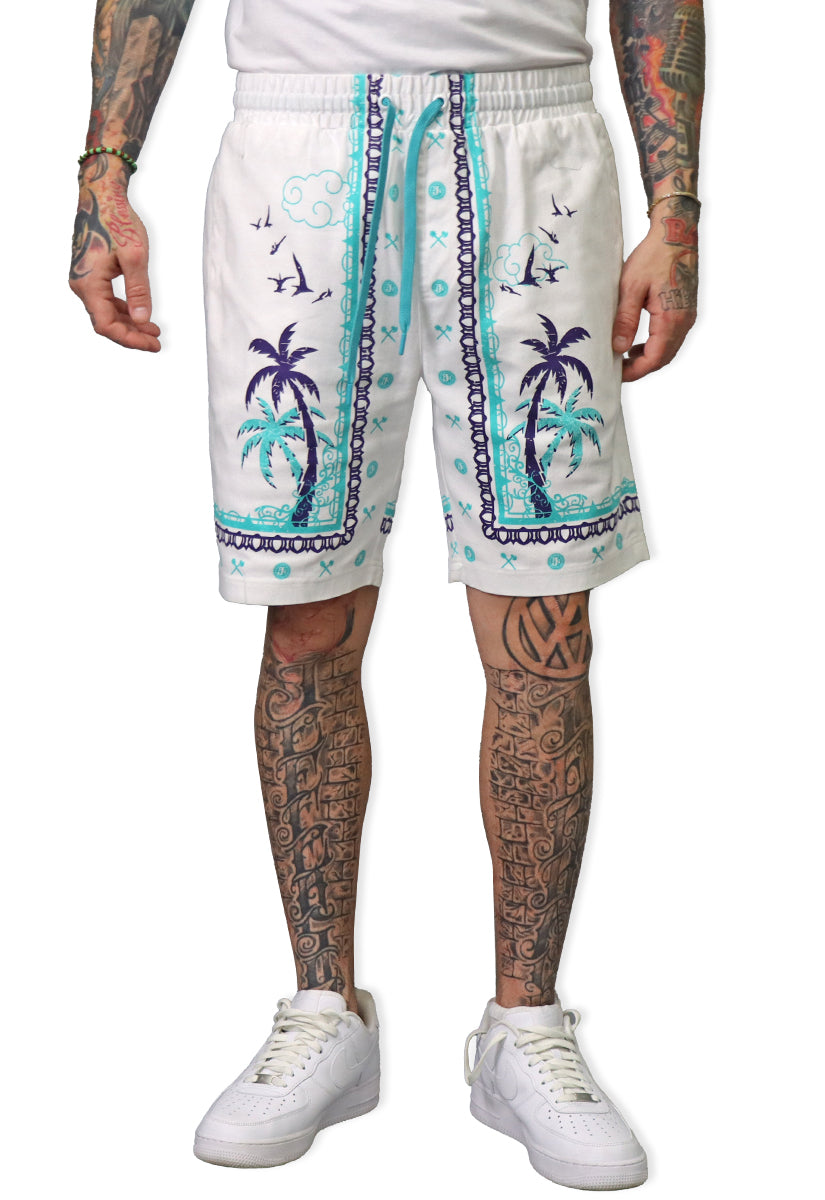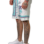 With these Defining Success Shorts, you'll be ready to conquer any challenge in style. Featuring a white twill fabric with vibrant purple and teal palm trees, accented by intricate teal and purple designs, these shorts exude confidence and determination. The small juren seals and battle club and axe motifs in teal add a touch of detail to make you stand out. Perfect for any occasion, these shorts will have you feeling like a true champion.