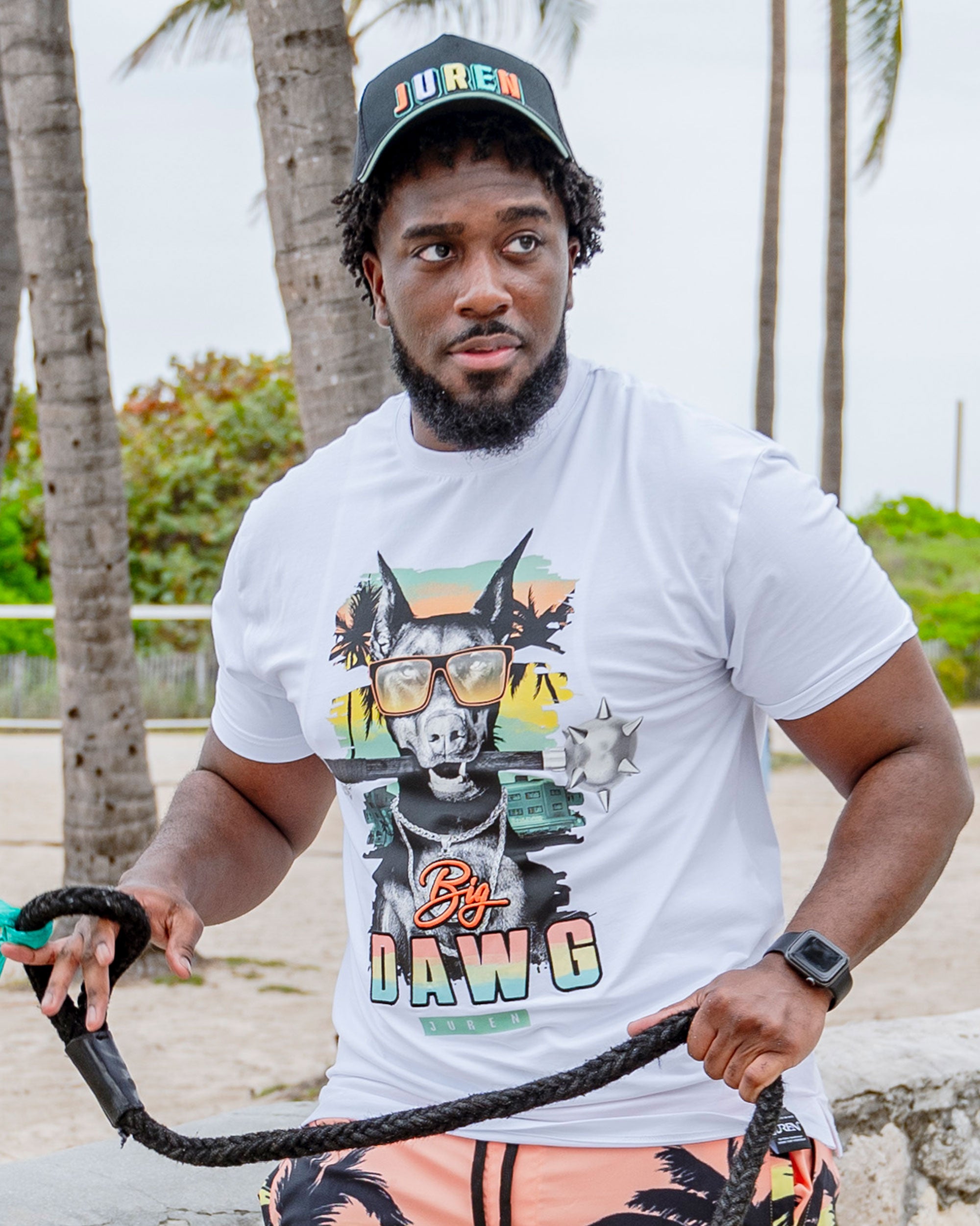 Unleash your style with the Big Dawg White Tee. Featuring a striking graphic of a Doberman holding a mace in its mouth against a vacation backdrop, this tee exudes boldness and adventure. Crafted for comfort and durability, it's perfect for those who dare to stand out from the crowd. Elevate your streetwear game with the Big Dawg White Tee and unleash your inner beast. 🐕🏝️👕