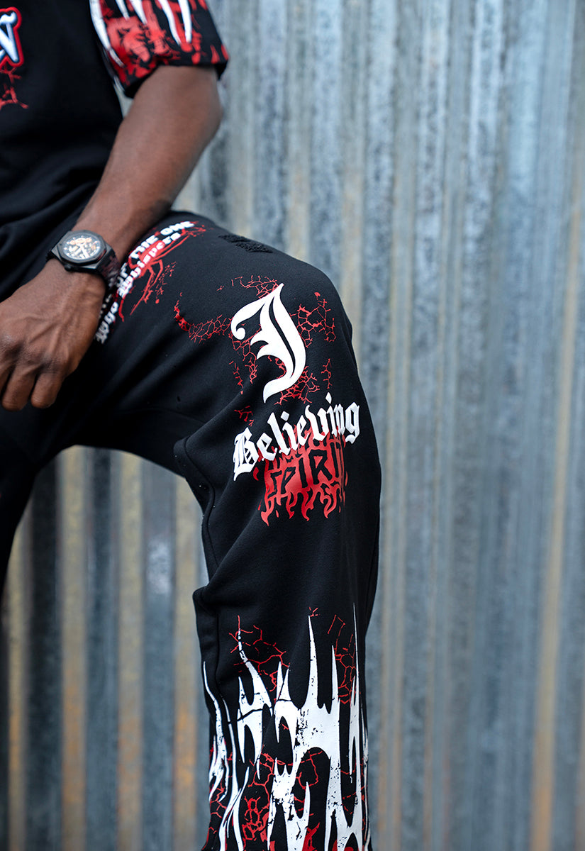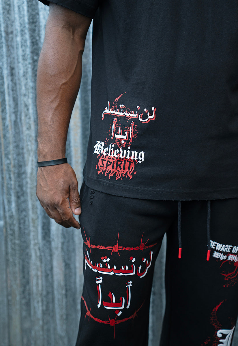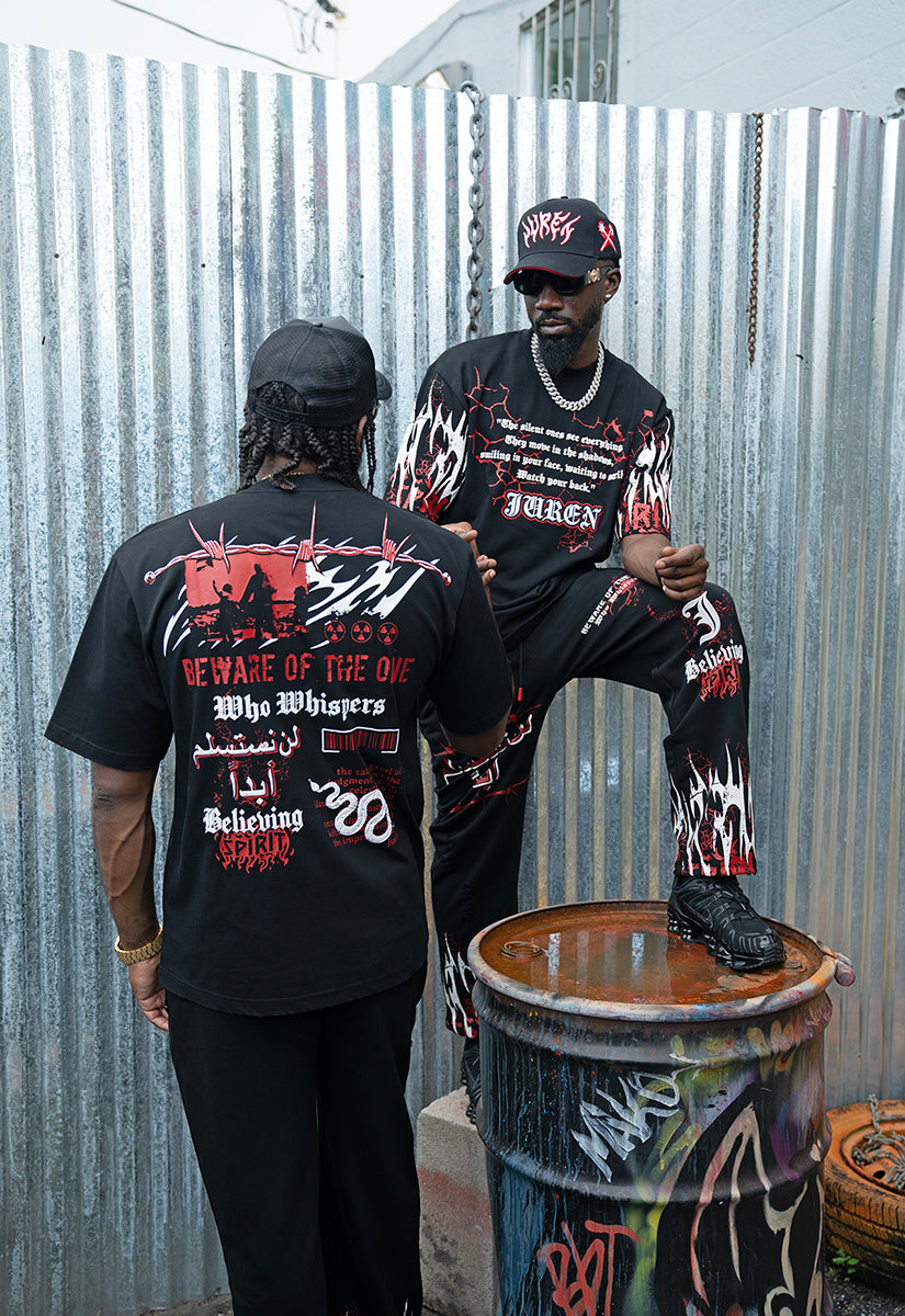 The Beware of The One Black T-Shirt features a striking gothic-style "J" embroidered in white, complemented by the bold red text "beware of the one who whispers" across the chest. This shirt also includes a red and white "believing spirit" print near the right bottom. On the back, an impactful design combines the message "Beware of the one who whisper believing spirit" with a white snake graphic, creating a powerful visual statement. Crafted for those who appreciate symbolic style and subtle storytelling, this tee merges detailed embroidery with vivid prints for a unique look. Black Shirt and Black Jogger.