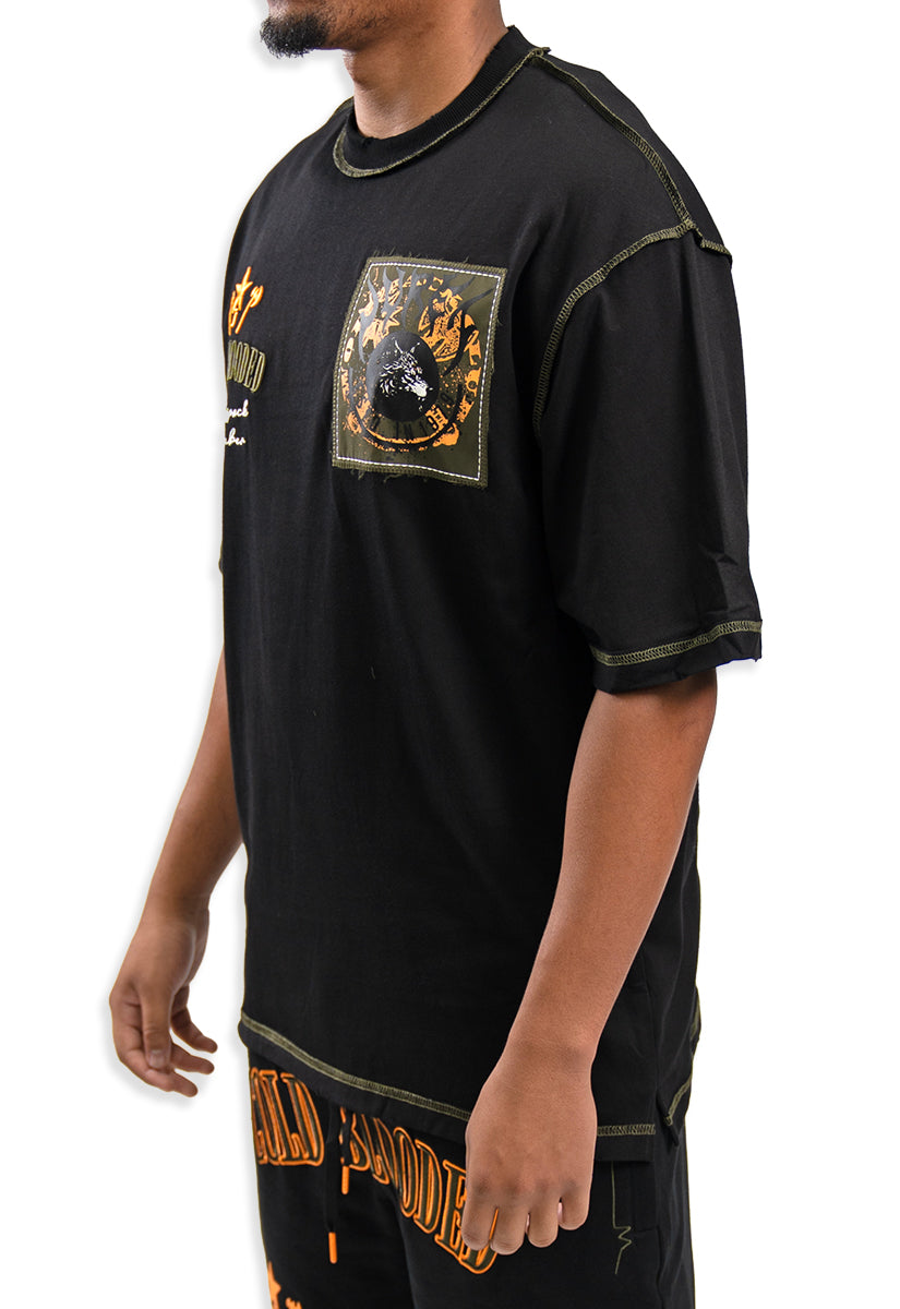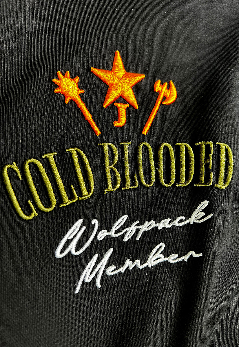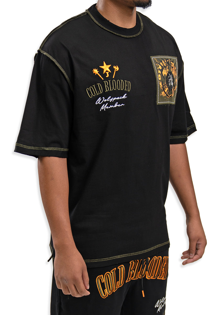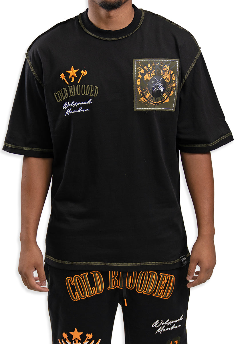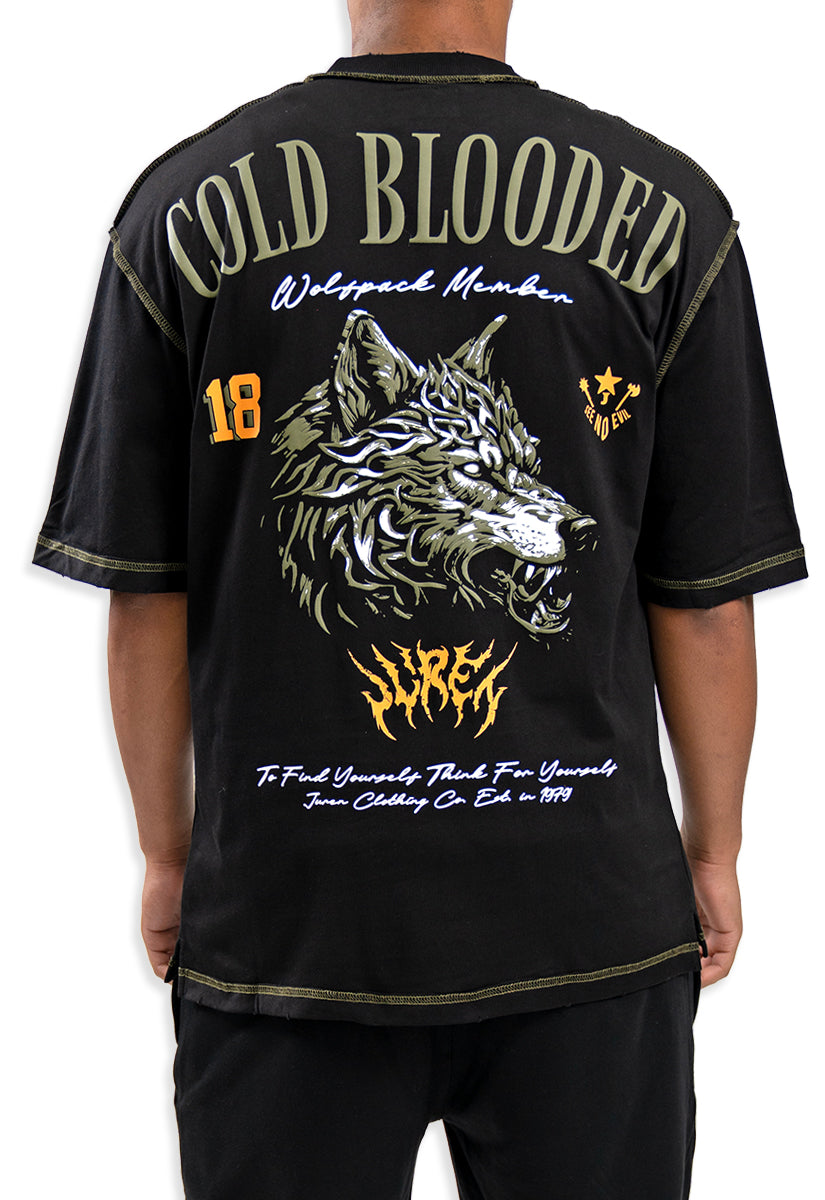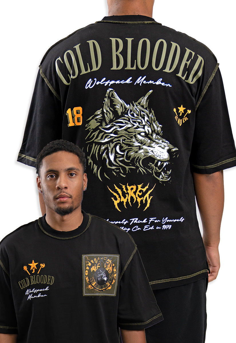 The Cold Blooded T-Shirt combines bold design with premium comfort. This black oversized tee features the Juren logo on the front, accented by an olive patch for a subtle yet distinctive touch. On the back, a large gel print showcases the phrase "Cold Blooded" above an intense, angry wolf head graphic, creating a striking visual statement. Crafted for those who appreciate edgy streetwear with expert attention to detail, this shirt offers both style and durability for everyday wear.