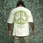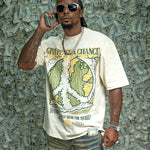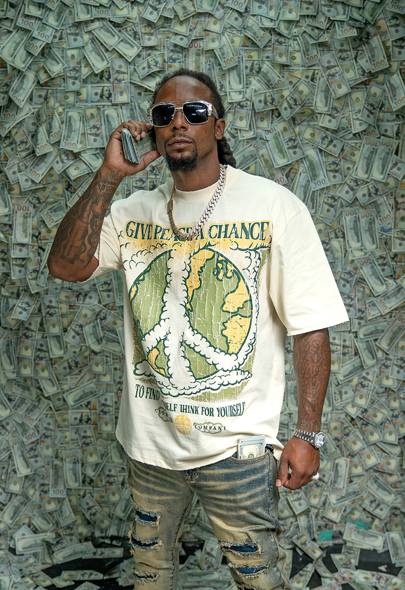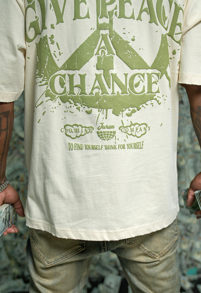 The Give Peace A Chance Cream shirt features a distinctive design combining artistic elements and a powerful message. On the front, an intricate smoke peace symbol is integrated into the typography, blending creativity with symbolism. The back showcases a bold, splattered peace symbol accompanied by the phrase "Give Peace A Chance," emphasizing a call for harmony and unity. Crafted for those who appreciate meaningful art and activism, this shirt serves as both a statement piece and a conversation starter, encouraging wearers to embrace and promote peace in daily life.
