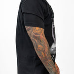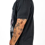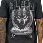 The Juren Alpha Wolf Chenille Black Tee features the word "Alpha" in plush chenille fabric with attached embroidery. A striking wolf head is overlaid on a moon, accompanied by the empowering words "I do not fear, they fear me." Fog details underneath the wolf/moon add depth, along with additional alpha wolf verbiage and Juren symbols embroidered throughout. This tee combines bold design elements with a sleek black backdrop, perfect for making a confident statement in any setting.