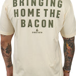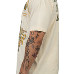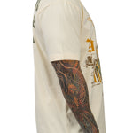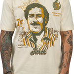 The Juren Bring It Home Cream Tee features a sleek cream fabric, offering a subtle backdrop for its bold design elements. The front of the shirt showcases a Pablo Escobar print with felt accents laid over the skyline of Medellin, complemented by an embroidered Juren Icon for added detail. On the back, the tee boldly states "BRINGING HOME THE BACON," conveying a message of ambition and success. This tee combines urban aesthetics with powerful messaging, making it a standout piece in any collection.