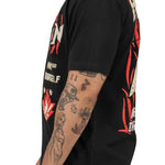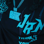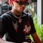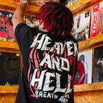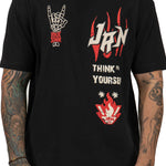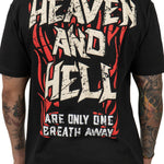 The Juren Heaven and Hell Tee Black embodies a rock star aesthetic with a bold design. The front features a large embroidered JRN monogram paired with the phrase "Think For Yourself," creating a rebellious and thought-provoking statement. On the back, "Heaven and Hell" is displayed in a big distressed puff print, with the poignant message "Heaven and Hell Are Only One Breath Away" in smaller puff print at the bottom. This tee combines powerful imagery and words, making it a standout piece for those who embrace individuality.