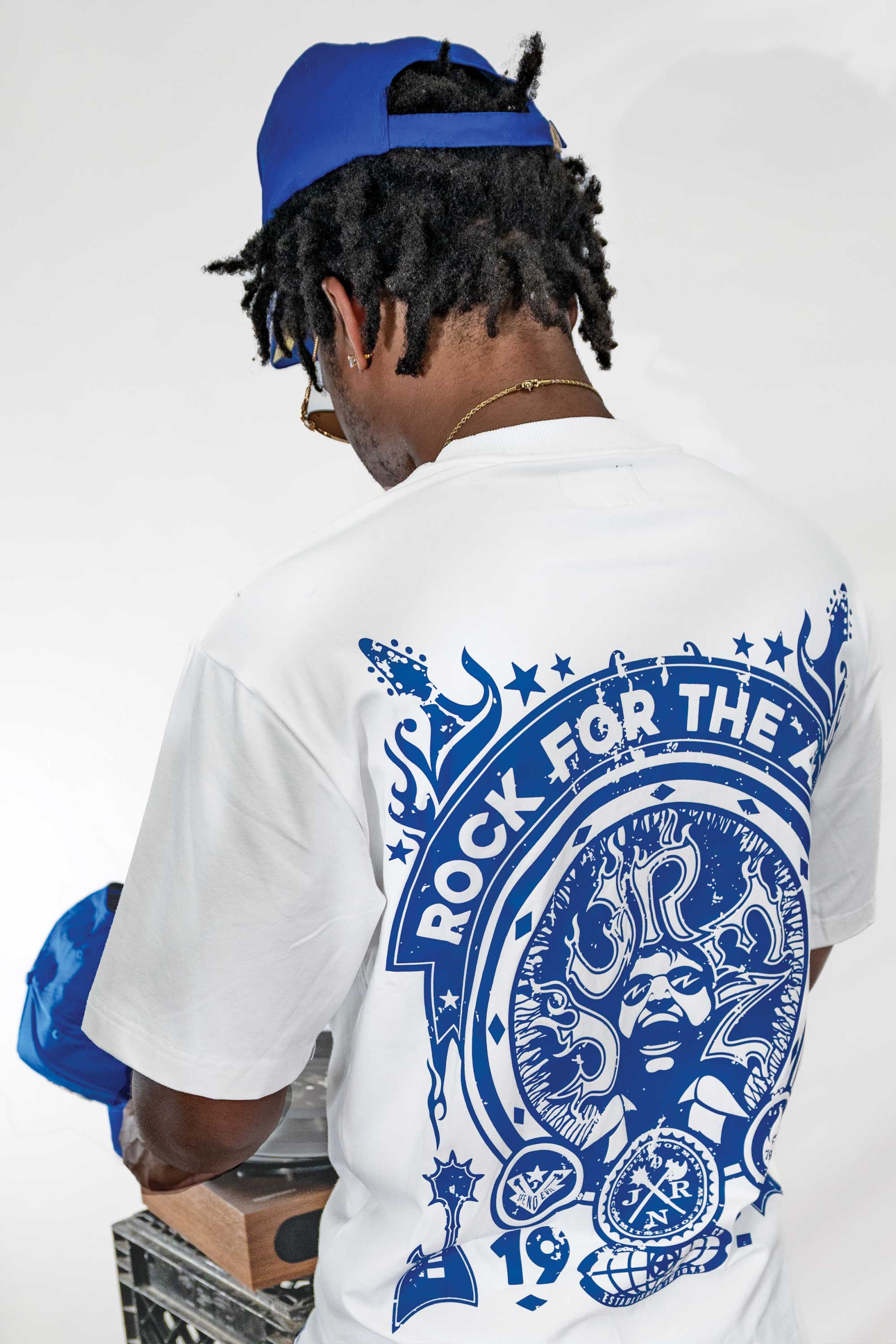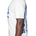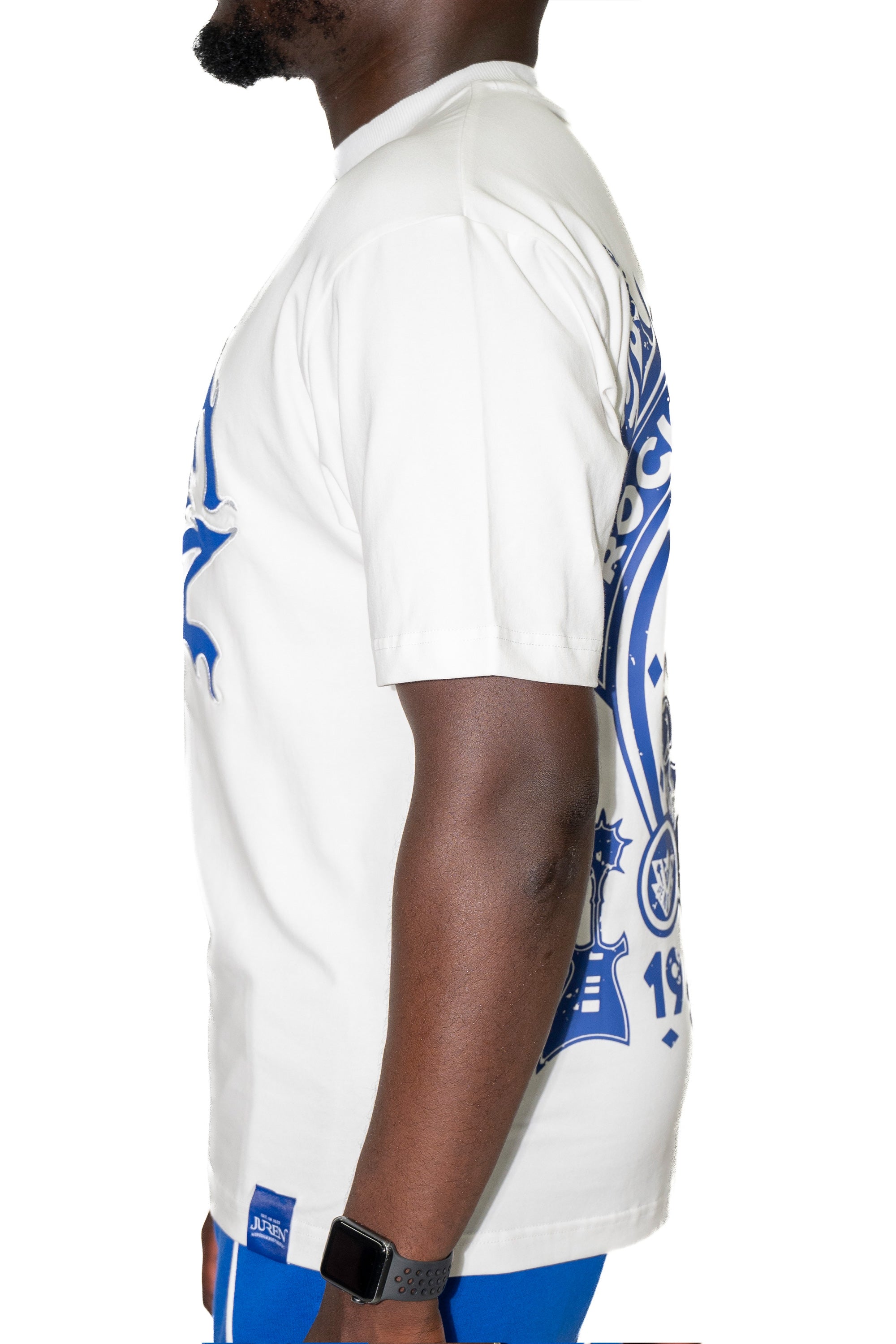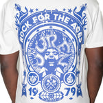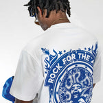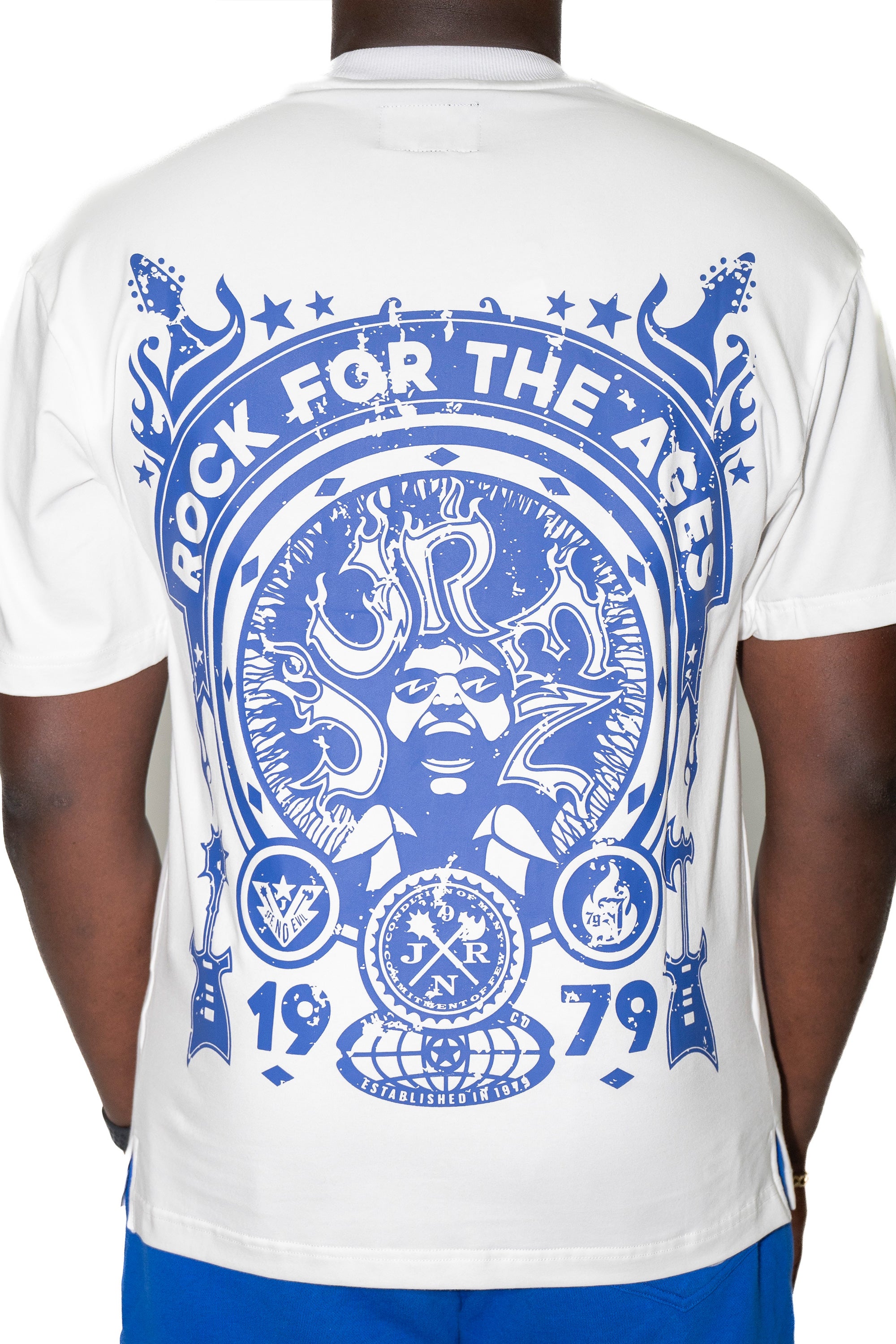 Juren Rock for the Ages Tee, a striking white shirt that blends classic and contemporary elements seamlessly. The front showcases a royal print adorned with vegan leather, meticulously outlined with intricate embroidery for a touch of refined craftsmanship. Turn around to reveal a bold 70's style rock psychedelic design that dominates the back, making a vibrant statement. Perfect for those who want to merge vintage vibes with modern fashion, this tee is a standout addition to any wardrobe.