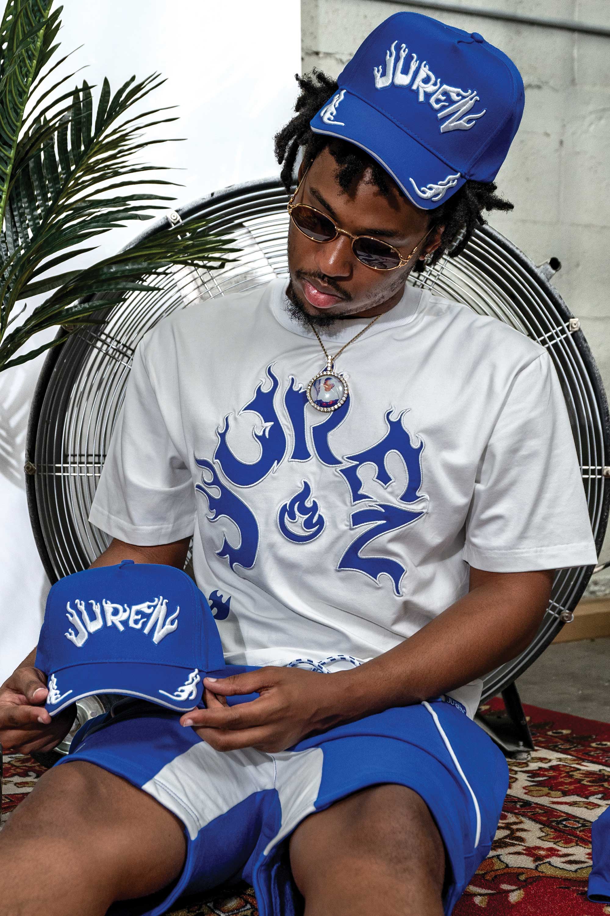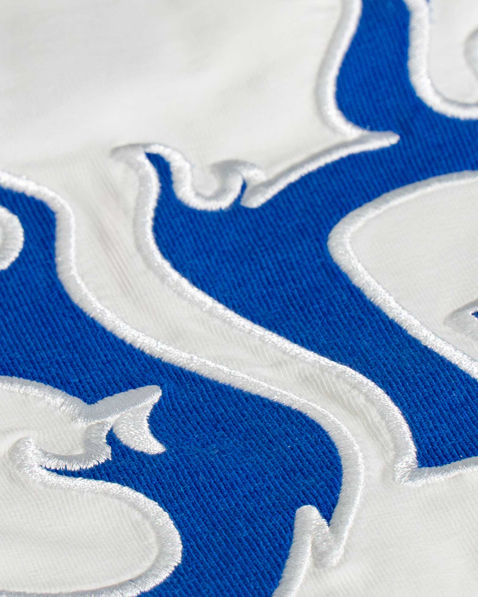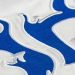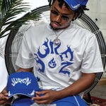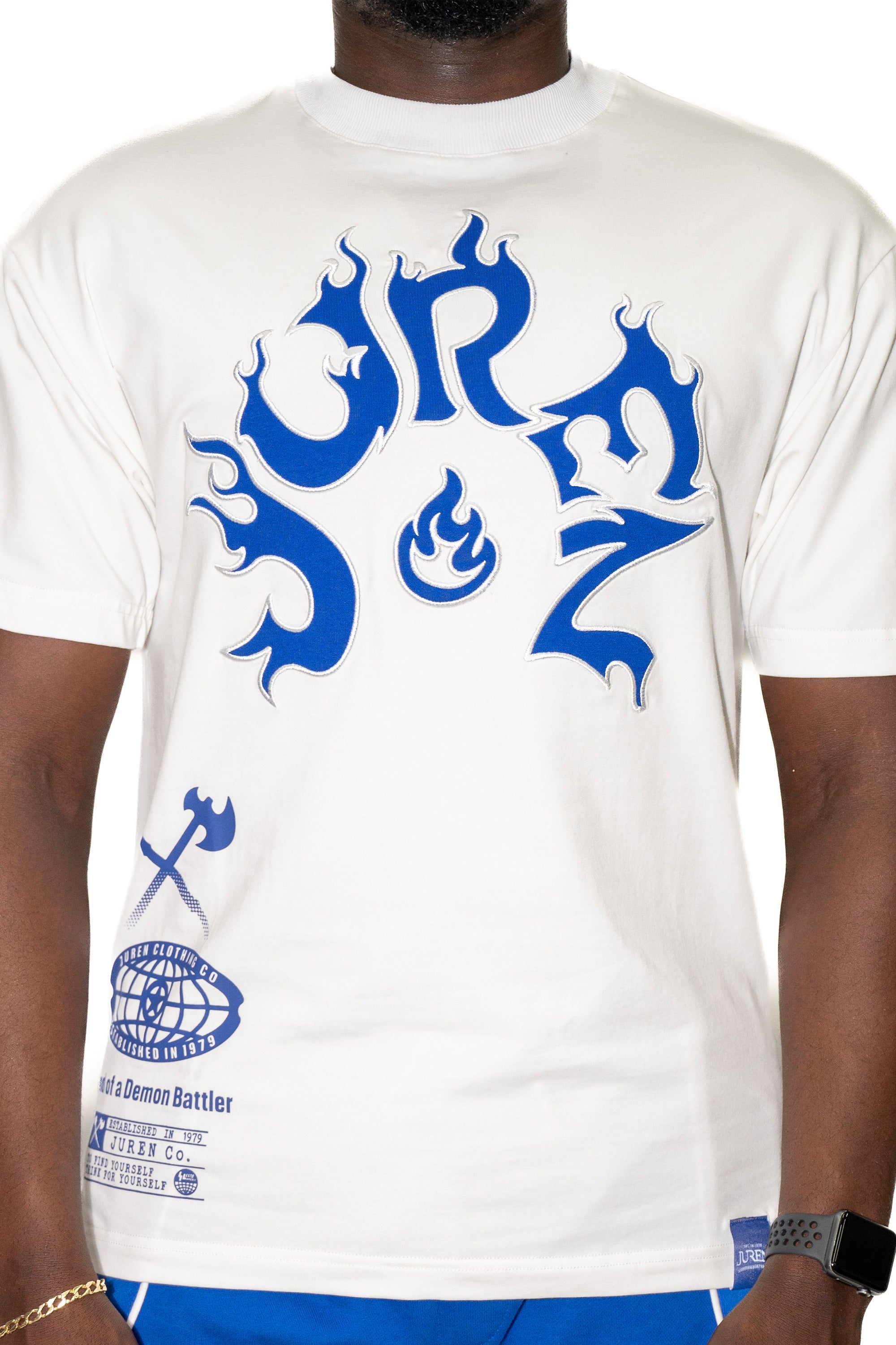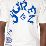 Juren Rock for the Ages Tee, a striking white shirt that blends classic and contemporary elements seamlessly. The front showcases a royal print adorned with vegan leather, meticulously outlined with intricate embroidery for a touch of refined craftsmanship. Turn around to reveal a bold 70's style rock psychedelic design that dominates the back, making a vibrant statement. Perfect for those who want to merge vintage vibes with modern fashion, this tee is a standout addition to any wardrobe.
