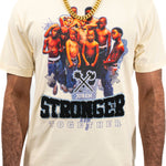 The Juren Stronger Together Embroidered Tee Cream showcases a soft cream body fabric adorned with a group of young black kids standing together. The phrase "Stronger Together" is highlighted, with "stronger" rendered in plush chenille fabric and outlined with embroidery for added texture, while "together" is printed on. This tee celebrates unity and strength with a blend of tactile and printed elements, making it a versatile and impactful addition to any wardrobe.