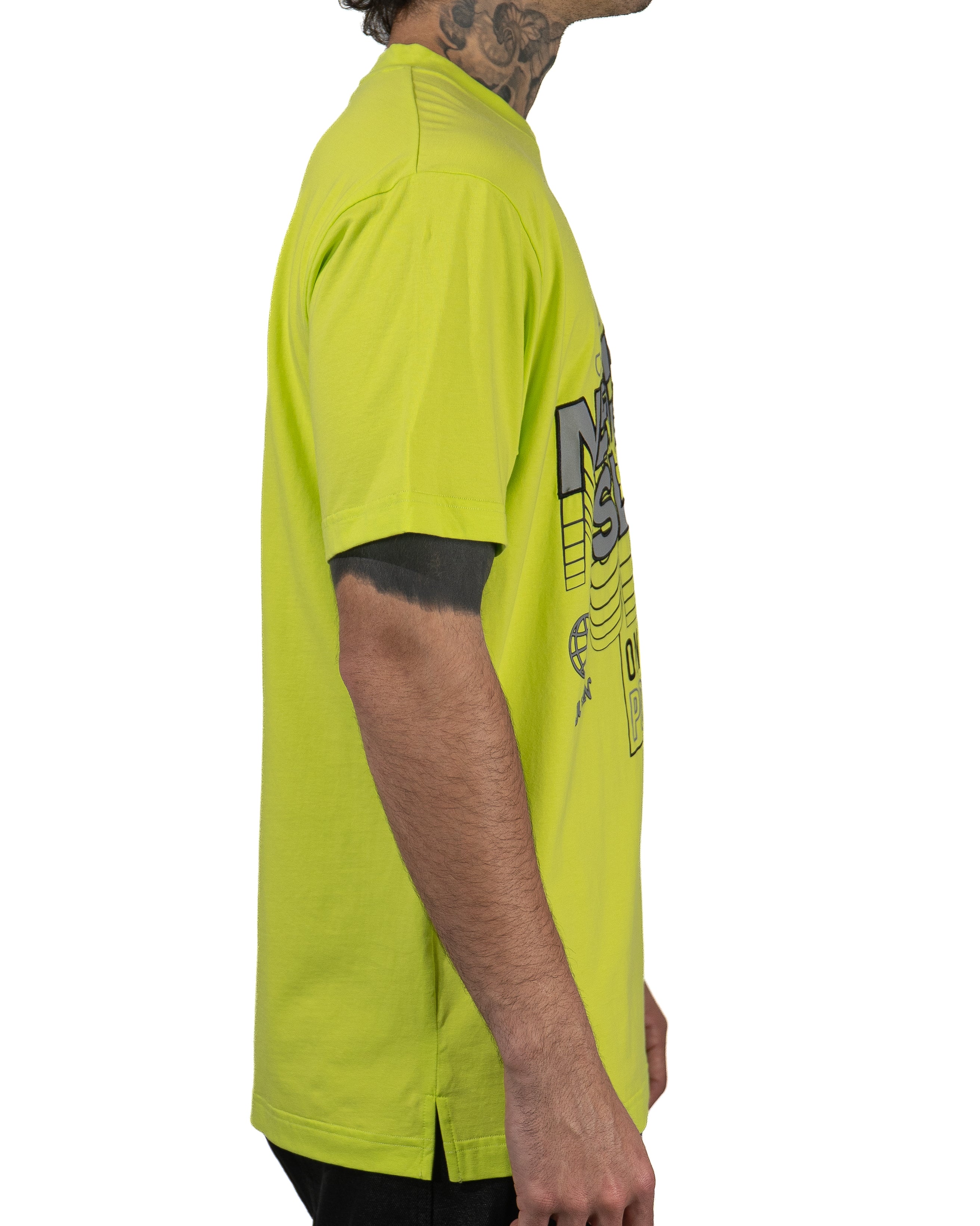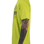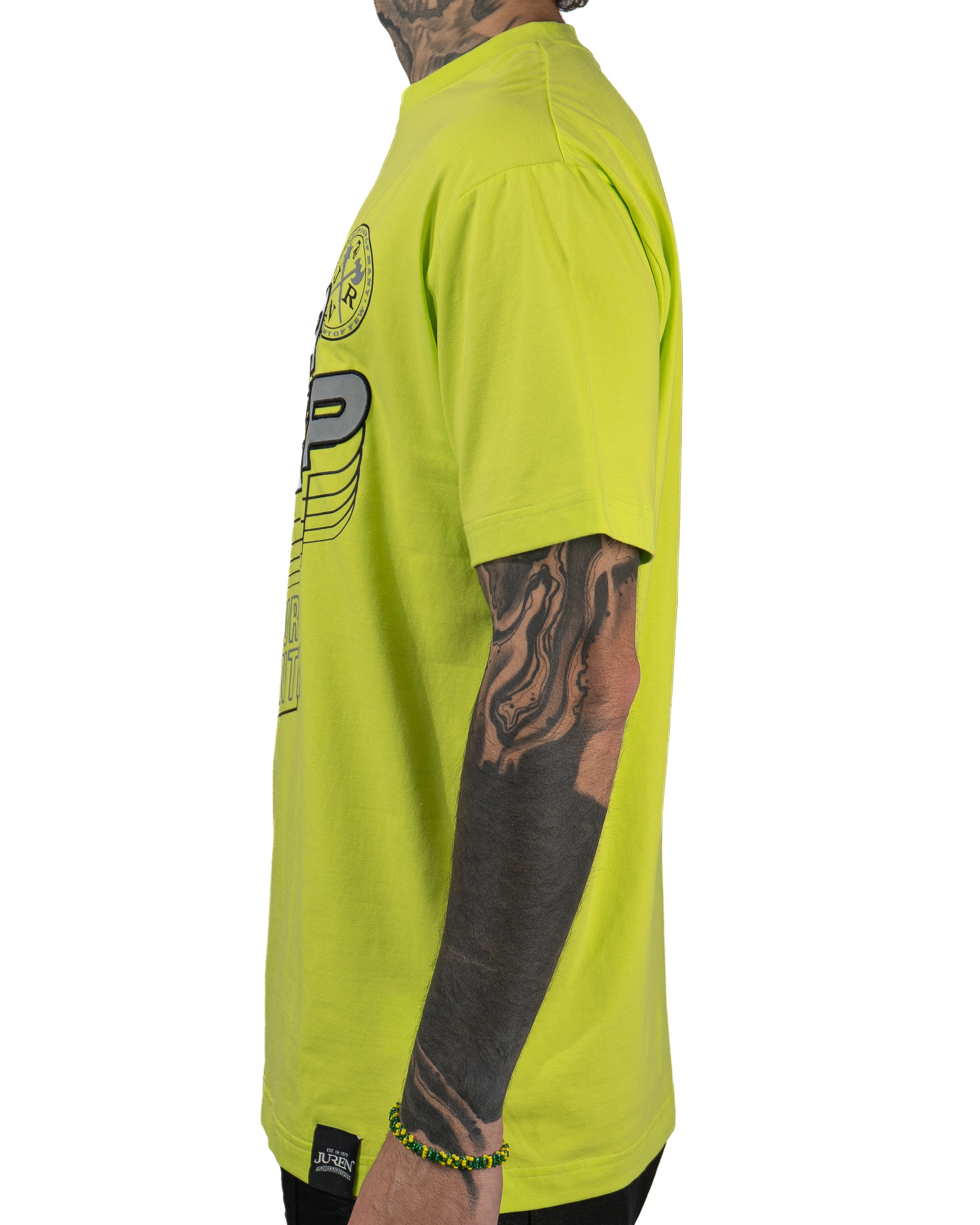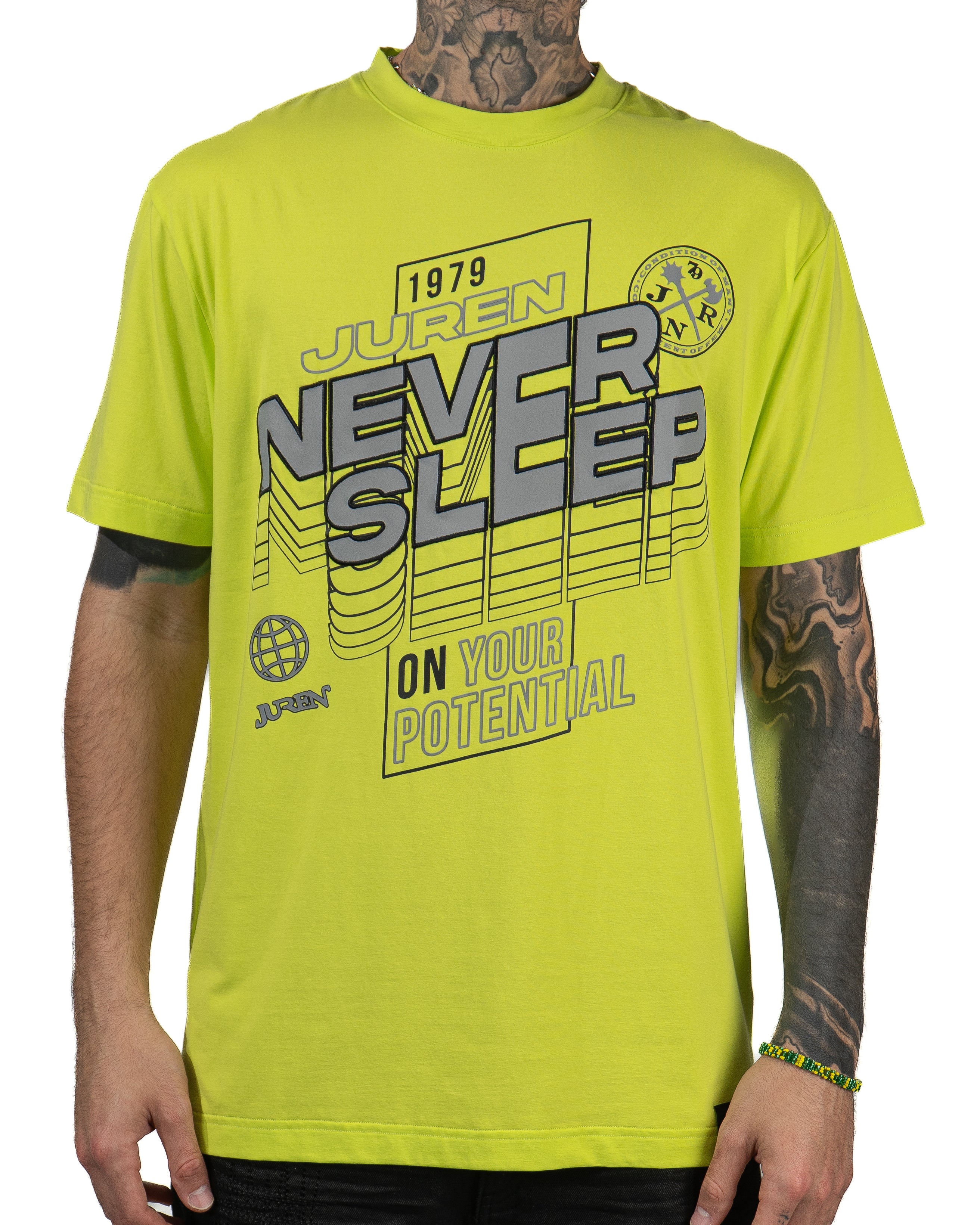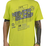 The "Never Sleep Neon Yellow Tee" design captures the essence of relentless energy and tireless pursuit. In the center of the tee, embroidered in vibrant chenille, is an intricate depiction of a sleek panther, its piercing eyes illuminated with a fiery intensity. The panther is depicted in mid-stride, muscles coiled with power, conveying a sense of perpetual motion and unwavering determination.