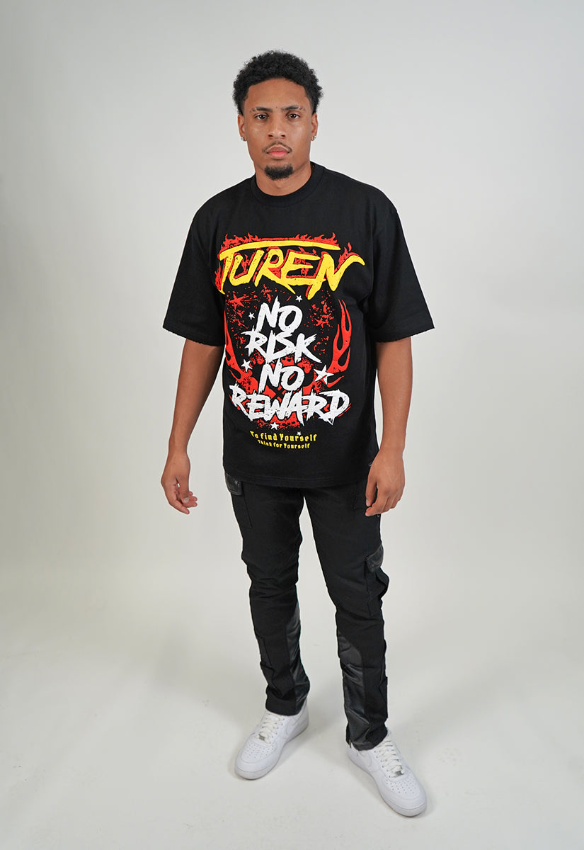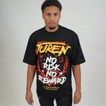 The No Risk No Rewards Black Shirt from Juren Clothing features a bold design that blends attitude and style. On the front, the classic Juren logo appears in sleek yellow, surrounded by vivid red flames that add dynamic energy and visual impact. The "No Risk No Reward" message is also encircled by the same striking red flames, emphasizing its empowering message. The back showcases a detailed skeleton rock hand symbol in White, reinforcing the shirt’s edgy, fearless spirit. Crafted with quality materials, this shirt is perfect for those who embrace challenge and confidence in their everyday wear.