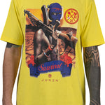 The "Survival Yellow Tee" features a striking image: an African warrior wearing a ski mask and brandishing an AK rifle. Set against the vibrant yellow fabric, this graphic embodies strength and resilience. Perfect for those who appreciate bold symbolism, this tee is a statement piece that commands attention. Wear it proudly as a symbol of survival and determination in the face of adversity.