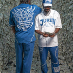 The True Prosperity T-Shirt in French Blue showcases a distinctive gray globe design featuring the Juren logo, symbolizing global ambition and success. Emblazoned with the phrase "The World's True Prosperity Comes to Those Who Strive," it inspires relentless pursuit of goals. The gray barbed wire print on the sleeves and back adds a bold, edgy element that emphasizes resilience and determination. Crafted with attention to detail, this shirt blends meaningful symbolism with contemporary style, making it an ideal choice for those who value both fashion and purpose.