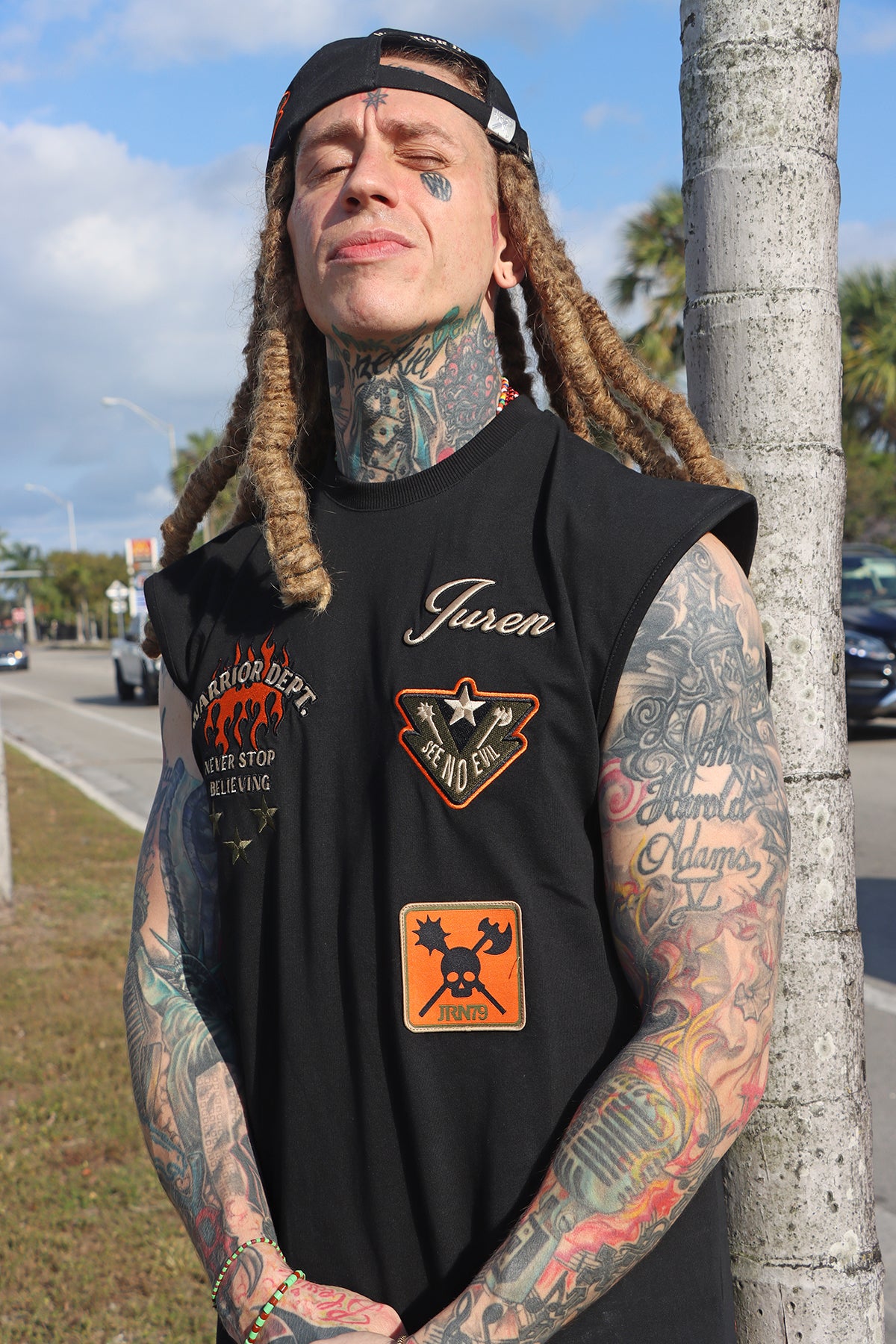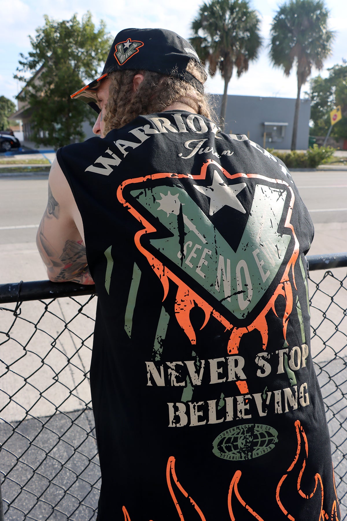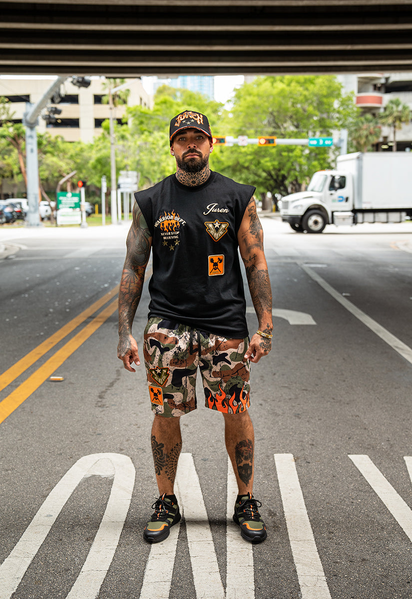 Warrior Dept. Muscle Tee Selected, Warrior Dept. Twill Pants, Sneakers and Trucker Hat Combo include: