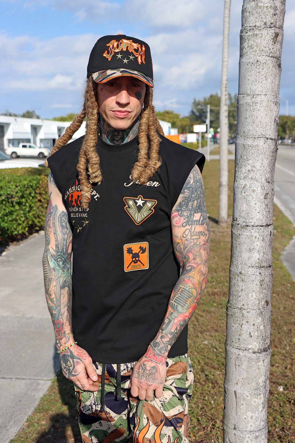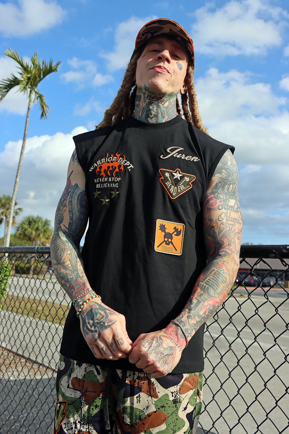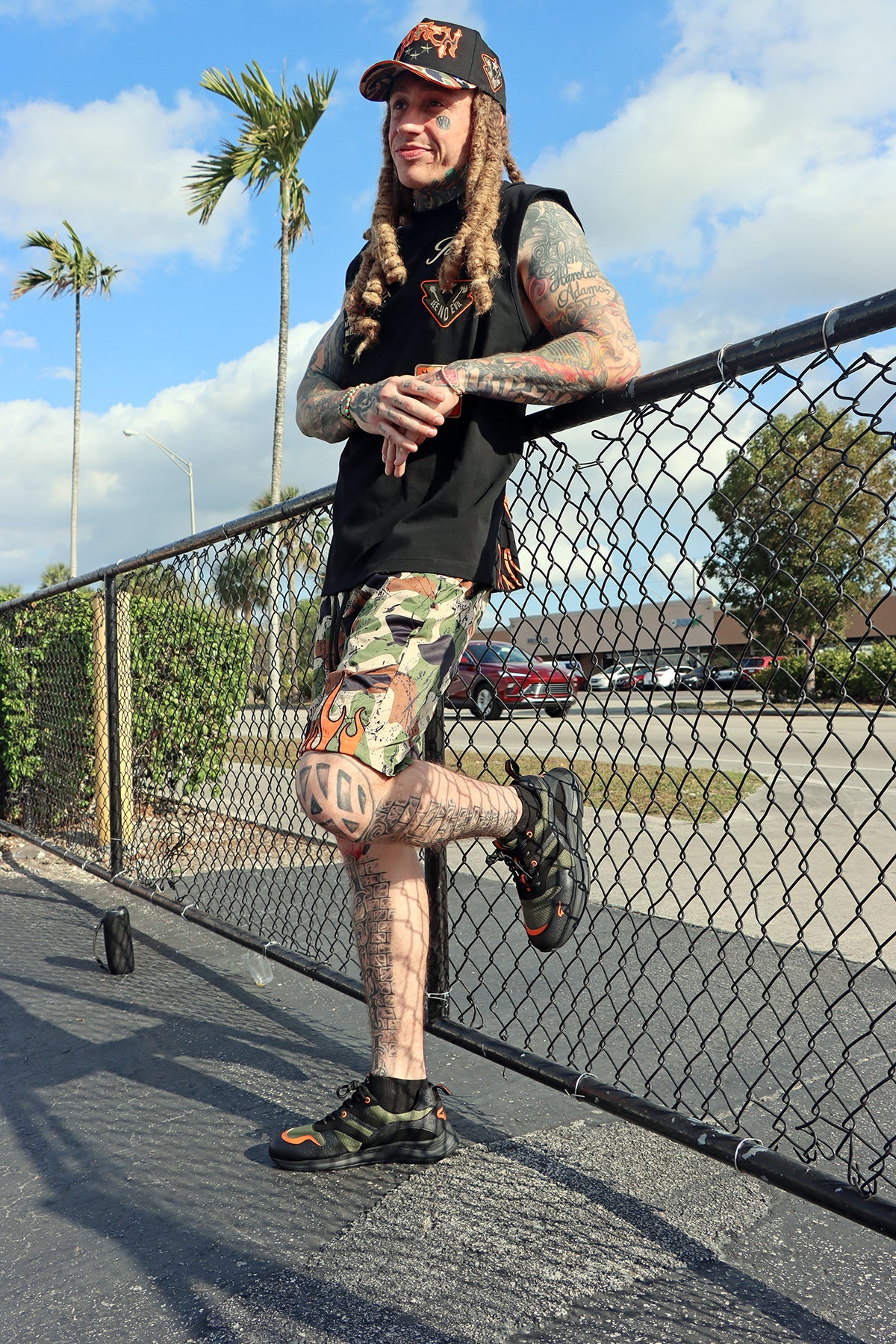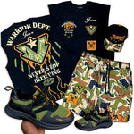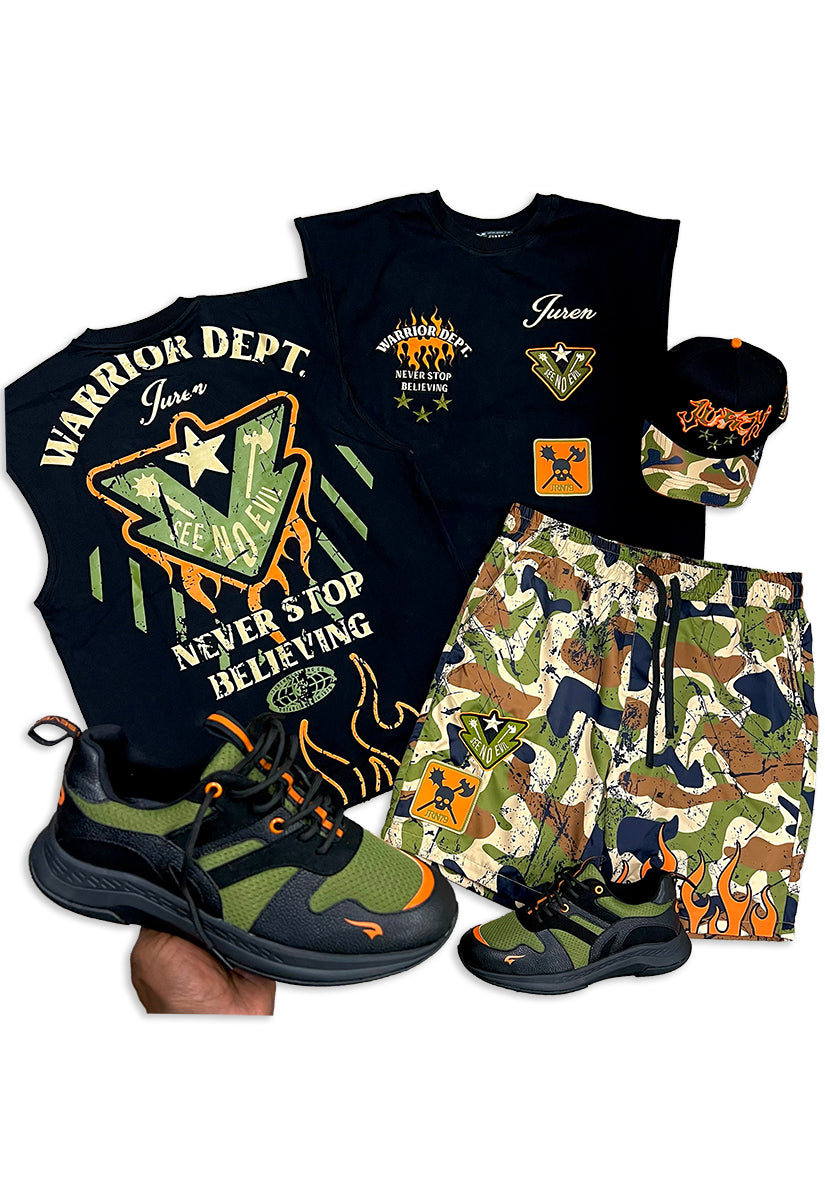 Warrior Dept. Muscle Tee, Warrior Dept. Camo Short, Sneakers and Trucker Hat Combo Included: