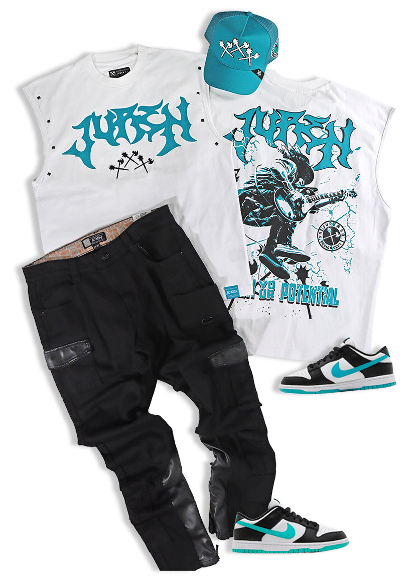 Warrior Dept. Muscle Tee Selected, Warrior Dept. Twill Pants, Sneakers and Trucker Hat Combo