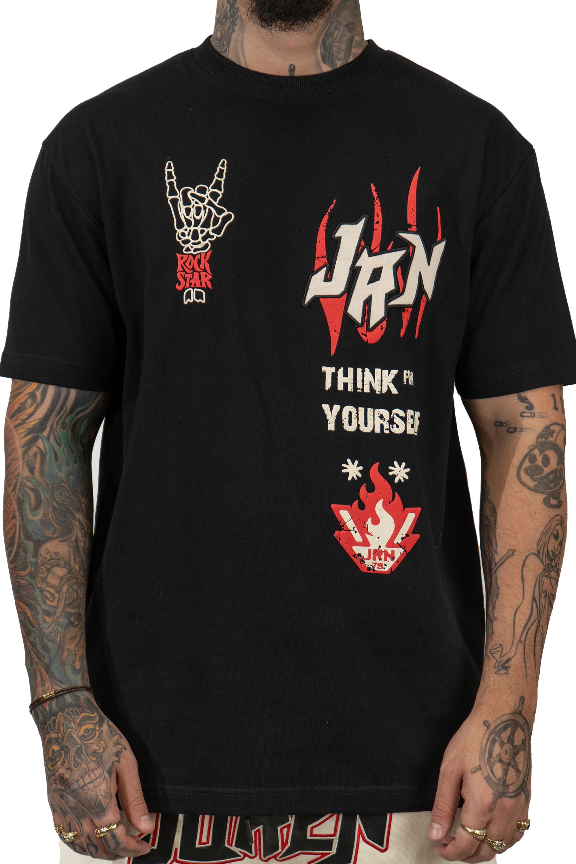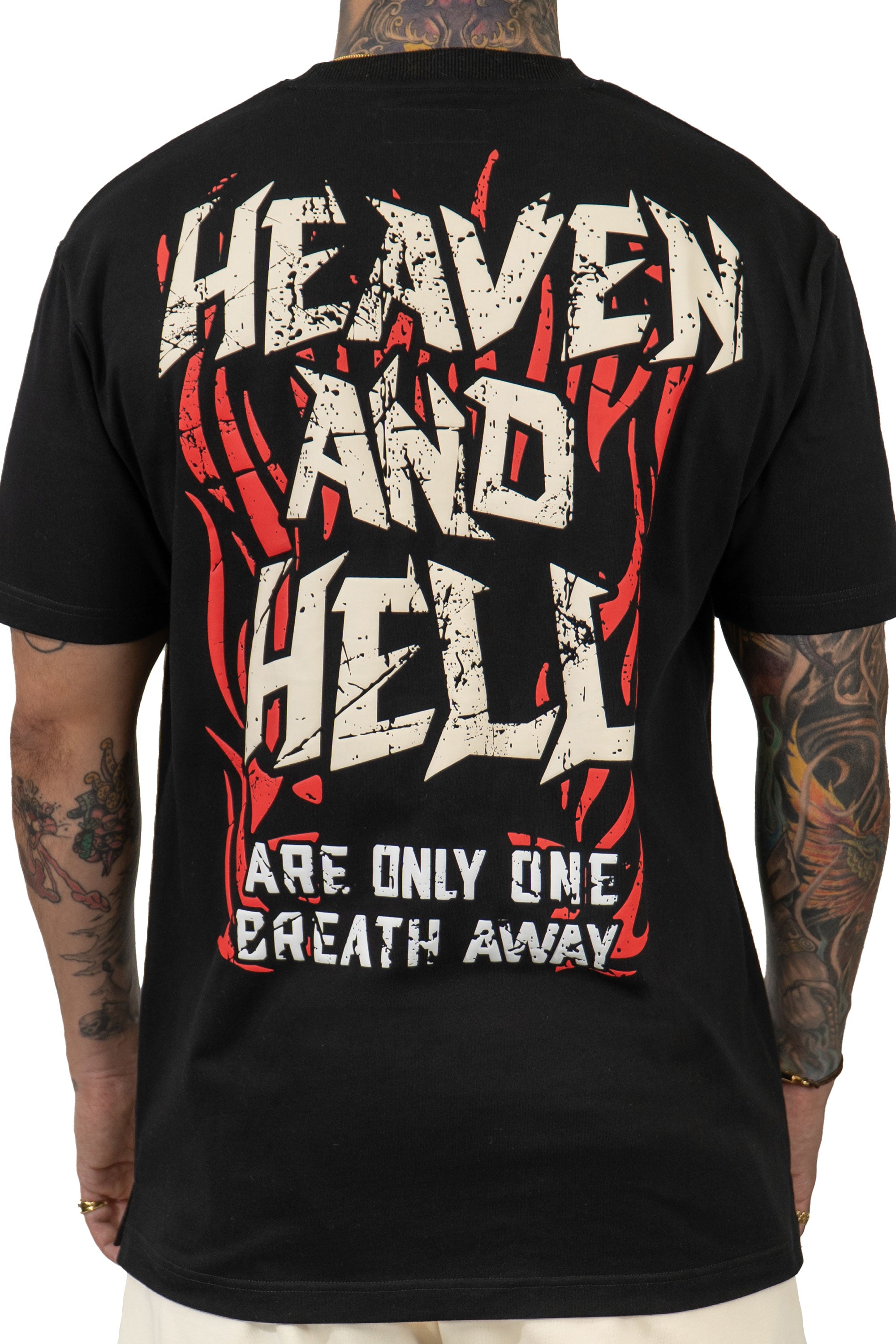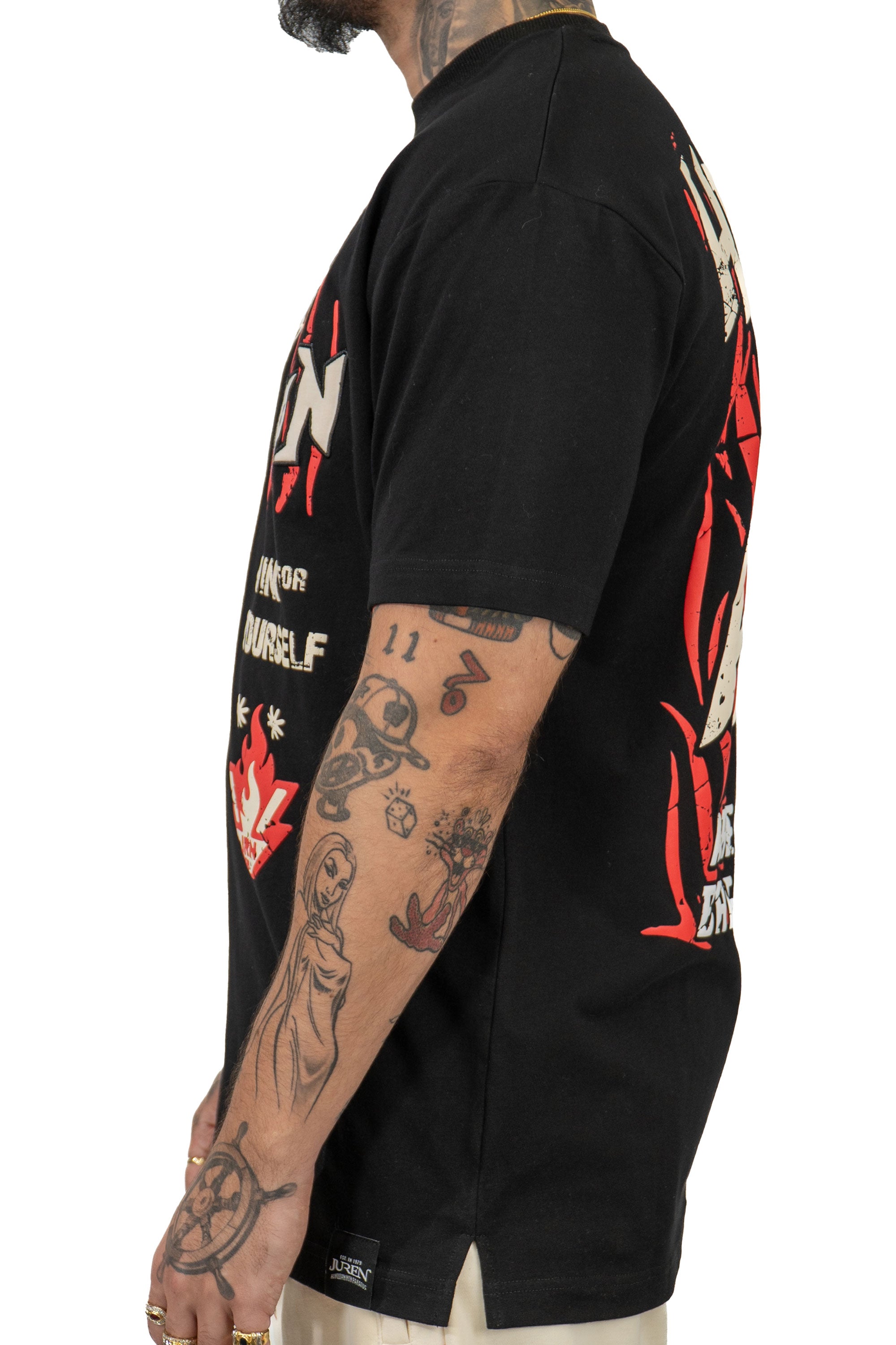 The Juren Heaven and Hell Tee Black embodies a rock star aesthetic with a bold design. The front features a large embroidered JRN monogram paired with the phrase "Think For Yourself," creating a rebellious and thought-provoking statement. On the back, "Heaven and Hell" is displayed in a big distressed puff print, with the poignant message "Heaven and Hell Are Only One Breath Away" in smaller puff print at the bottom. This tee combines powerful imagery and words, making it a standout piece for those who embrace individuality.