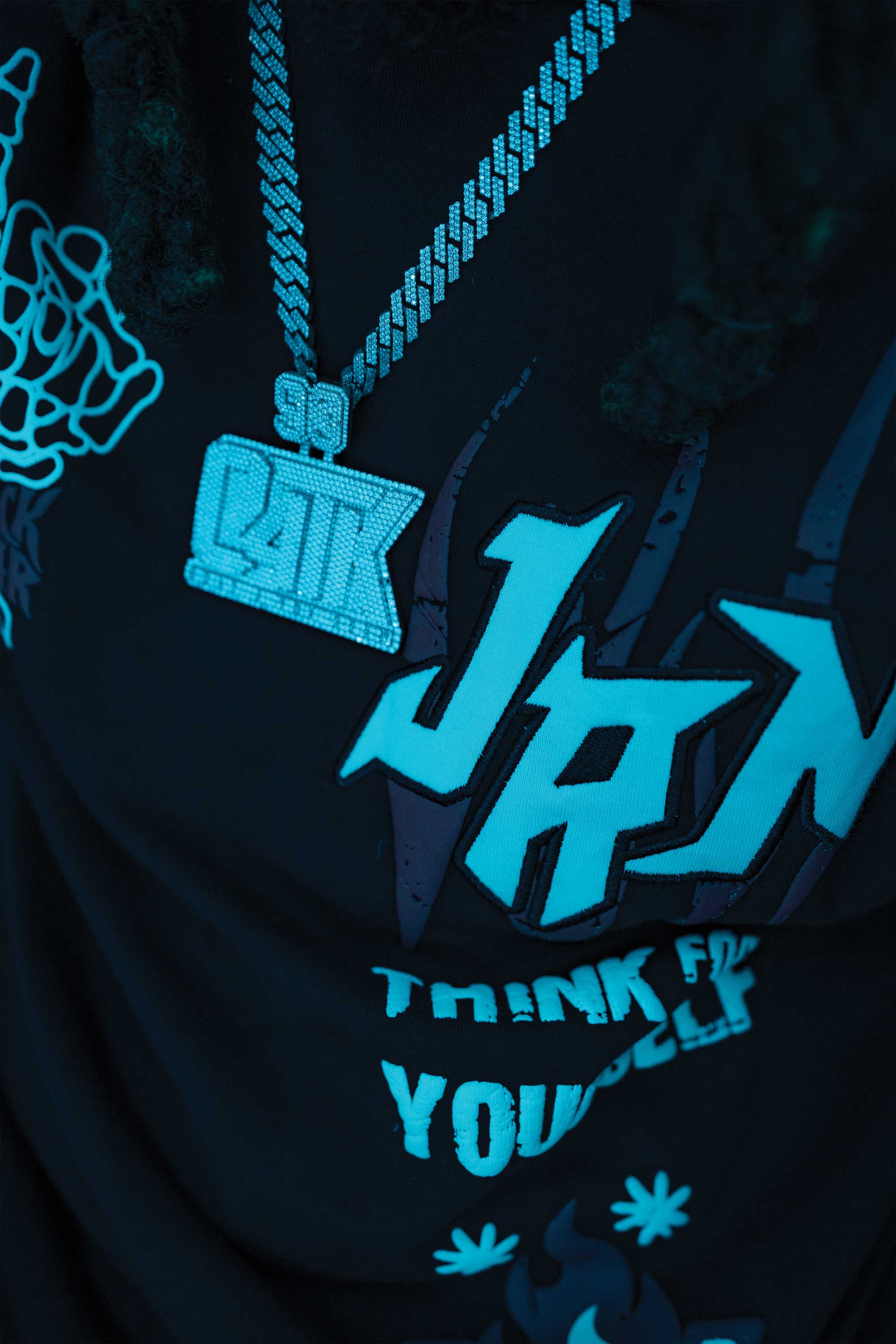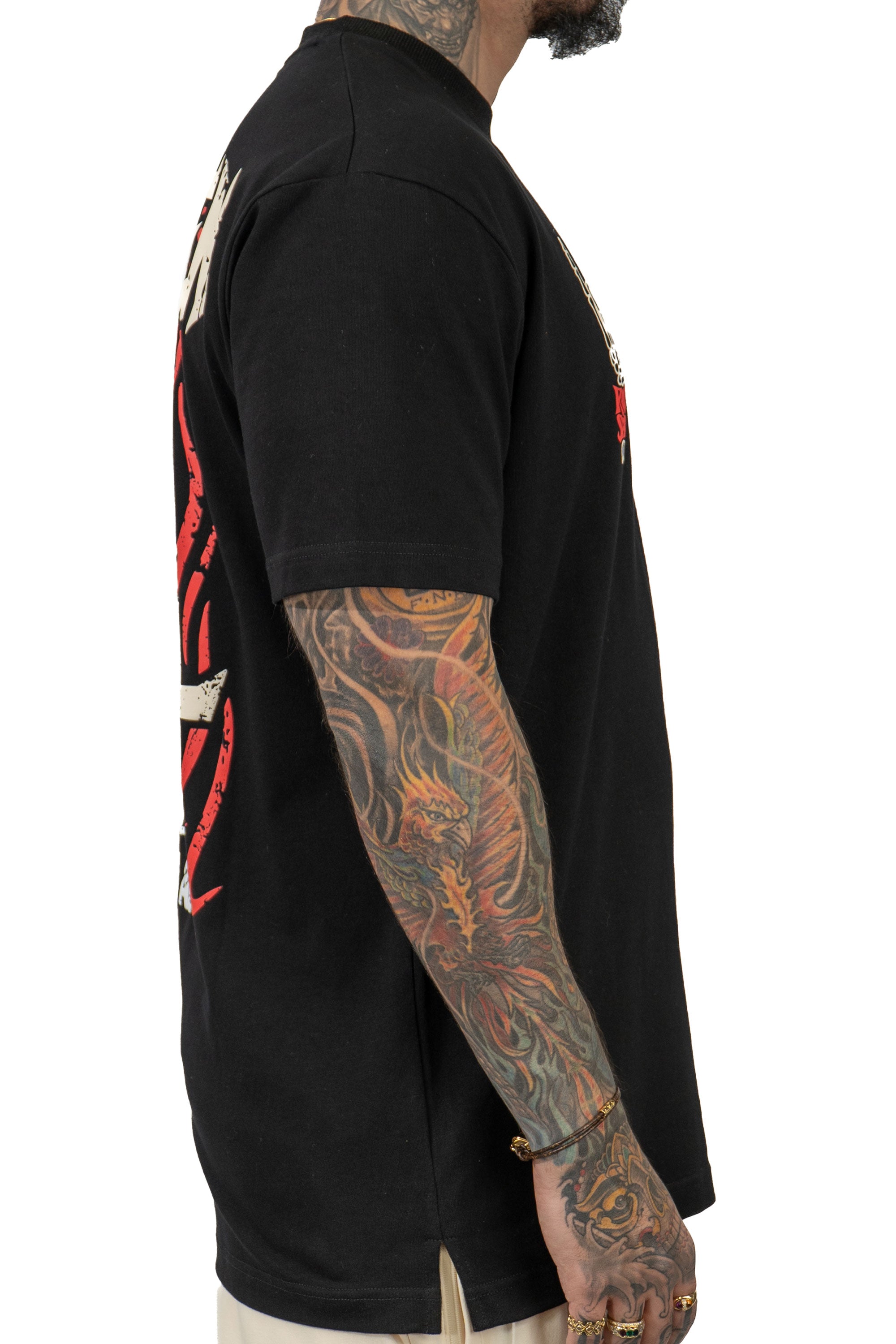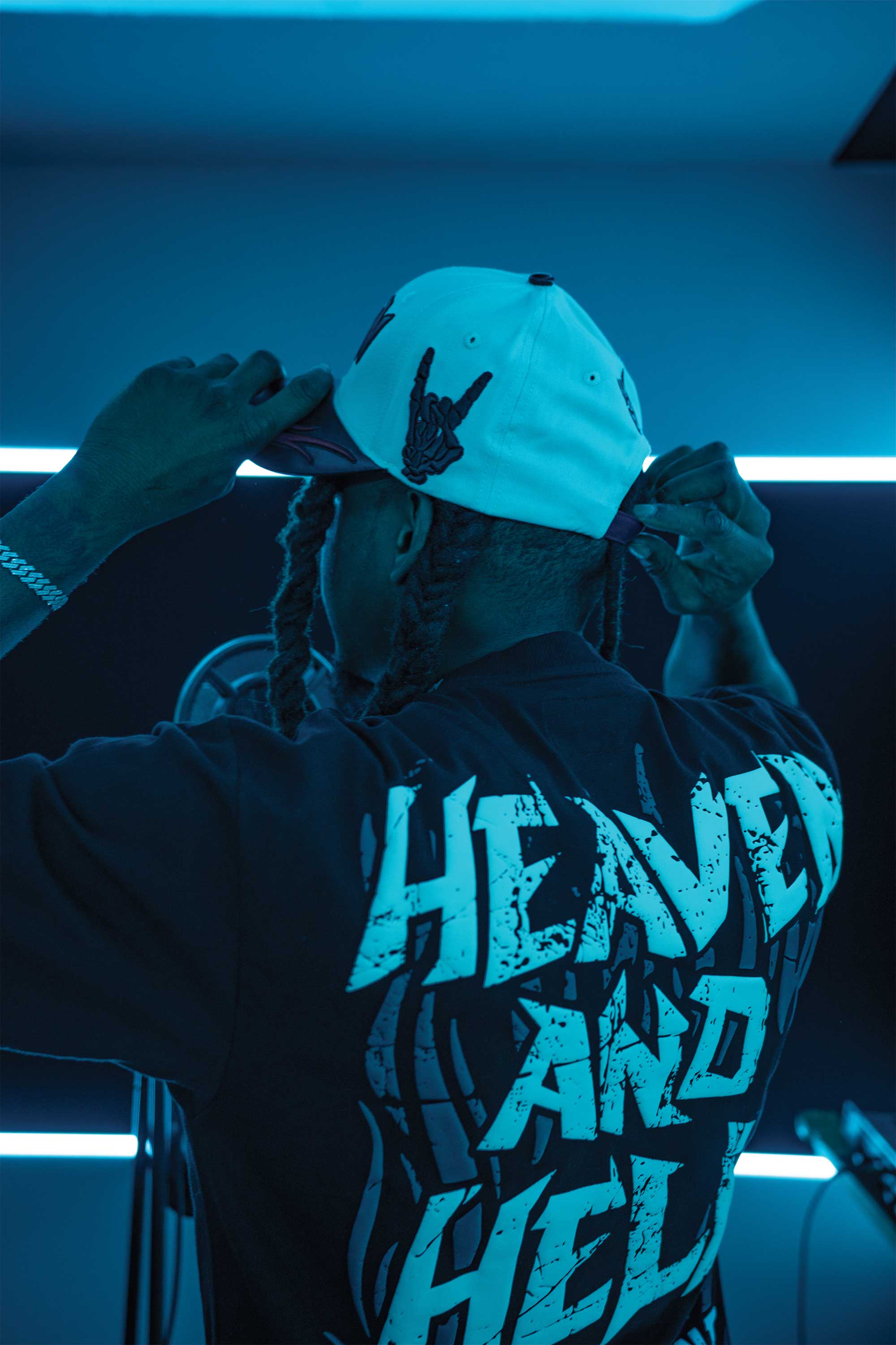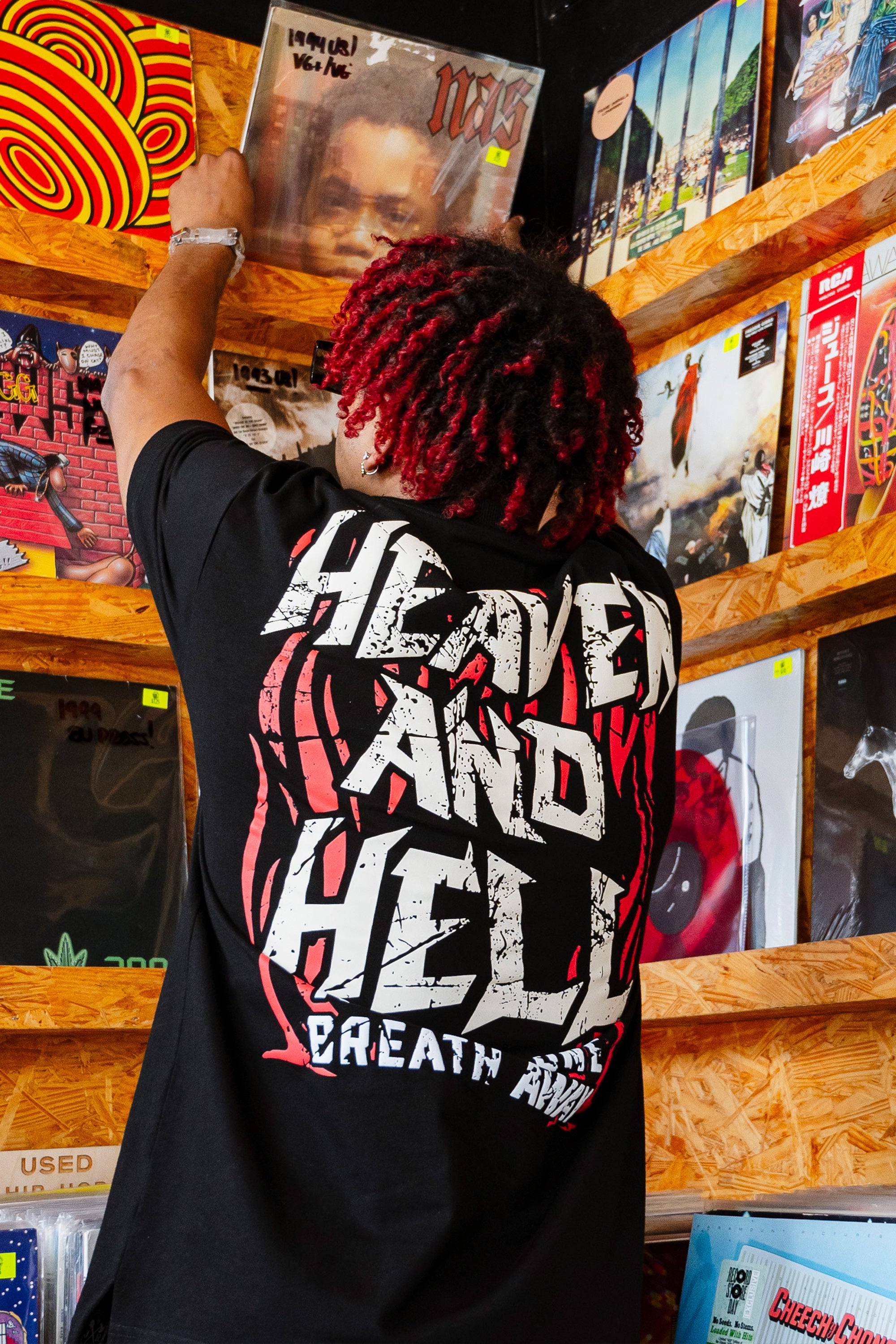 The Juren Heaven and Hell Tee Black embodies a rock star aesthetic with a bold design. The front features a large embroidered JRN monogram paired with the phrase "Think For Yourself," creating a rebellious and thought-provoking statement. On the back, "Heaven and Hell" is displayed in a big distressed puff print, with the poignant message "Heaven and Hell Are Only One Breath Away" in smaller puff print at the bottom. This tee combines powerful imagery and words, making it a standout piece for those who embrace individuality.