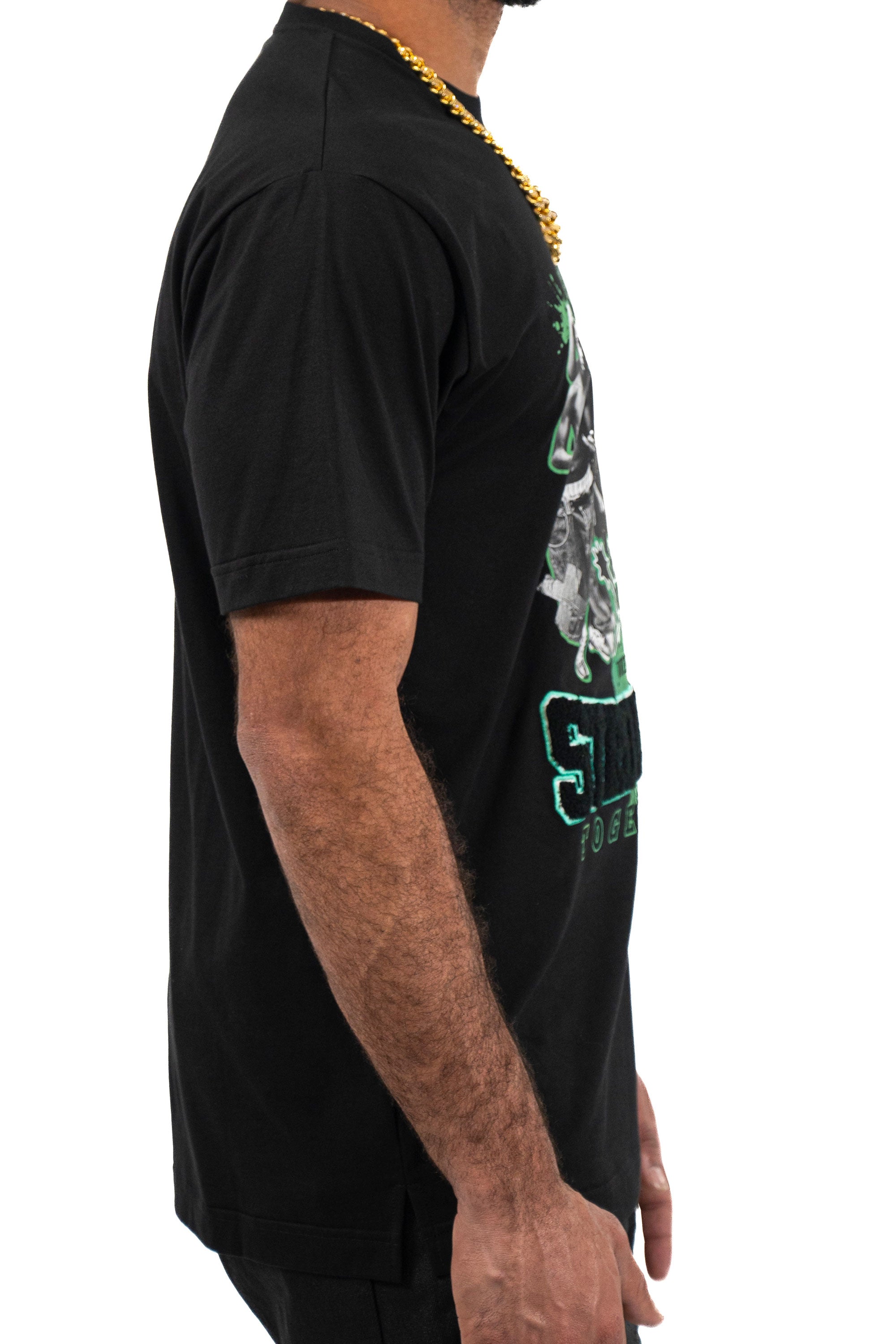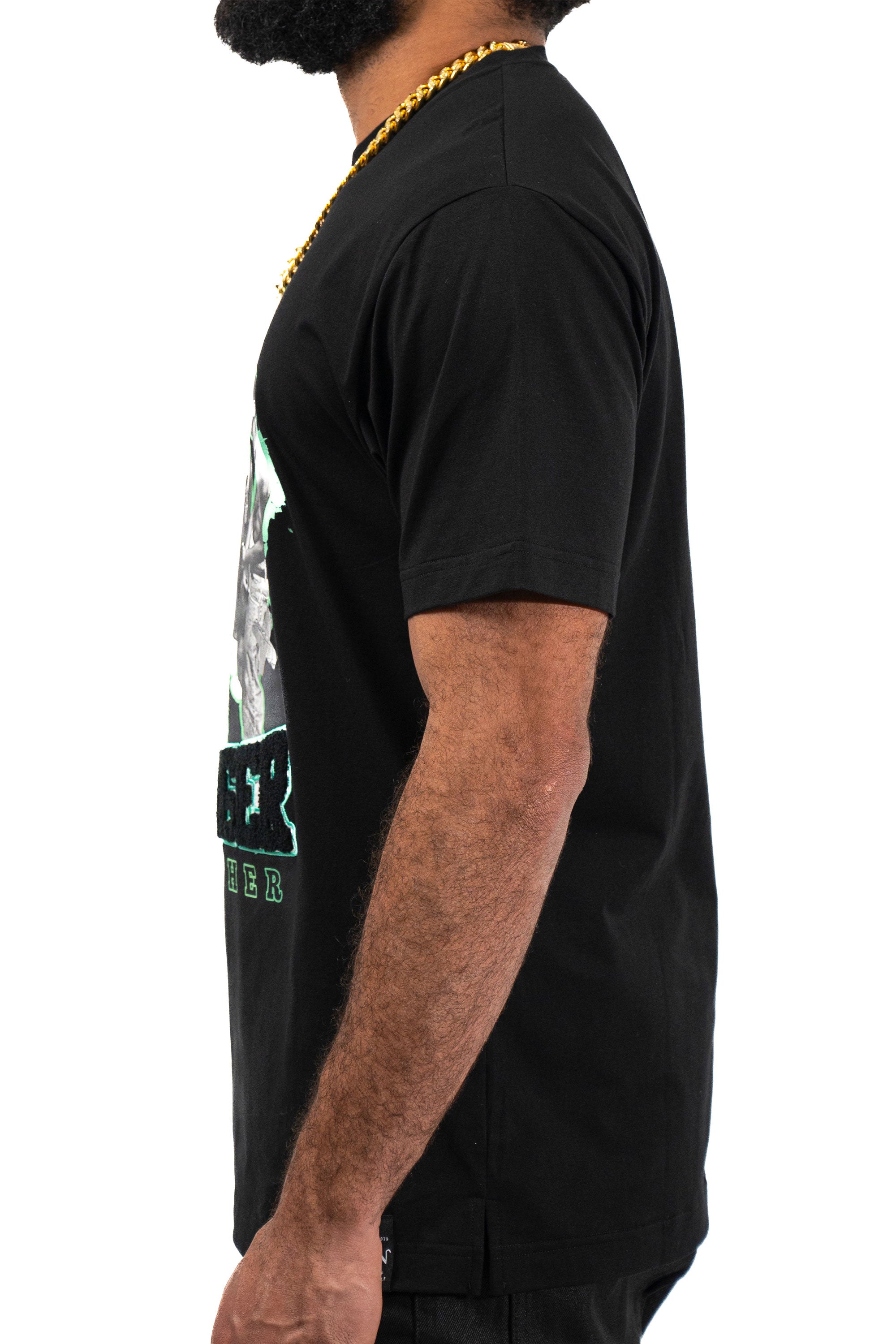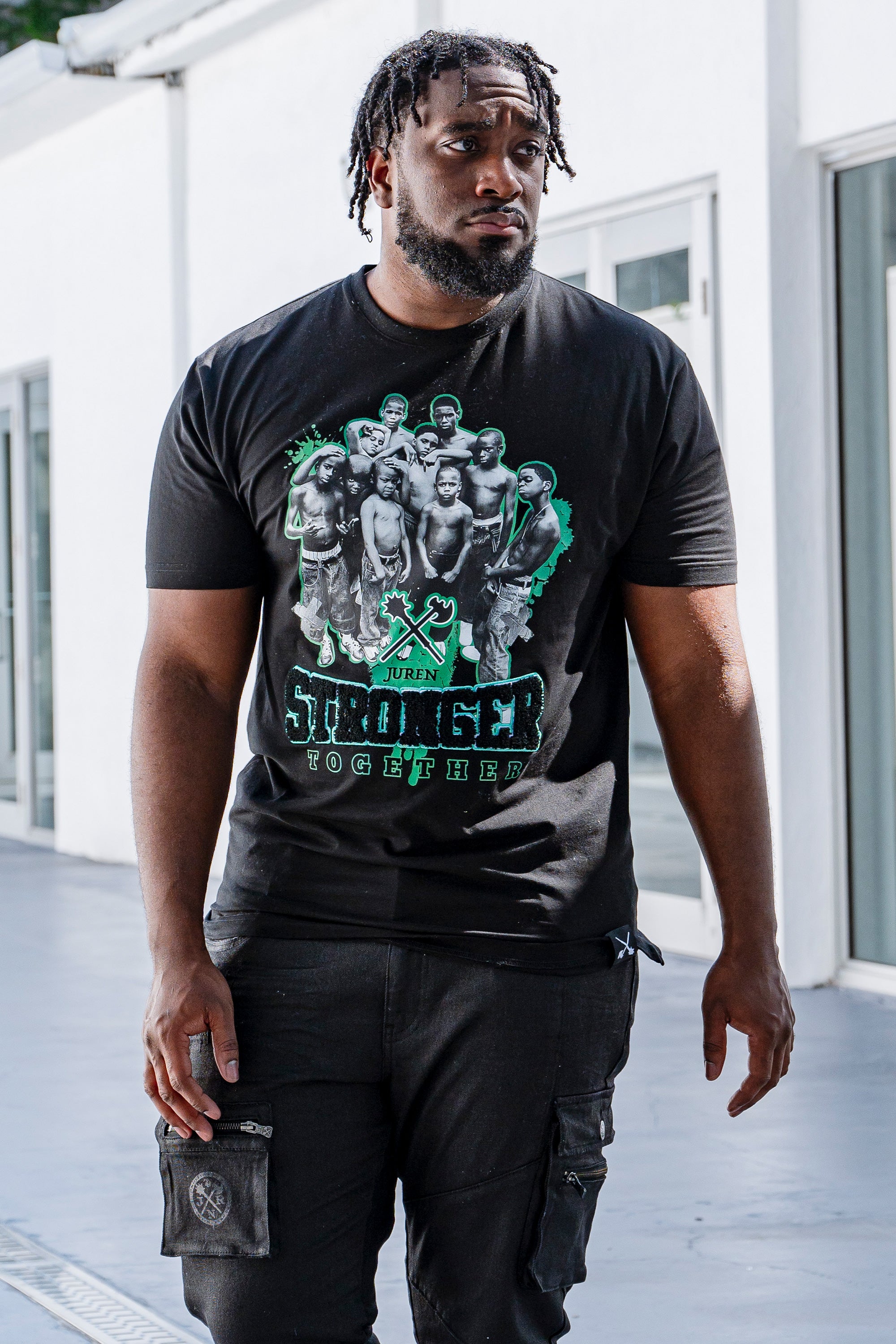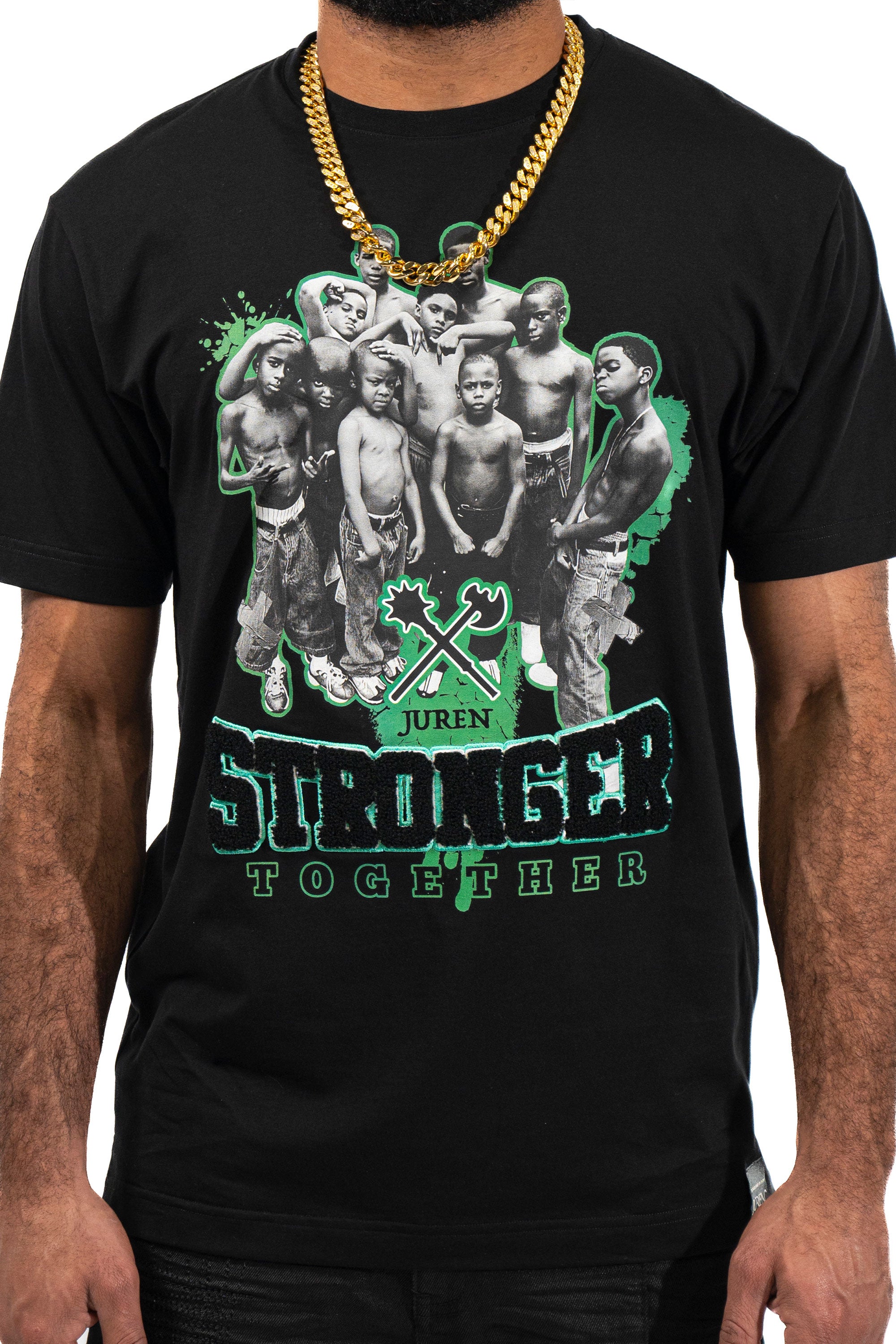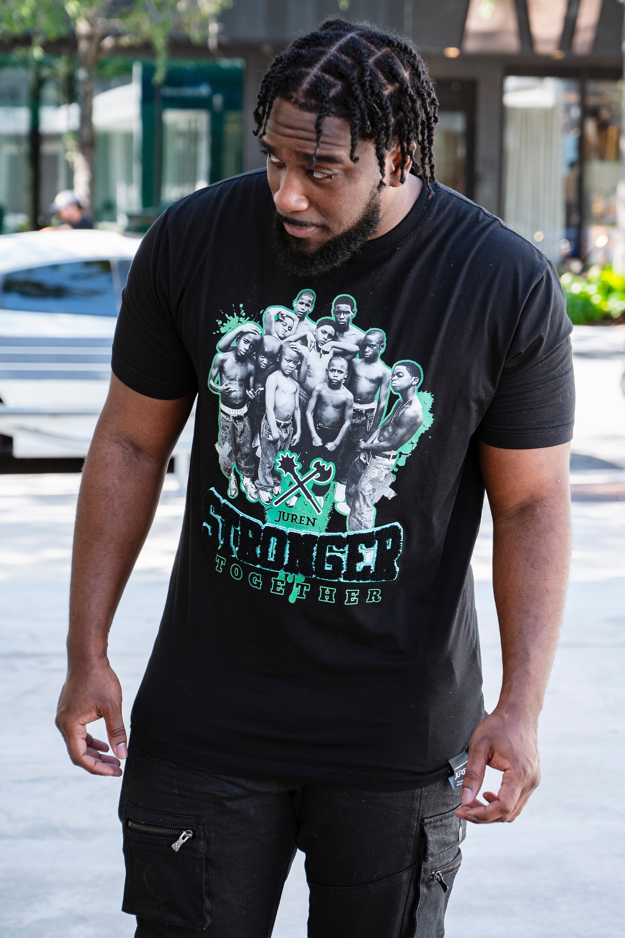 The Juren Stronger Together Embroidered Tee Black features a classic black fabric adorned with a group of young black kids standing together. The phrase "Stronger Together" is highlighted, with "stronger" rendered in plush chenille fabric and outlined with embroidery for added texture, while "together" is printed on. This tee celebrates unity and strength with a blend of tactile and printed elements, making it a powerful addition to any wardrobe.