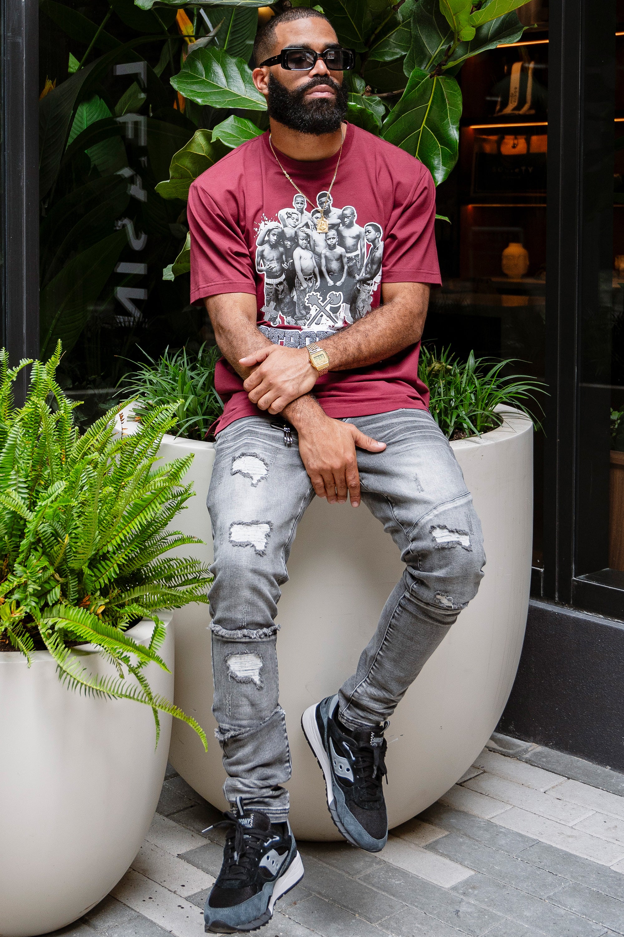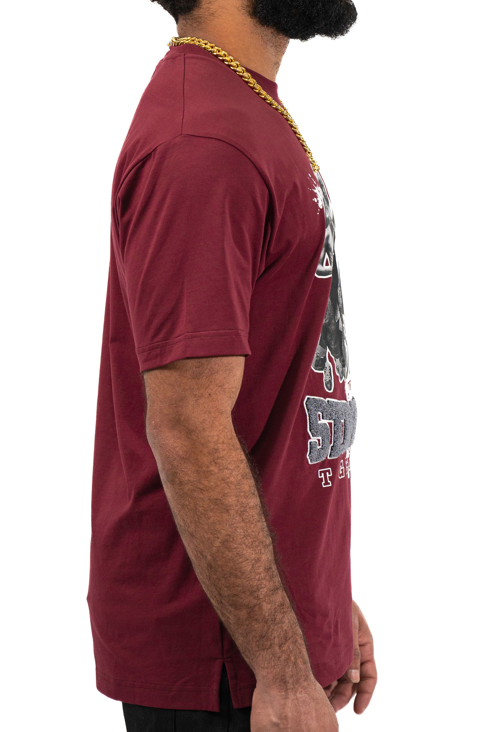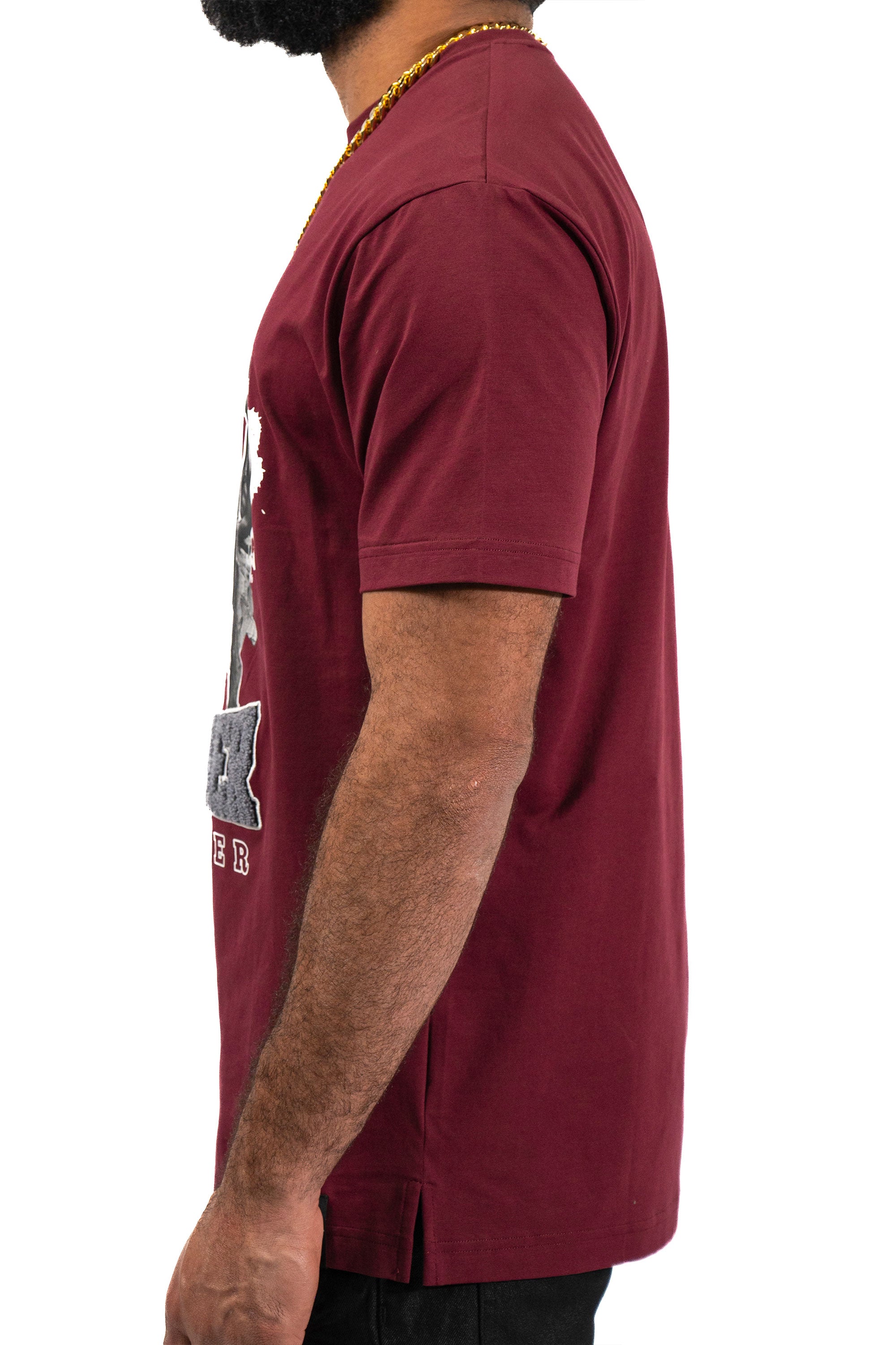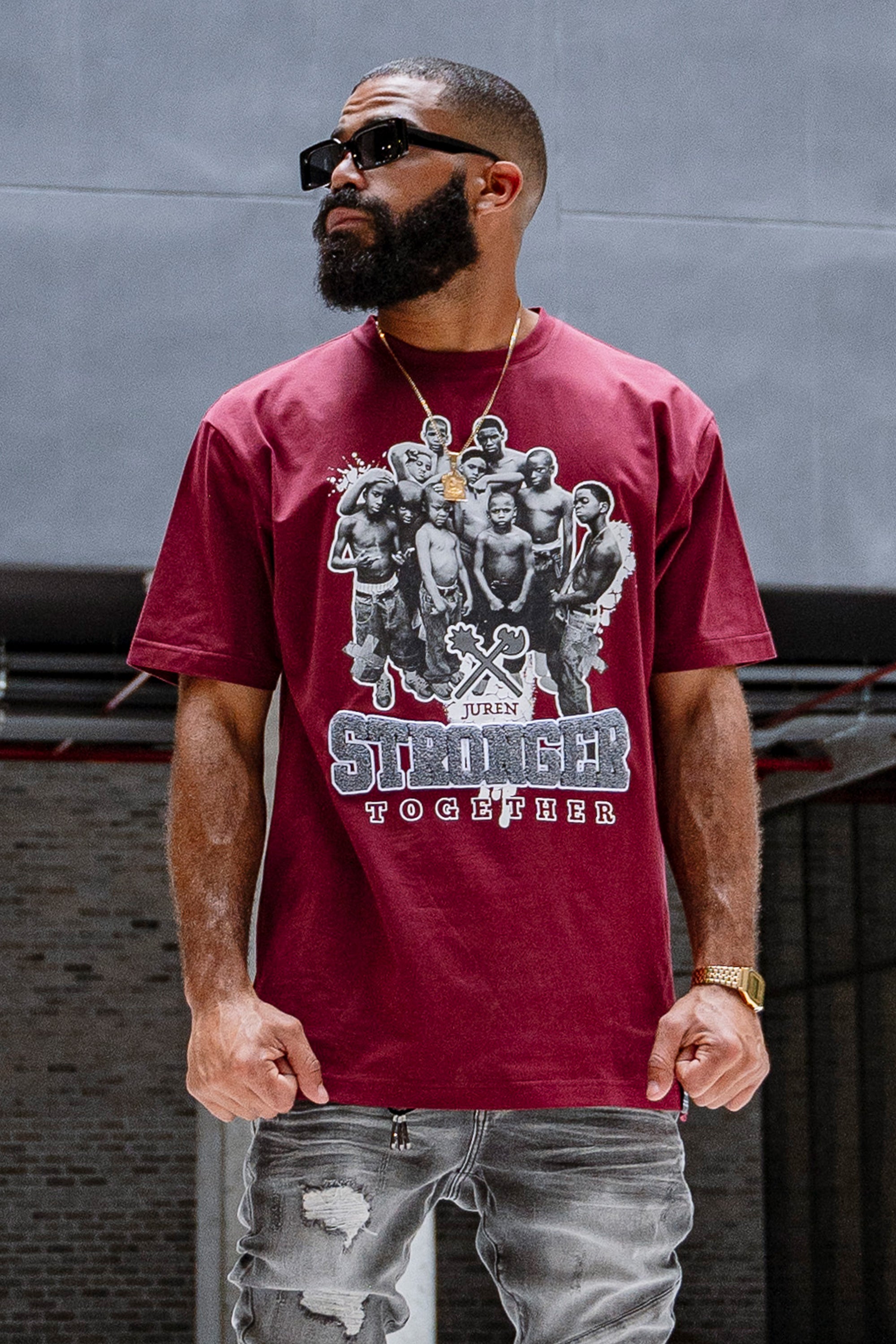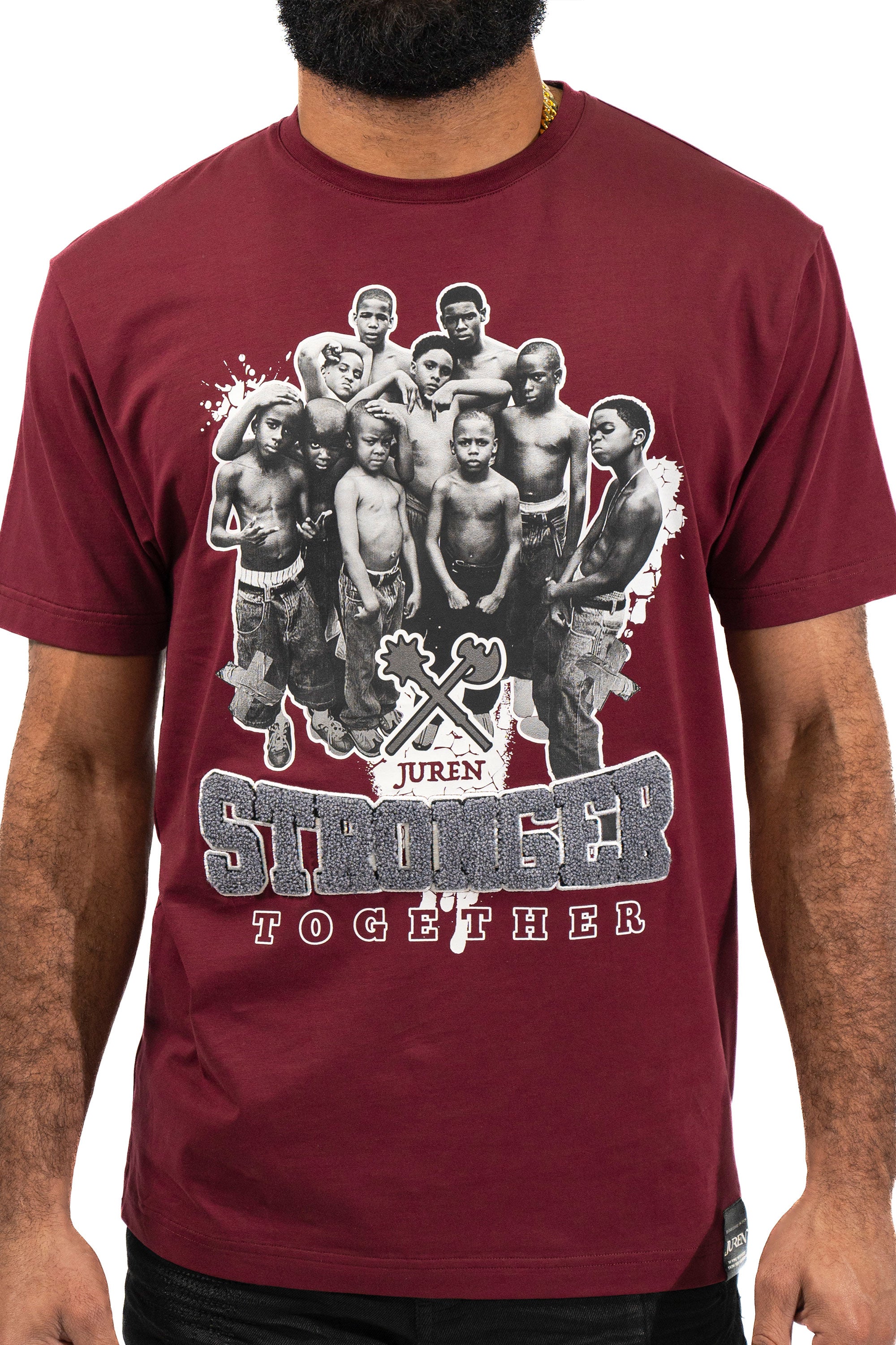 The Juren Stronger Together Embroidered Burgundy Tee showcases a deep burgundy hue adorned with a group of young black kids standing together. The phrase "Stronger Together" is highlighted, with "stronger" rendered in plush chenille fabric and outlined with embroidery for added texture, while "together" is printed on. This tee celebrates unity and strength with a blend of tactile and printed elements, making it a powerful addition to any wardrobe.