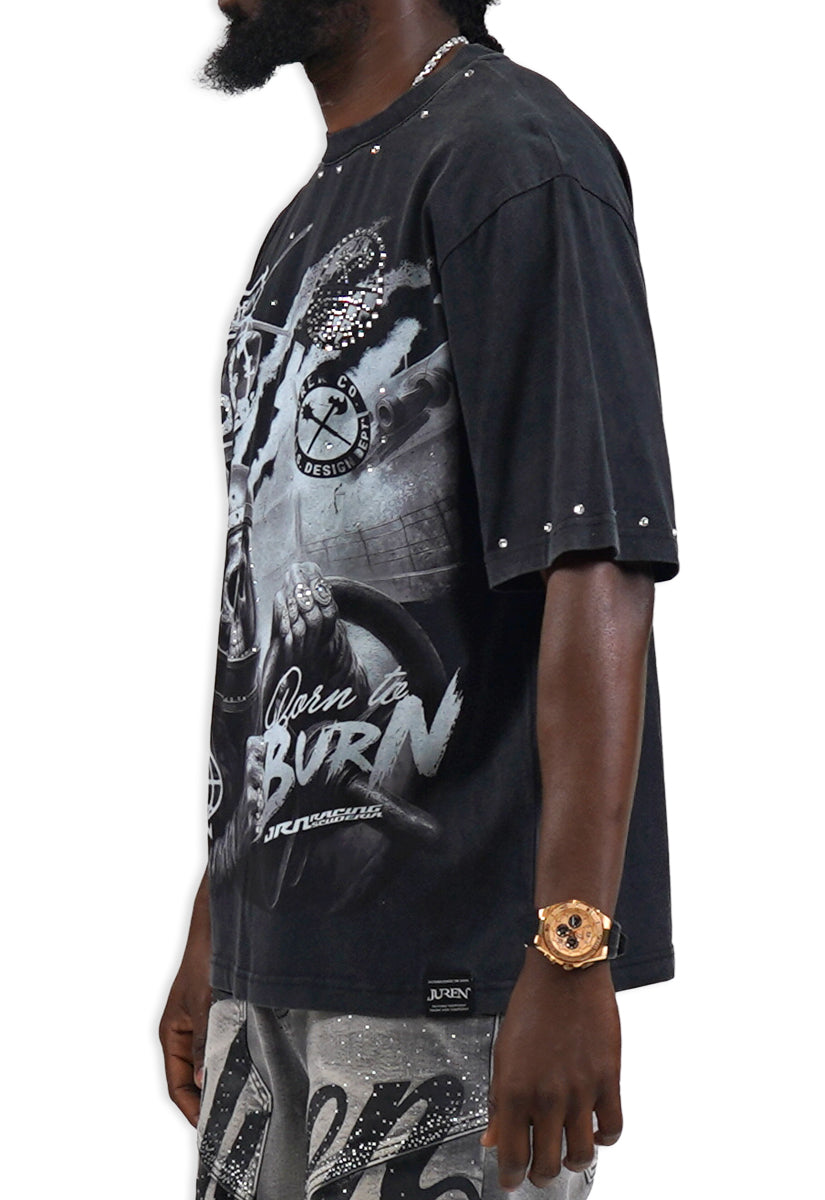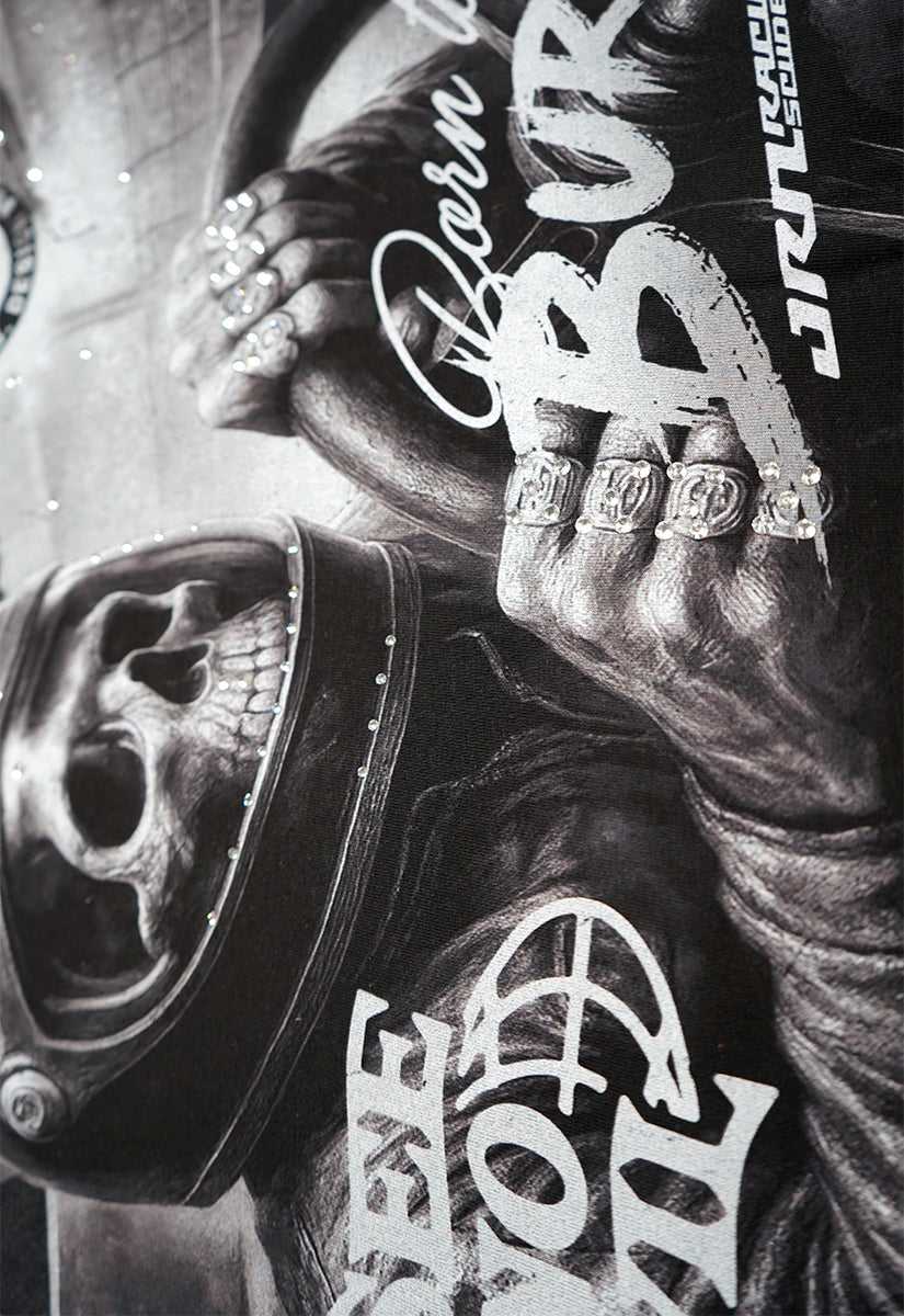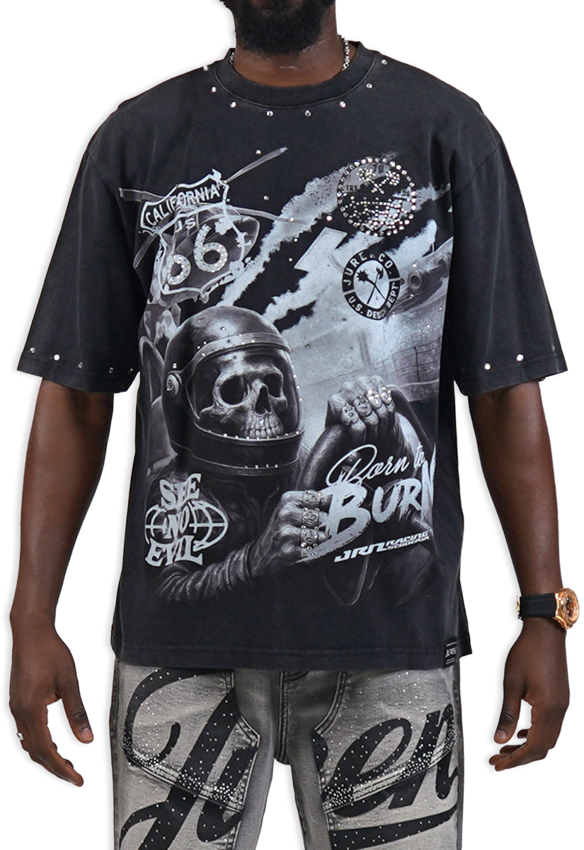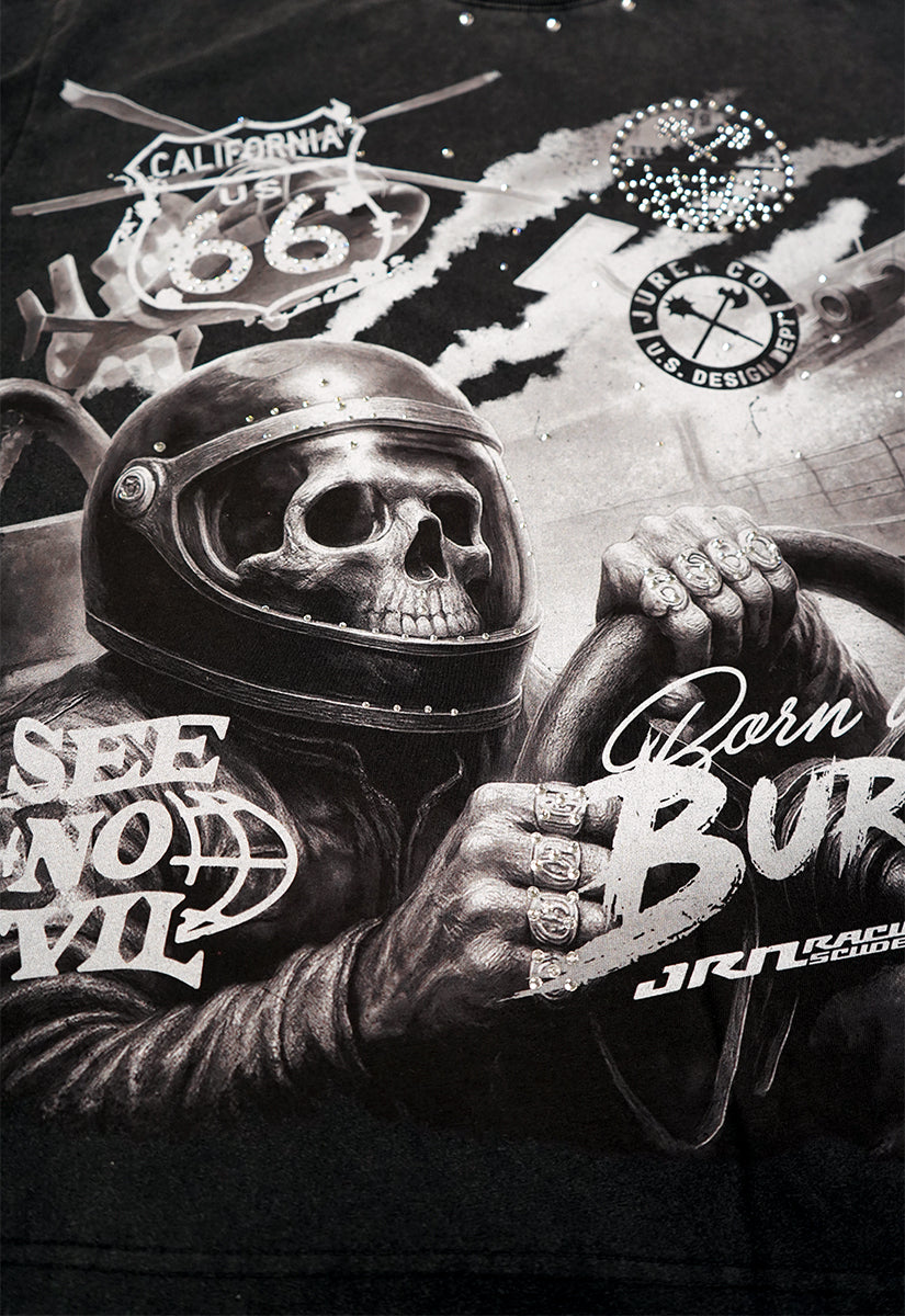 Born to Burn Washed Black Shirt This premium black wash shirt showcases an intricate design narrative that appeals to automotive enthusiasts and bold fashion statements. The front features a dynamic skull race car driver gripping a steering wheel, complemented by the iconic California Route 66 emblem and a helicopter silhouette overhead. The "Born to Burn" and "See No Evil" messaging establishes an edgy aesthetic that resonates with those who embrace high-octane lifestyle imagery. Crafted with meticulous embellishment, the design incorporates white rhinestones outlining the "66" numeral and skull helmet, creating striking visual contrast against the black fabric. The Juren globe logo appears on the upper left chest in matching white rhinestones, while white rhinestone accents frame the collar and sleeve hems for refined detailing. The back panel commands attention with an oversized "Born to Burn" graphic, where the word "Burn" is highlighted in white rhinestones. The JRN racing logos at the base complete the design in white screen printing, tying together a cohesive racing-inspired narrative. This shirt merges streetwear attitude with quality craftsmanship, making it an ideal choice for those seeking distinctive apparel that tells a story through bold graphics and premium embellishment.