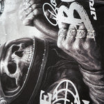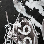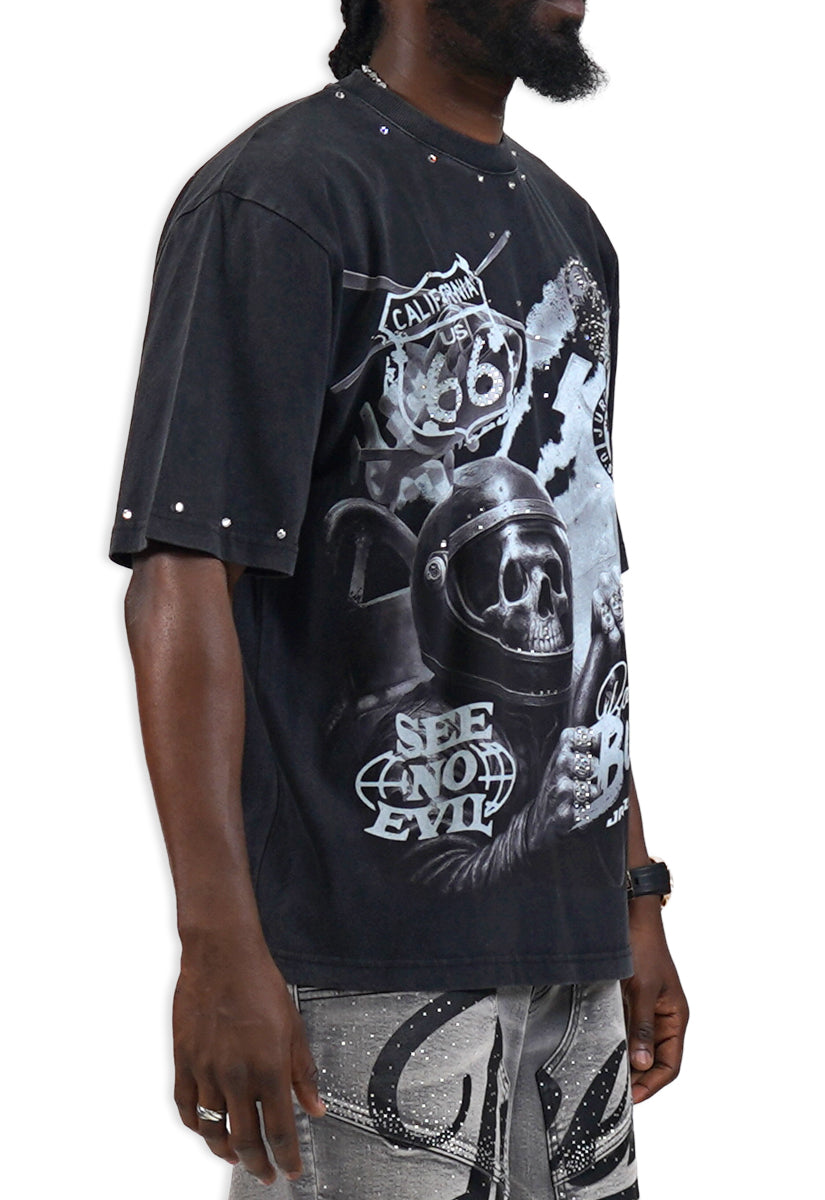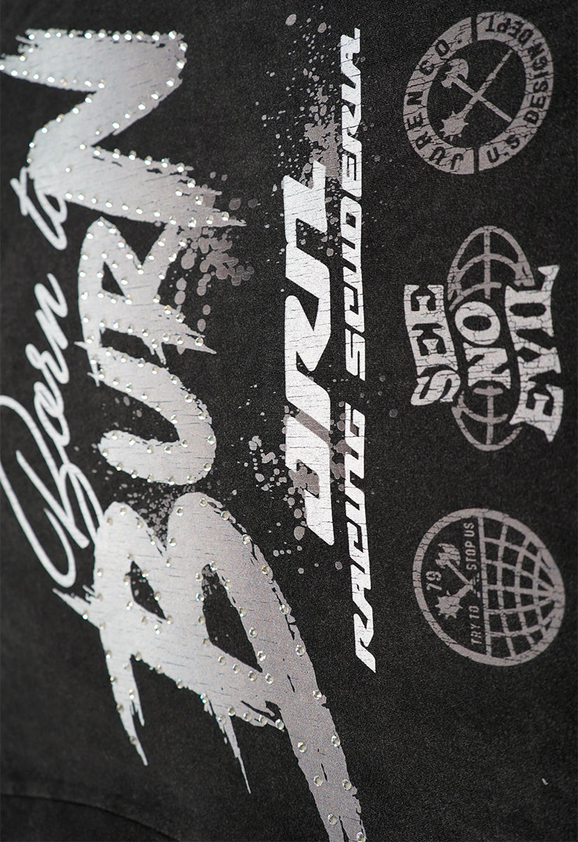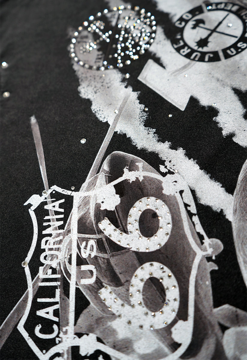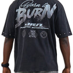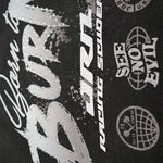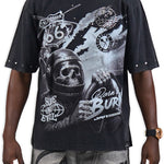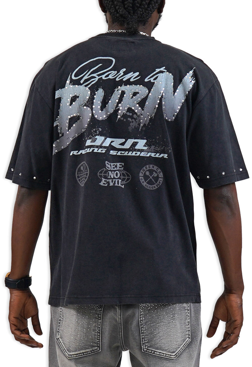 Born to Burn Washed Black Shirt This premium black wash shirt showcases an intricate design narrative that appeals to automotive enthusiasts and bold fashion statements. The front features a dynamic skull race car driver gripping a steering wheel, complemented by the iconic California Route 66 emblem and a helicopter silhouette overhead. The "Born to Burn" and "See No Evil" messaging establishes an edgy aesthetic that resonates with those who embrace high-octane lifestyle imagery. Crafted with meticulous embellishment, the design incorporates white rhinestones outlining the "66" numeral and skull helmet, creating striking visual contrast against the black fabric. The Juren globe logo appears on the upper left chest in matching white rhinestones, while white rhinestone accents frame the collar and sleeve hems for refined detailing. The back panel commands attention with an oversized "Born to Burn" graphic, where the word "Burn" is highlighted in white rhinestones. The JRN racing logos at the base complete the design in white screen printing, tying together a cohesive racing-inspired narrative. This shirt merges streetwear attitude with quality craftsmanship, making it an ideal choice for those seeking distinctive apparel that tells a story through bold graphics and premium embellishment.