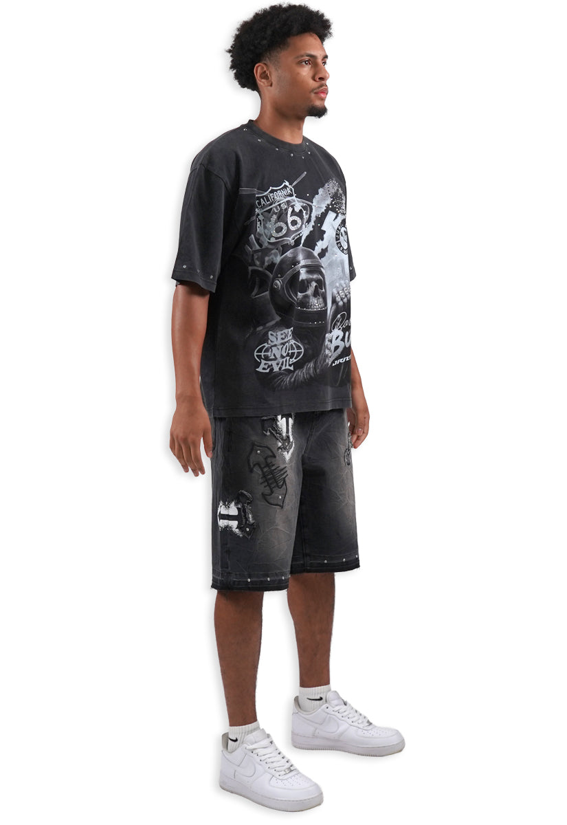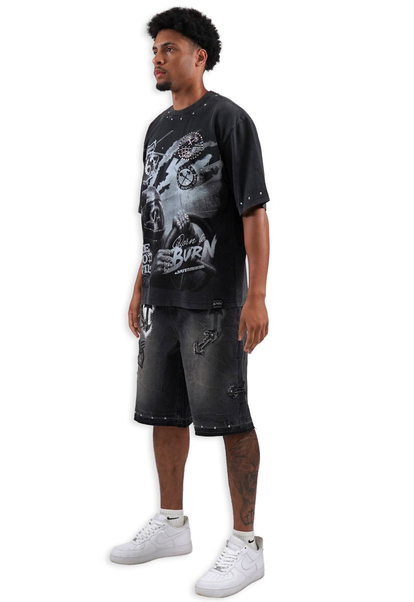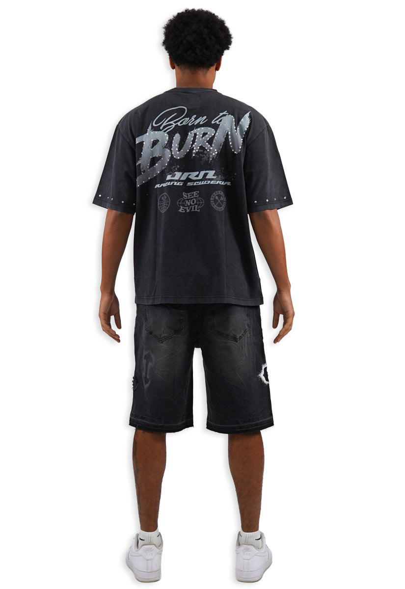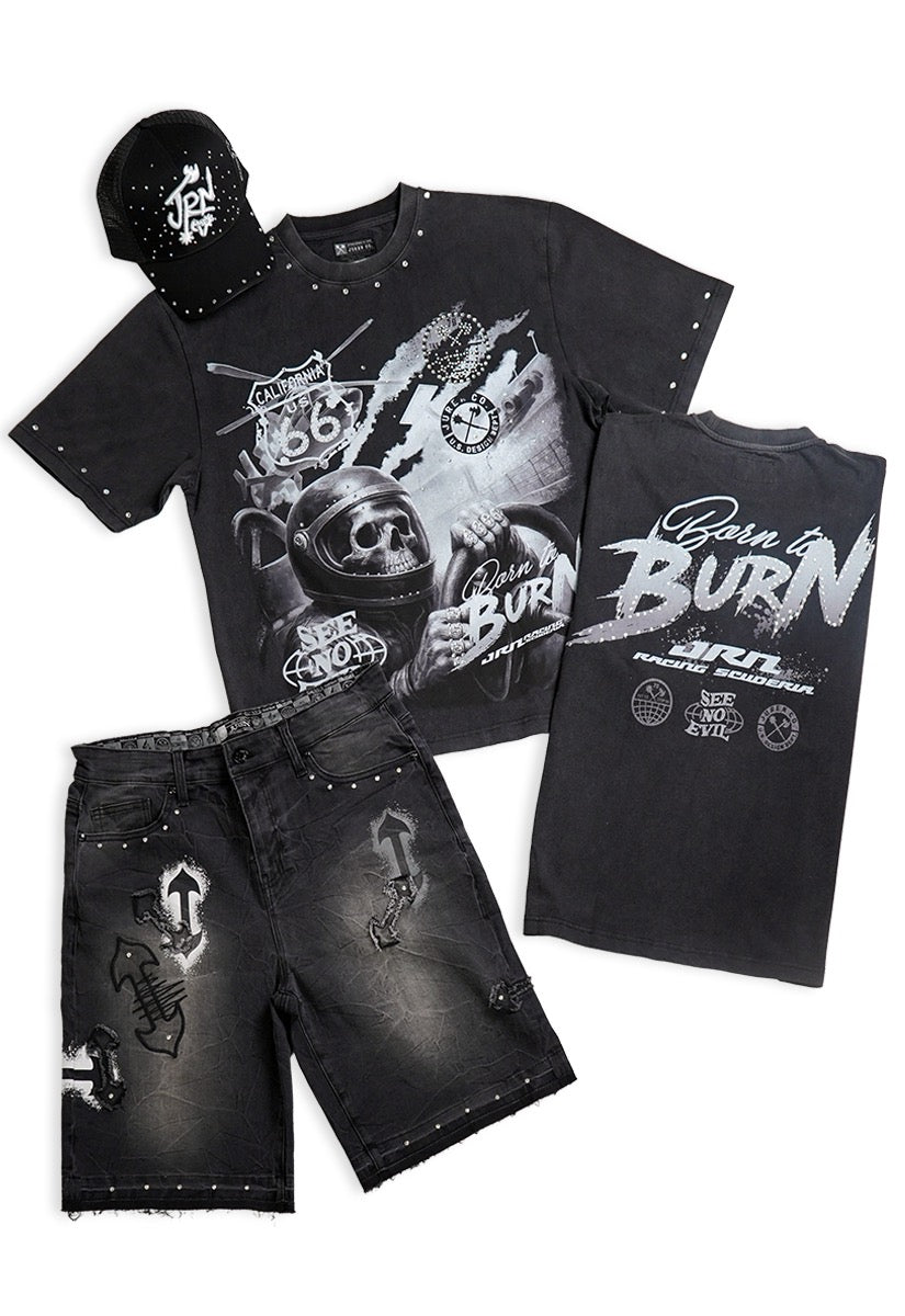 Born to Burn Washed Black Shirt - Rhinestones, Denim Jeans and Trucker Hat Combo