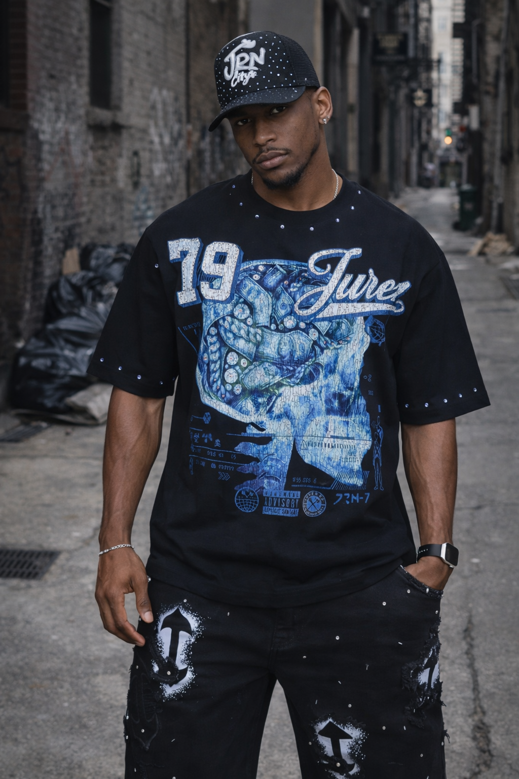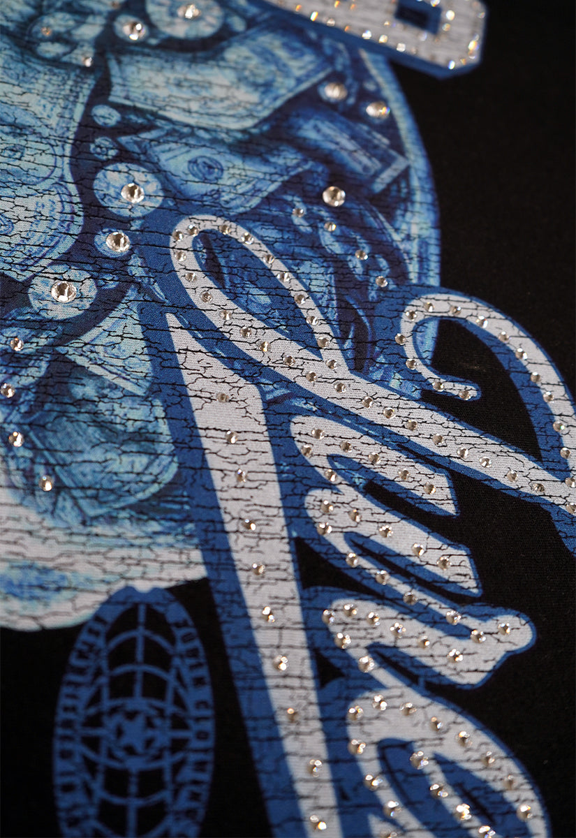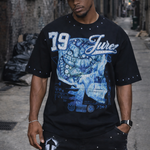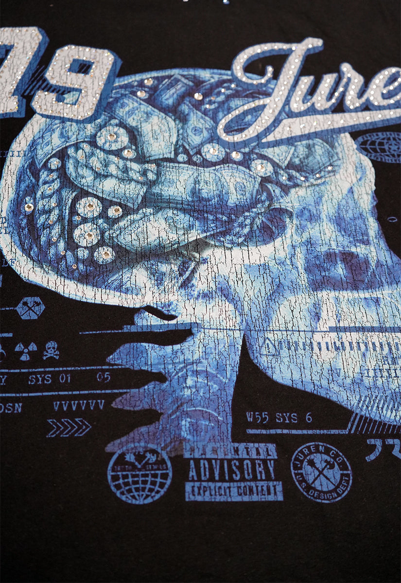 Elevate your wardrobe with the Juren Mindset Black Shirt, a statement piece that merges bold design with meaningful messaging. This premium black shirt features an intricate X-ray skull graphic on the front, adorned with shimmering rhinestones that highlight floating money and diamonds within the skull—a striking visual metaphor for wealth and ambition. The iconic "79 JUREN" branding sits prominently across the chest, outlined in diamond-type rhinestones for maximum impact. Refined details include blue rhinestone accents along the collar and sleeve hems, adding a sophisticated touch. The back showcases the empowering message "MINDSET DETERMINES SUCCESS" in bold blue puff gel print, reinforcing the shirt's motivational aesthetic. Perfect for those who embrace confidence and aspiration, this piece combines artistic craftsmanship with a powerful mindset philosophy.