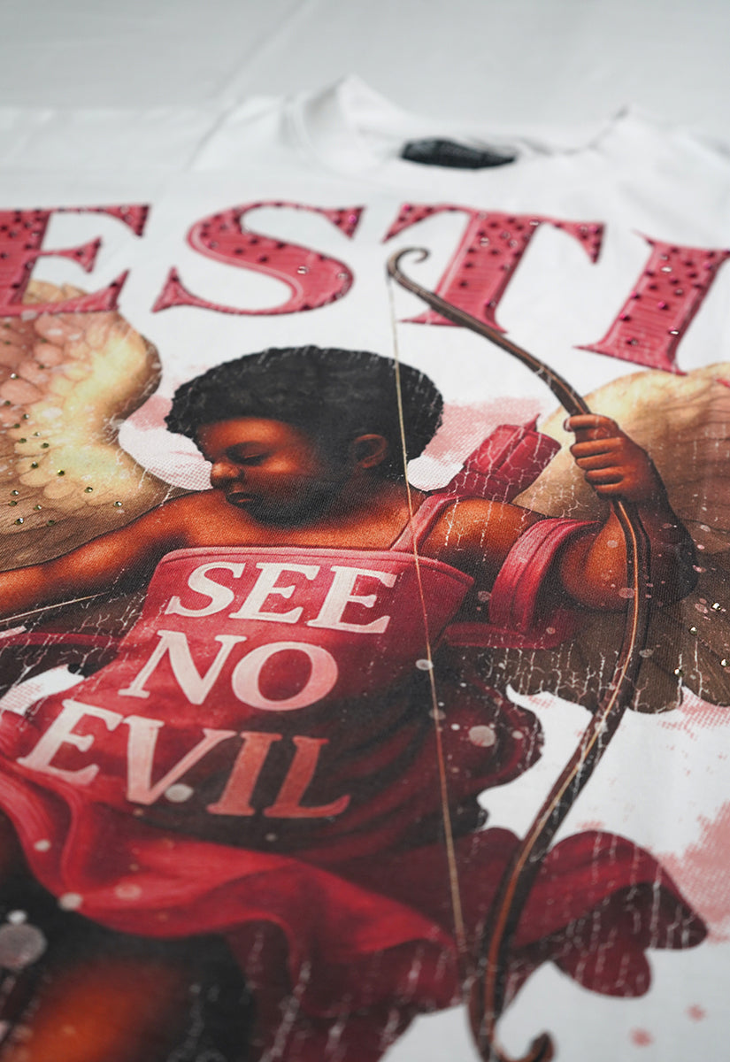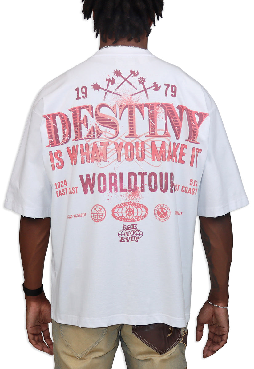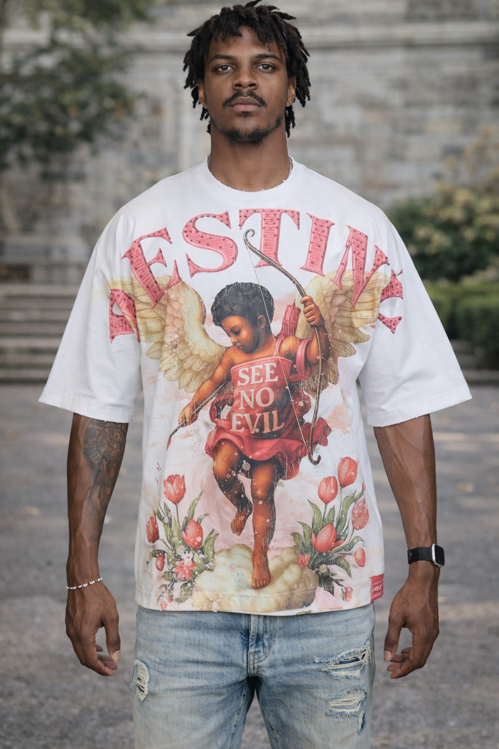 The Destiny White Shirt delivers sophisticated style through carefully curated graphic placement and luxe embellishment. Crafted in a premium white fabric, the front showcases a commanding angel motif paired with the contemplative "See No Evil" inscription. The word "DESTINY" in pink dominates the upper front with pink rhinestones, creating a striking focal point that catches and reflects light with every movement. The rhinestone detailing is concentrated exclusively on the front, allowing the embellishments to command attention without overwhelming the design. The back features a bold 1979 Battle Axe graphic alongside the inspirational text "Destiny Is What You Make It," rendered in clean, unadorned print for balanced visual contrast. This strategic design approach—combining rhinestone luxury on the front with understated graphics on the back—creates a versatile piece that works equally well as a statement layer or standalone garment. The quality construction ensures durability and longevity, making this shirt a meaningful addition to any wardrobe that celebrates personal empowerment and artistic expression.