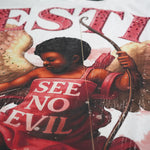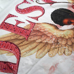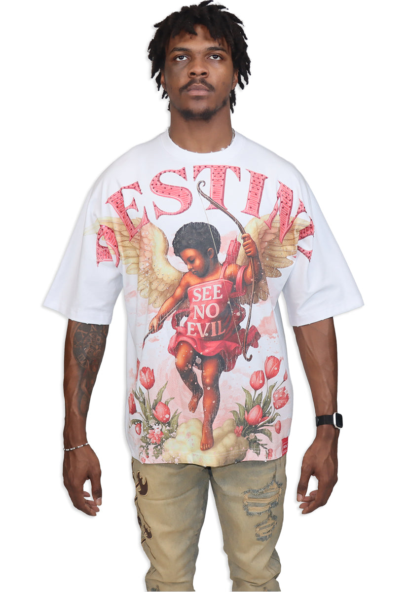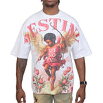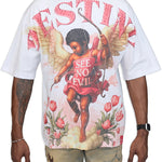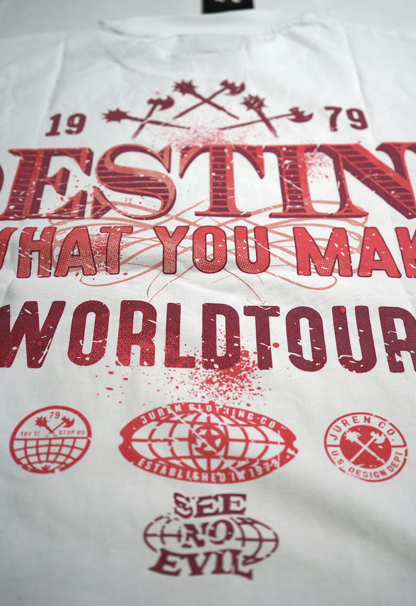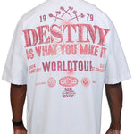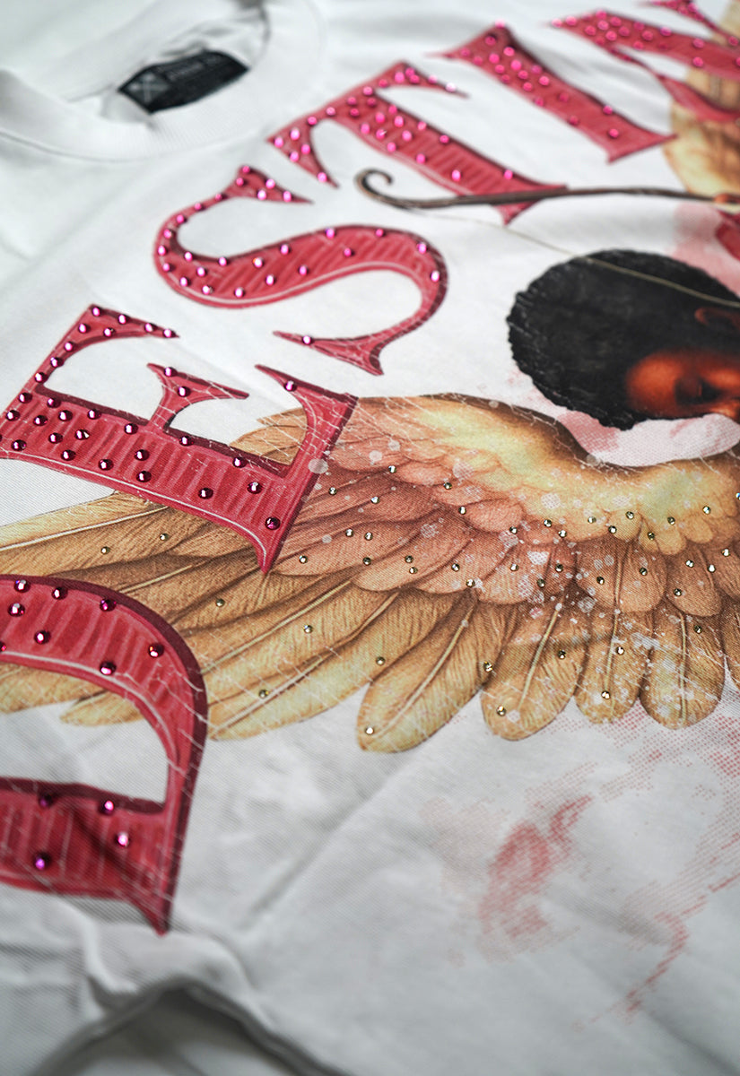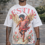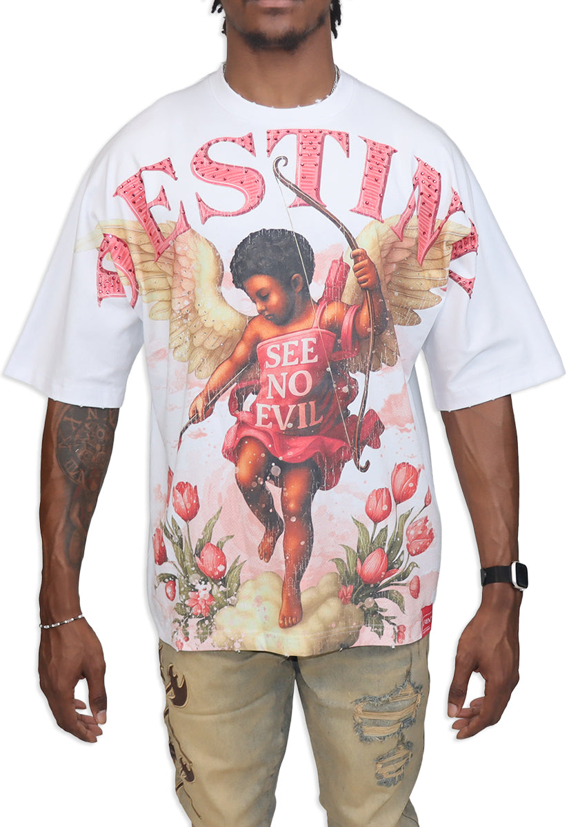 The Destiny White Shirt delivers sophisticated style through carefully curated graphic placement and luxe embellishment. Crafted in a premium white fabric, the front showcases a commanding angel motif paired with the contemplative "See No Evil" inscription. The word "DESTINY" in pink dominates the upper front with pink rhinestones, creating a striking focal point that catches and reflects light with every movement. The rhinestone detailing is concentrated exclusively on the front, allowing the embellishments to command attention without overwhelming the design. The back features a bold 1979 Battle Axe graphic alongside the inspirational text "Destiny Is What You Make It," rendered in clean, unadorned print for balanced visual contrast. This strategic design approach—combining rhinestone luxury on the front with understated graphics on the back—creates a versatile piece that works equally well as a statement layer or standalone garment. The quality construction ensures durability and longevity, making this shirt a meaningful addition to any wardrobe that celebrates personal empowerment and artistic expression.