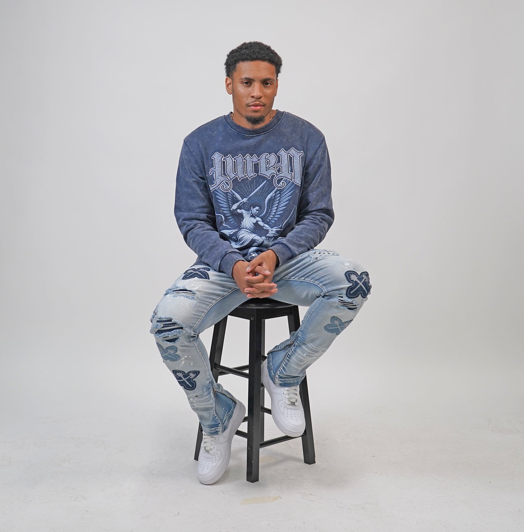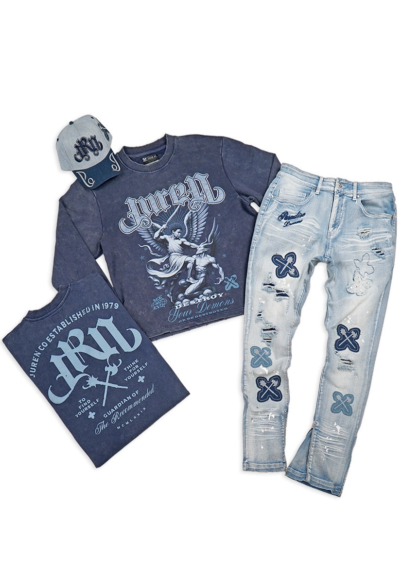 Destroy Your Demons Crewneck, Denim Jeans and Denim Hat Combo