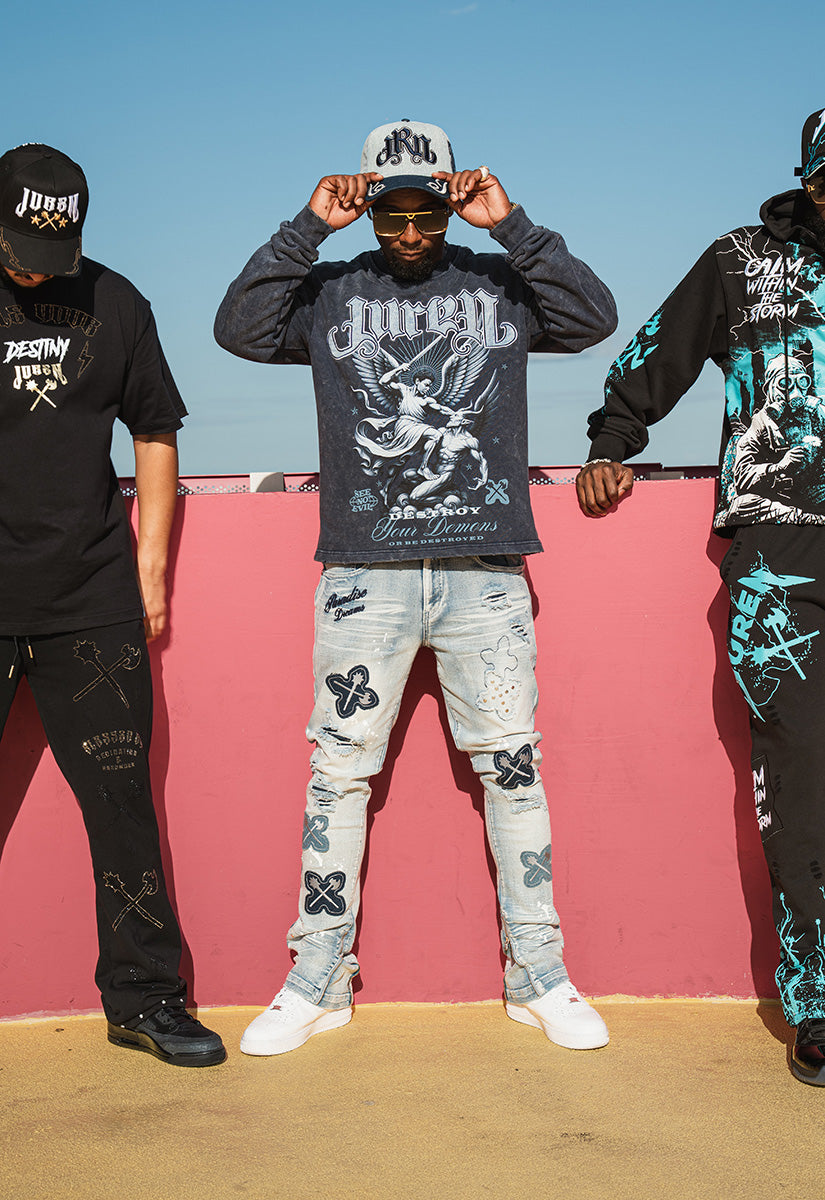 Destroy Your Demons Crewneck, Denim Jeans and Denim Hat Combo Include: