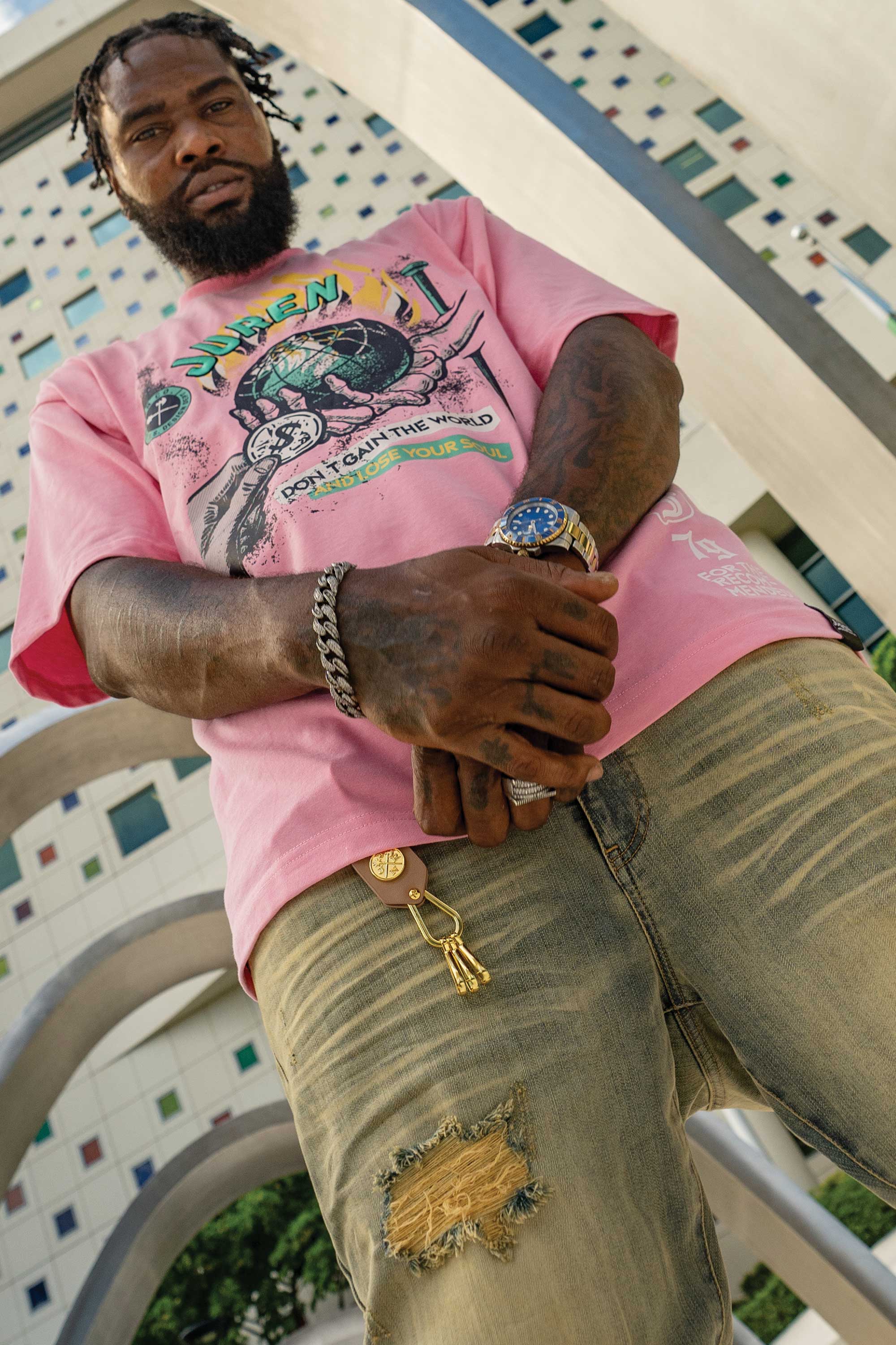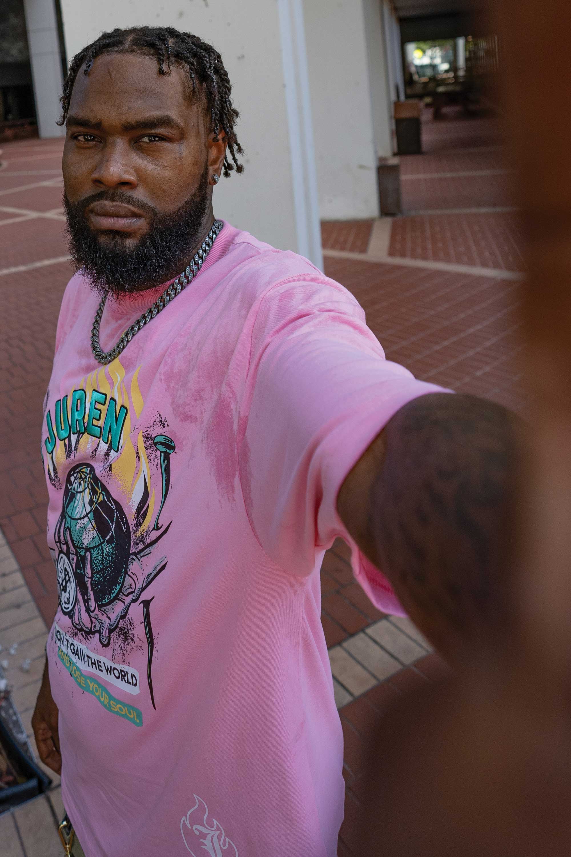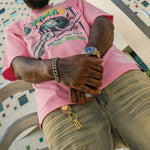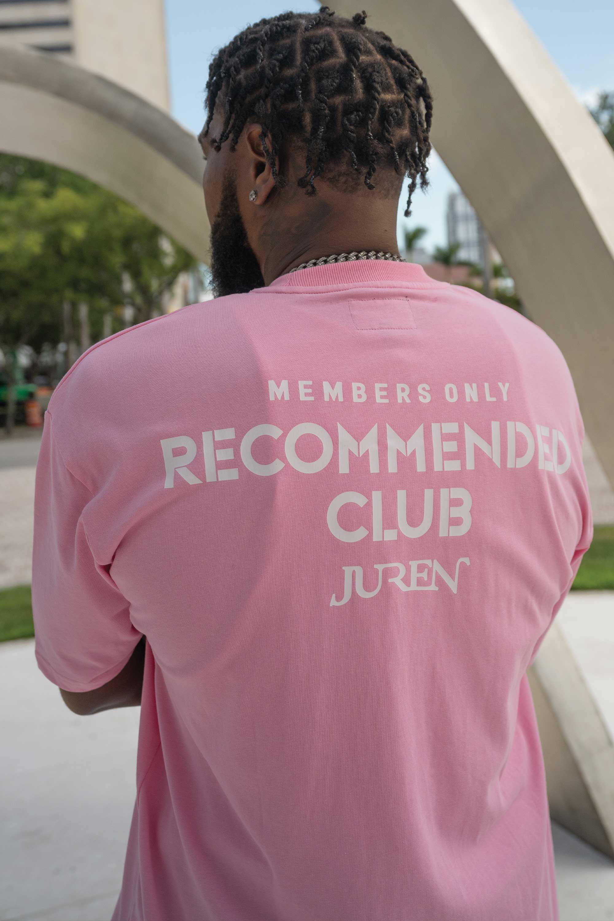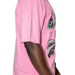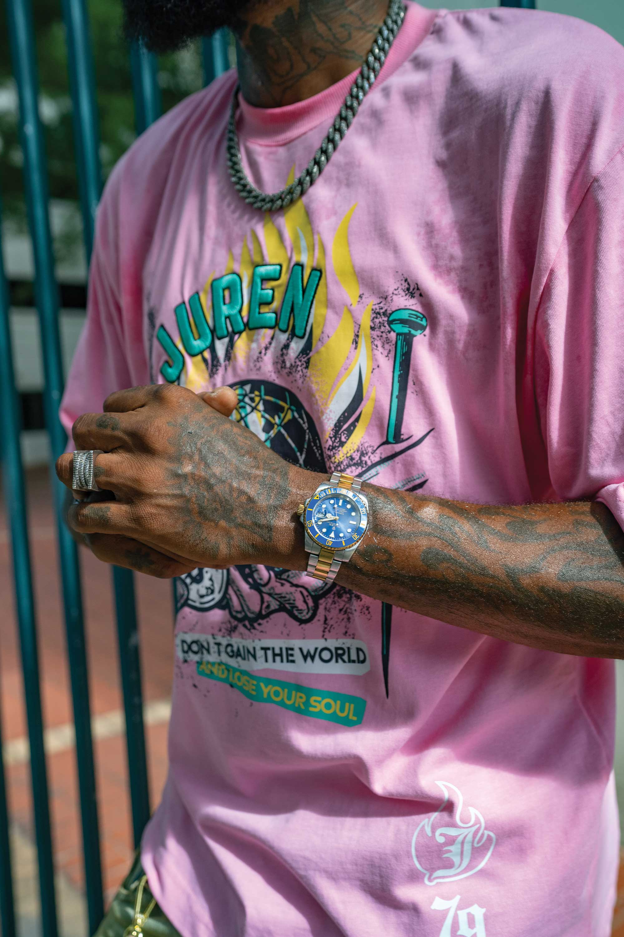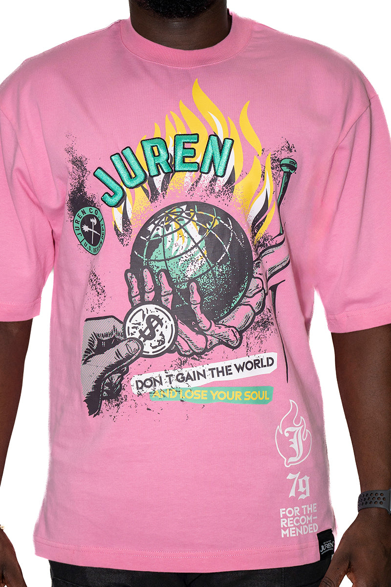 The Juren Don’t Gain The World Vintage Pink Tee features a vintage pink body fabric color. On the front, an intriguing print depicts a human hand exchanging a coin with a skeleton hand holding a world engulfed in flames. The verbiage reads "Don't Gain The World and Lose Your Soul," with "JUREN" embroidered for added detail. The back features a simple design stating "Members Only Recommended Club," offering a minimalist contrast to the dynamic front print. This tee combines thought-provoking design with a stylish vintage pink hue.