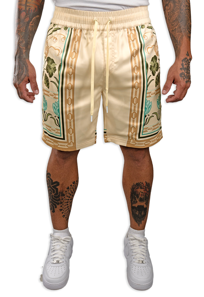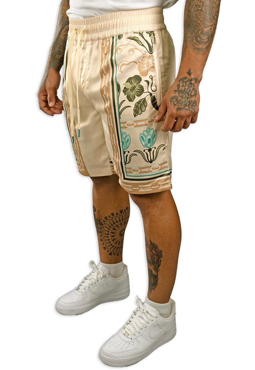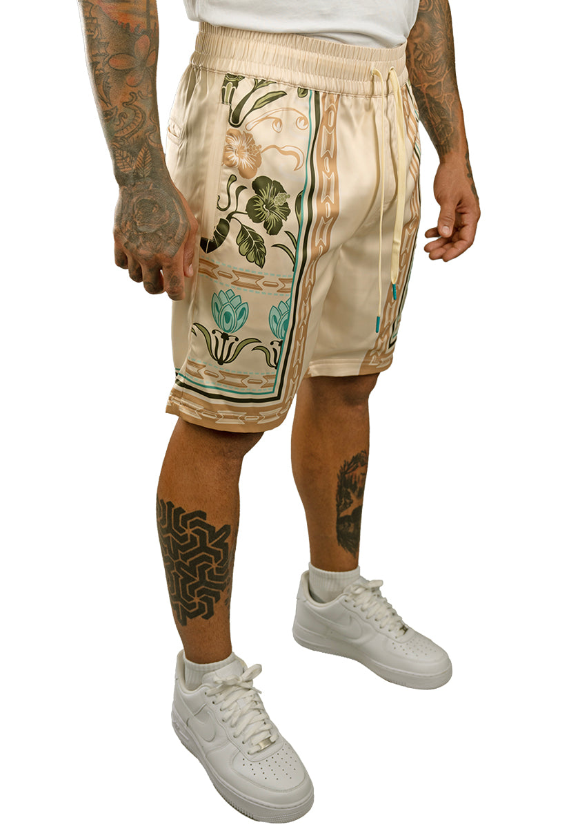 Elevate your wardrobe with the Elegant Arrangement Shorts, crafted from luxurious cream silk for a smooth, comfortable feel. These shorts feature an elastic waistband with adjustable drawstrings, ensuring a perfect fit for all-day wear. Adorned with intricate floral arrangements and a distinctive Greek border along the front and hem, they blend classic artistry with modern design. Ideal for those seeking both style and comfort, these shorts offer a refined look suitable for casual outings or sophisticated lounging. Experience elegance and ease in one versatile piece.