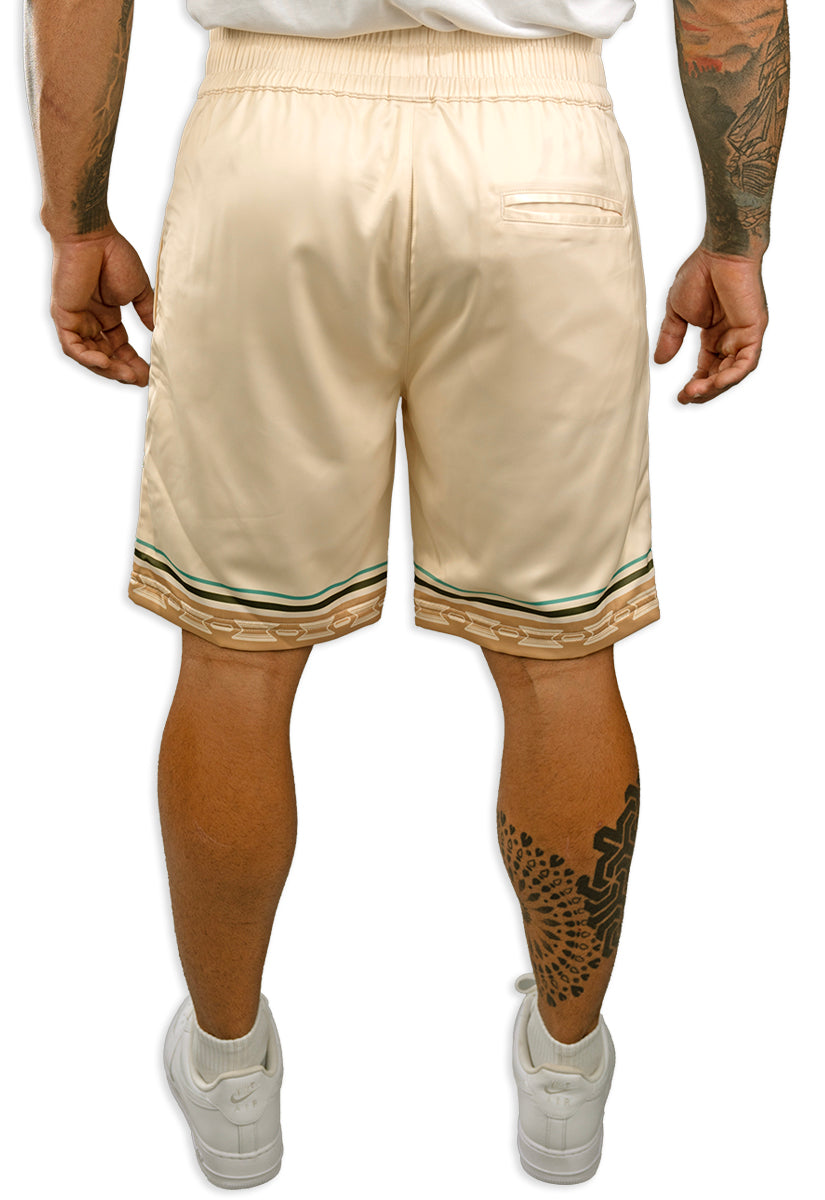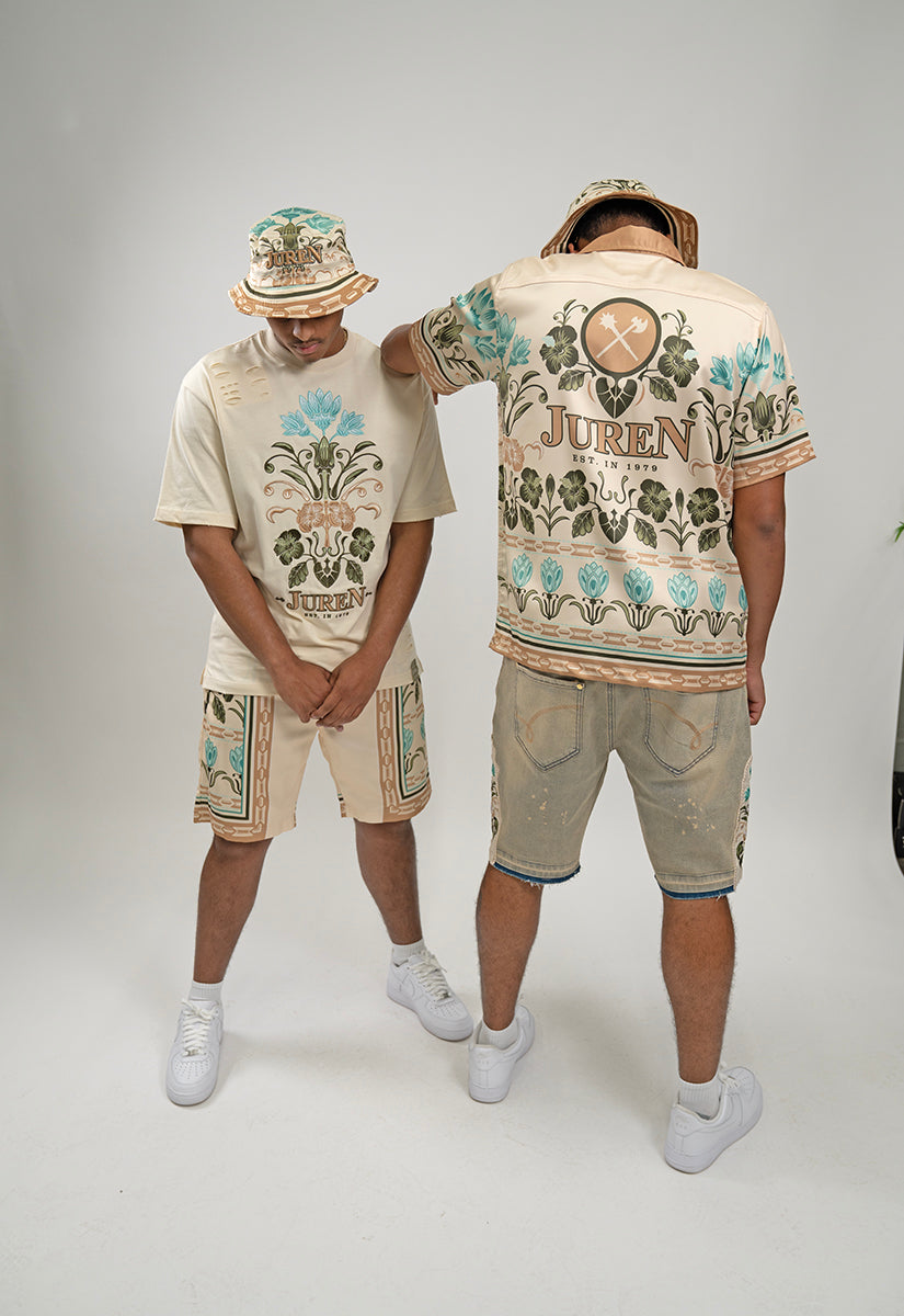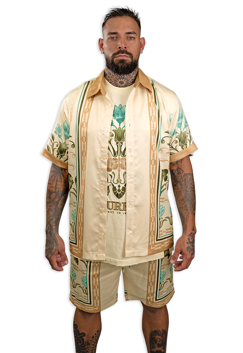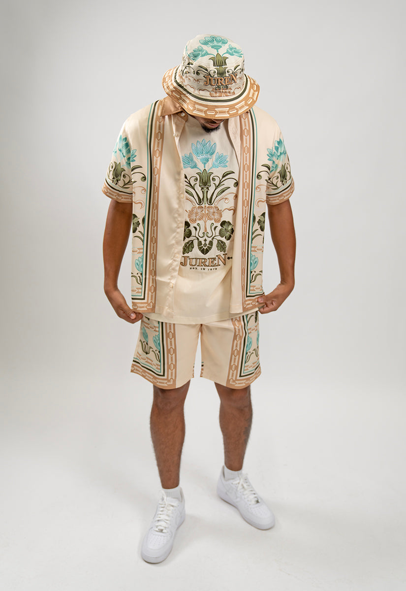Elevate your wardrobe with the Elegant Arrangement Shorts, crafted from luxurious cream silk for a smooth, comfortable feel. These shorts feature an elastic waistband with adjustable drawstrings, ensuring a perfect fit for all-day wear. Adorned with intricate floral arrangements and a distinctive Greek border along the front and hem, they blend classic artistry with modern design. Ideal for those seeking both style and comfort, these shorts offer a refined look suitable for casual outings or sophisticated lounging. Experience elegance and ease in one versatile piece.