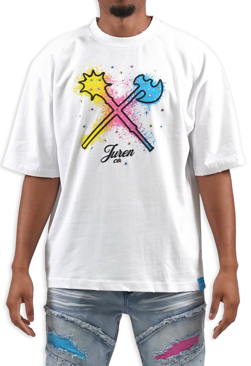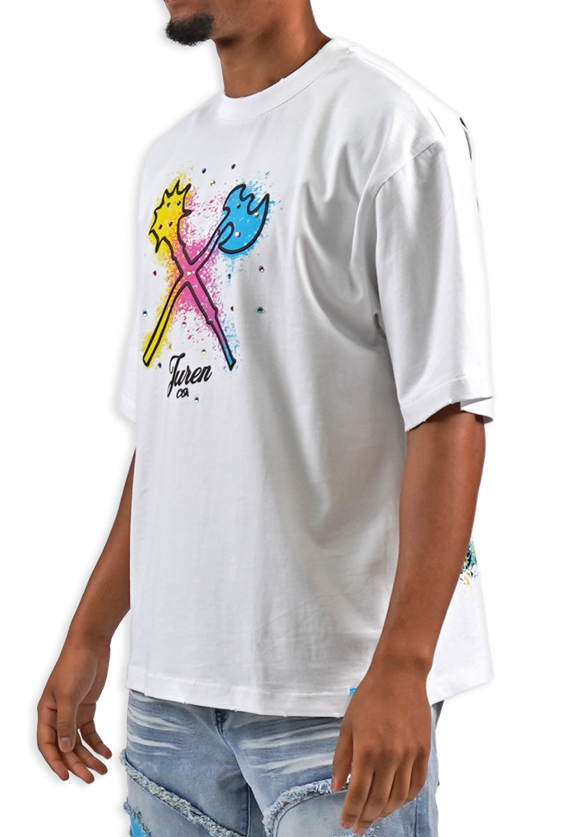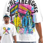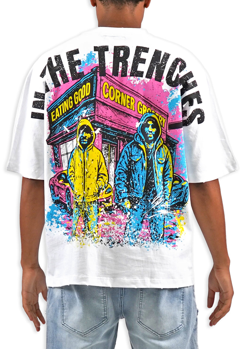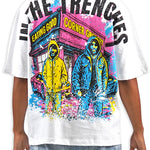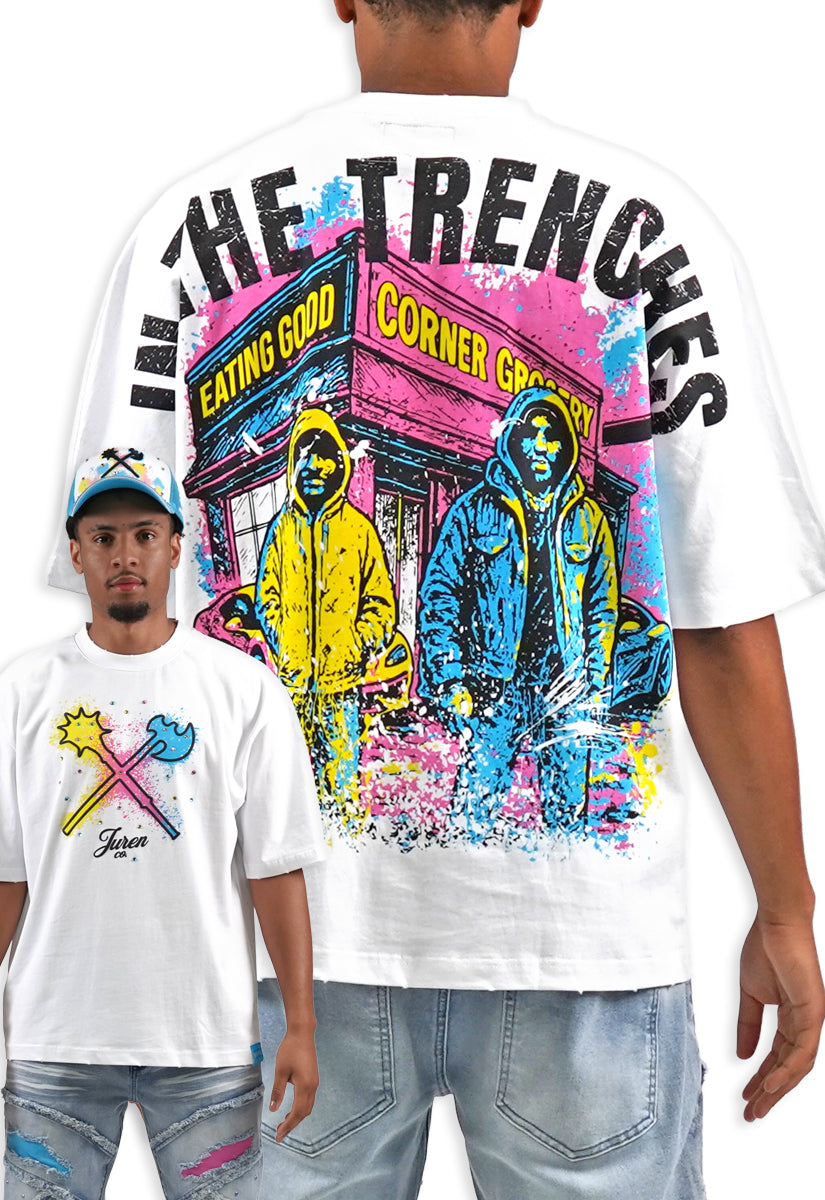 All-white graphic tee featuring the iconic Juren battle axe on the front with a bold black outline and vibrant yellow, cyan, and pink splatters. The Juren signature sits subtly beneath the axe. The back showcases oversized "IN THE TRENCHES" block lettering above a detailed sketch of a corner store scene with two urban figures in hoodies, accented with matching cyan, yellow, and pink highlights. Rhinestone embellishments add dimension and shine throughout the design. A statement piece that blends street culture with bold artistic expression.