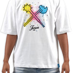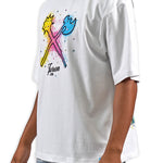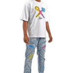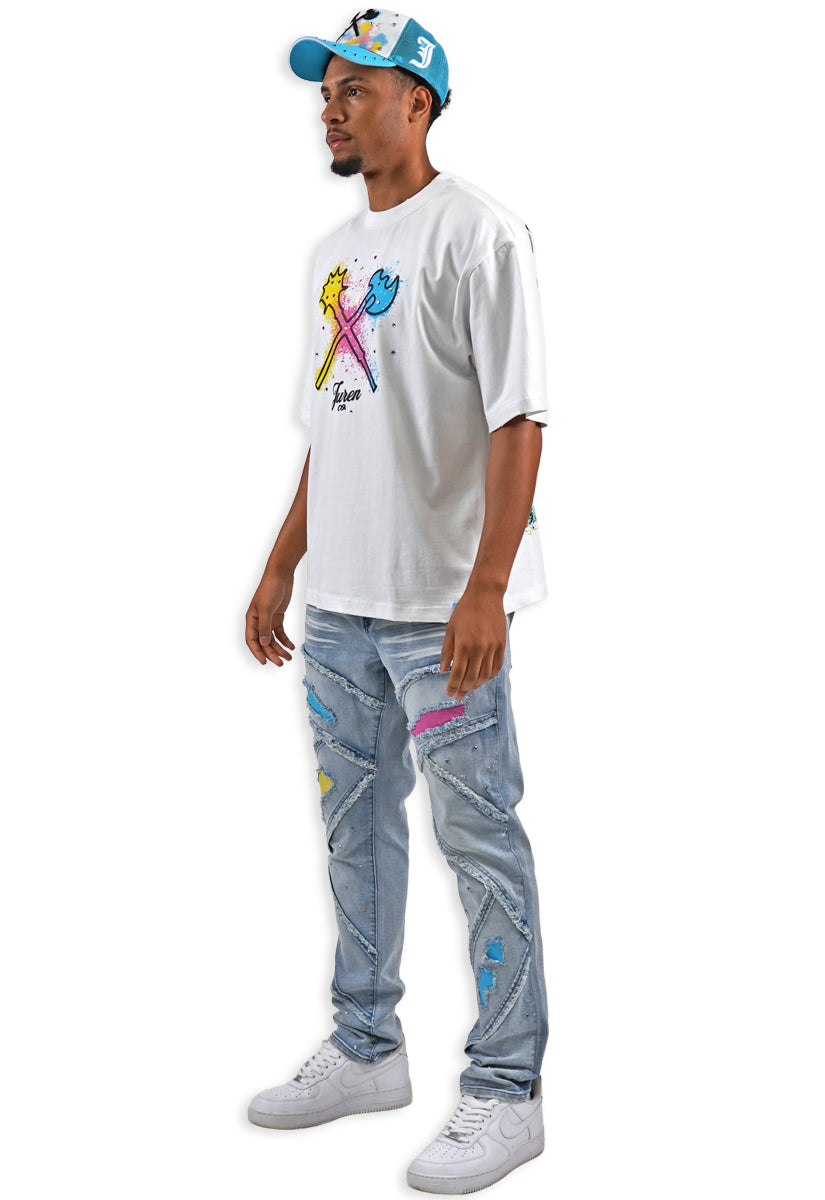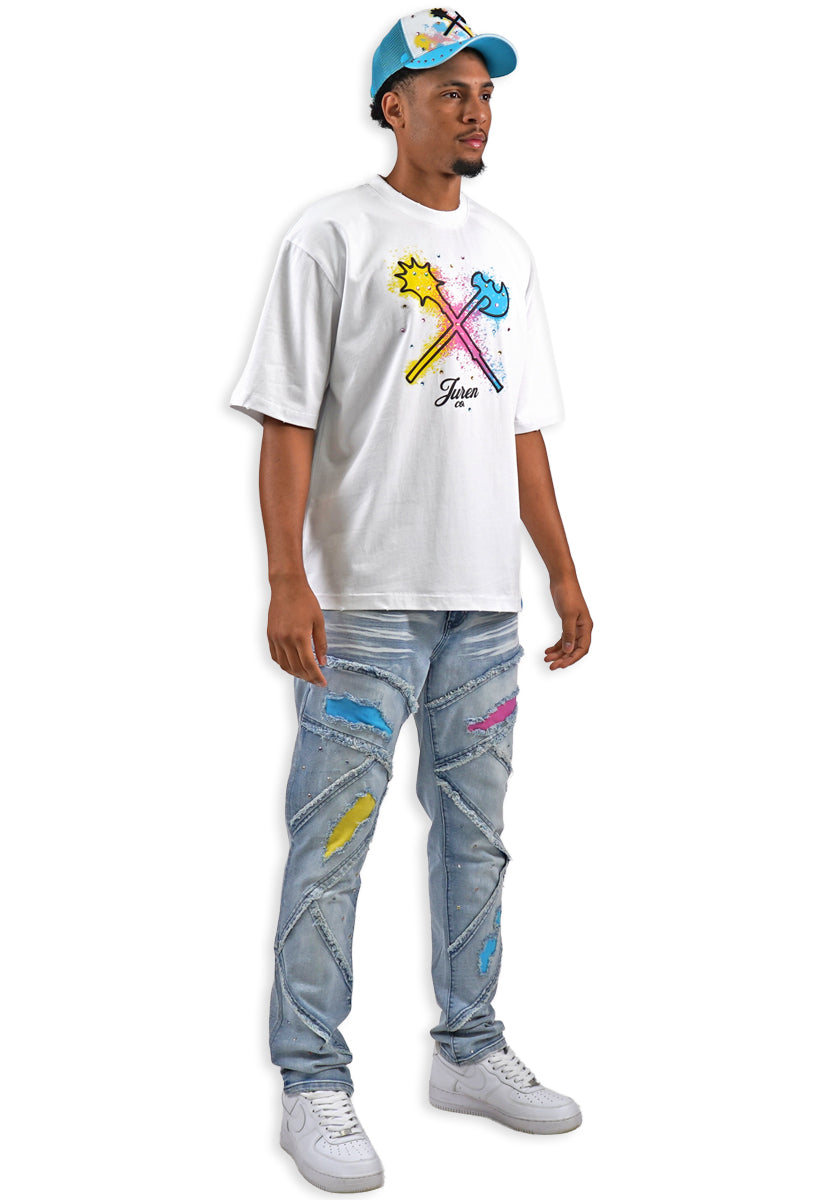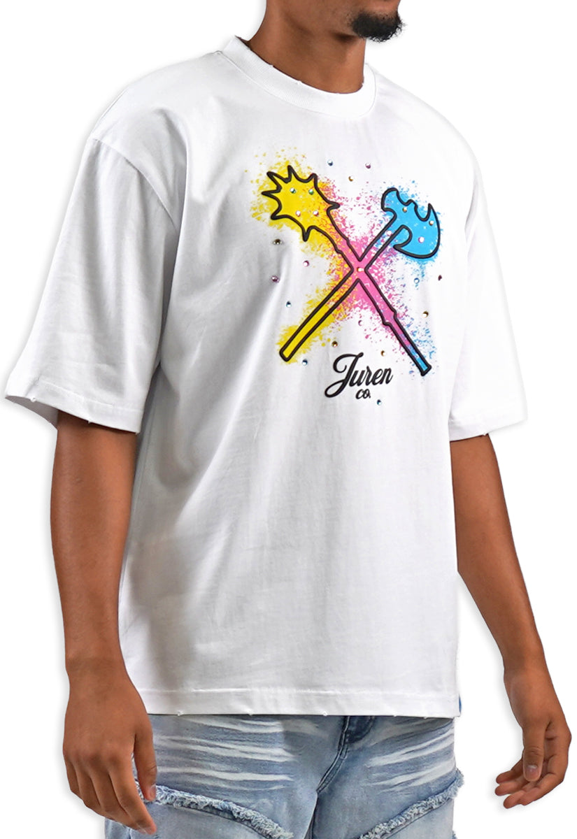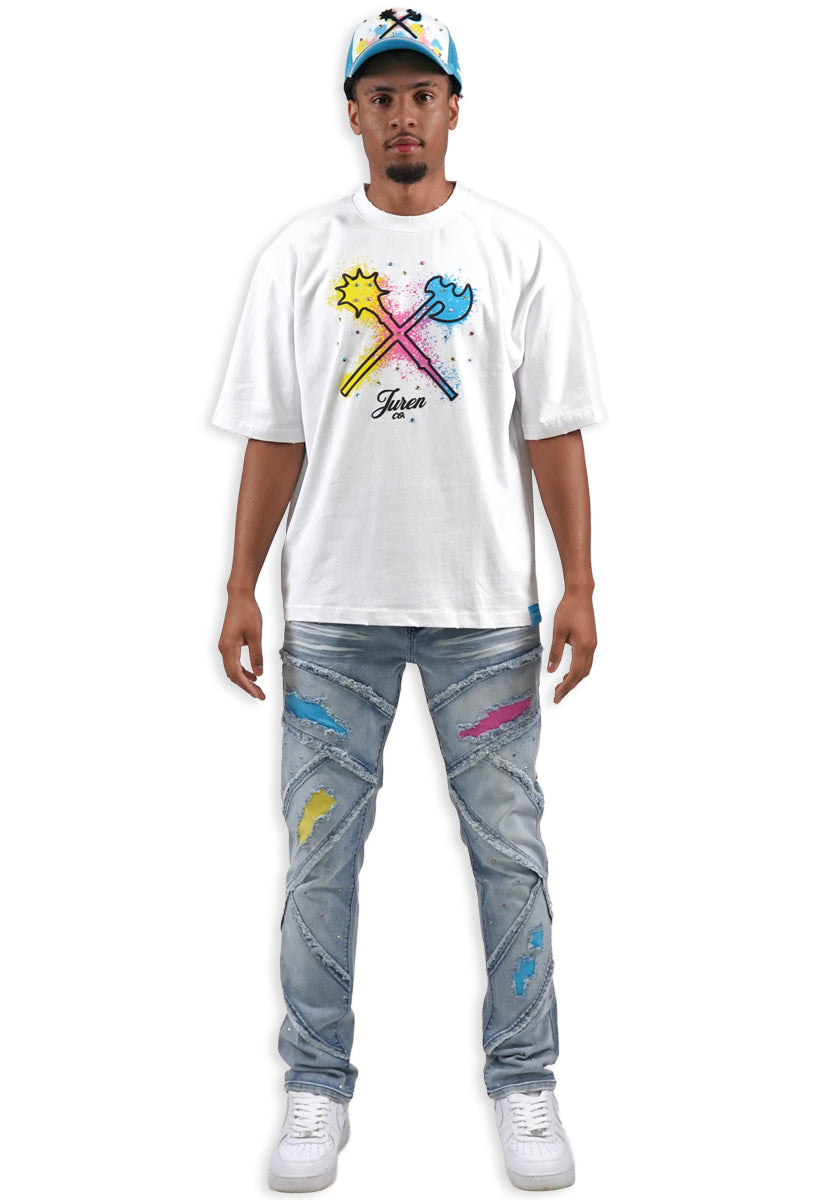 All-white graphic tee featuring the iconic Juren battle axe on the front with a bold black outline and vibrant yellow, cyan, and pink splatters. The Juren signature sits subtly beneath the axe. The back showcases oversized "IN THE TRENCHES" block lettering above a detailed sketch of a corner store scene with two urban figures in hoodies, accented with matching cyan, yellow, and pink highlights. Rhinestone embellishments add dimension and shine throughout the design. A statement piece that blends street culture with bold artistic expression.