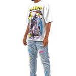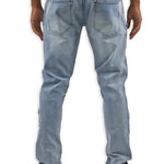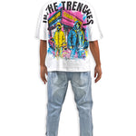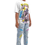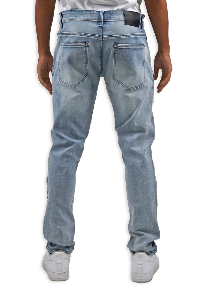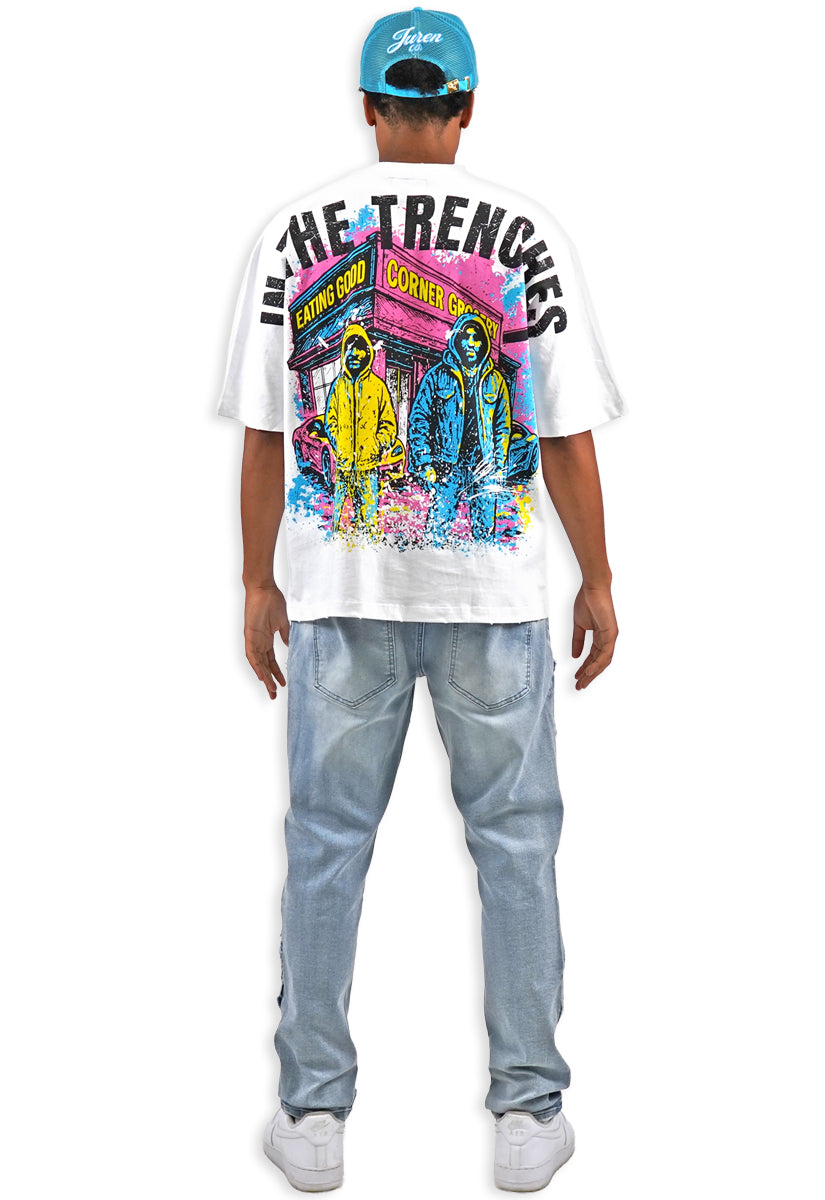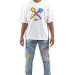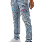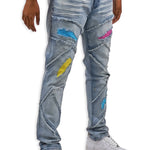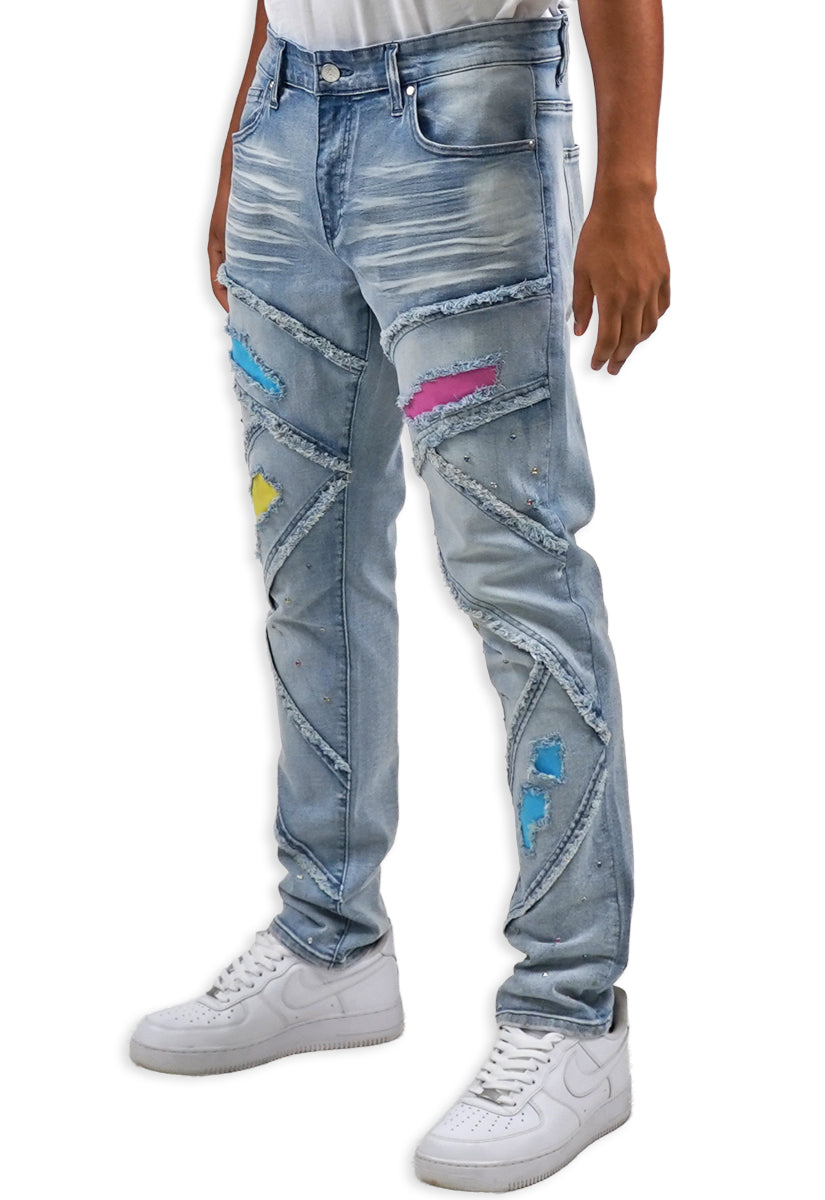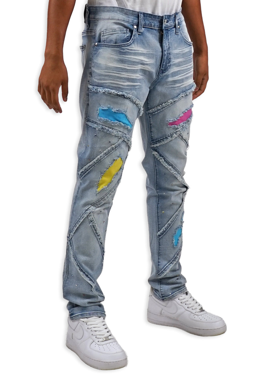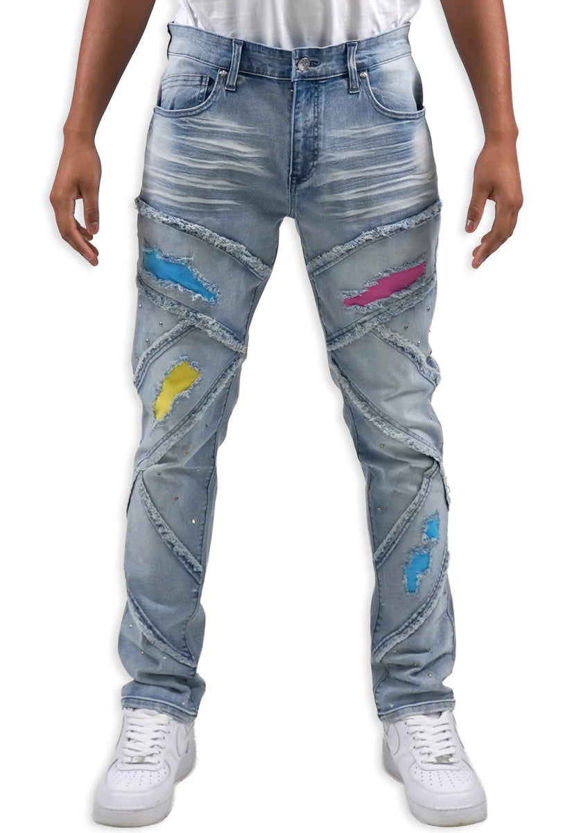 In The Trenches Denim Jeans feature light blue denim with strategic curve fray cuts throughout, revealing vibrant cyan, pink, and yellow tear patches underneath. Matching rhinestones accent the design, adding sparkle and dimension to this bold statement piece. Perfect for those who want edgy style with eye-catching detail.
