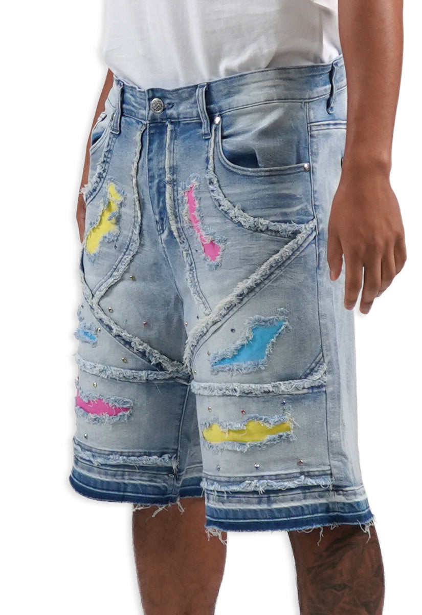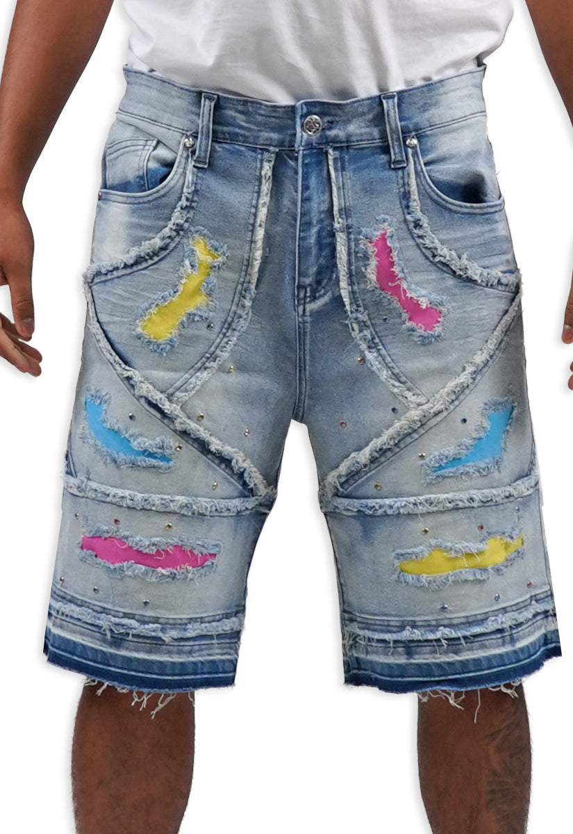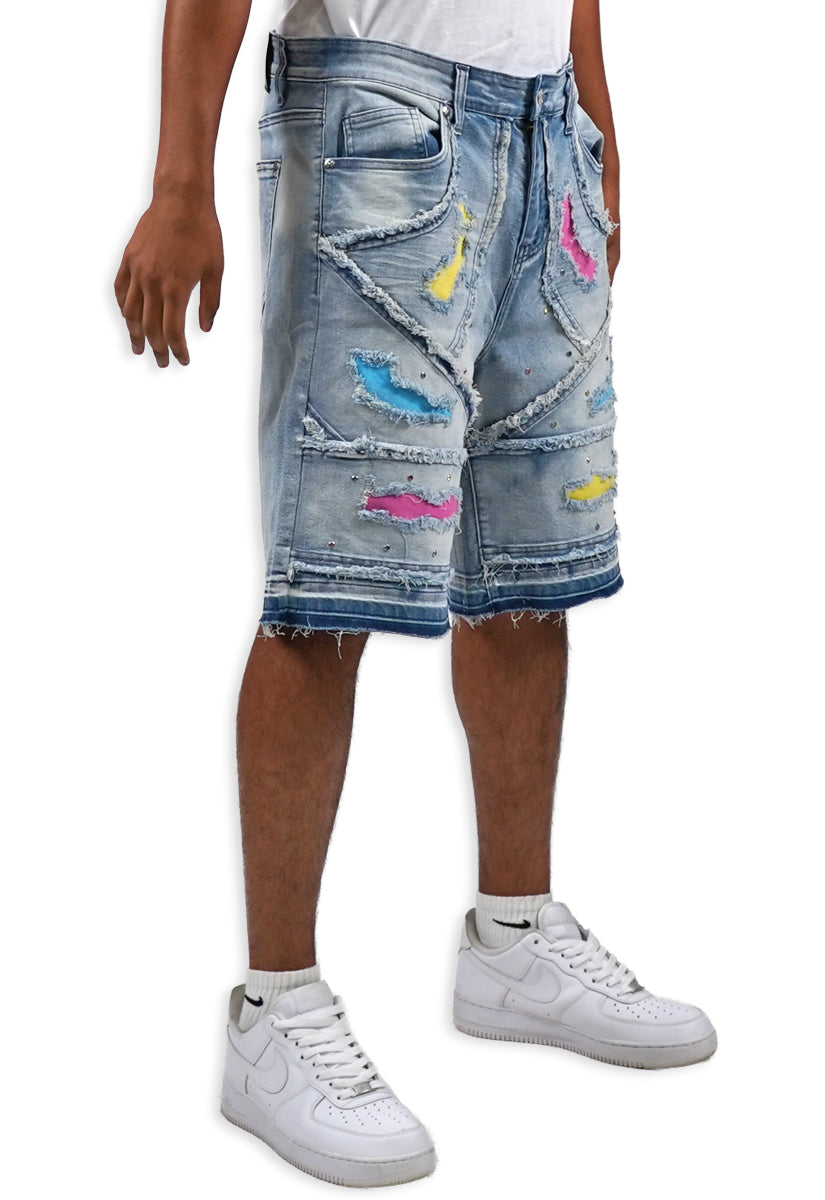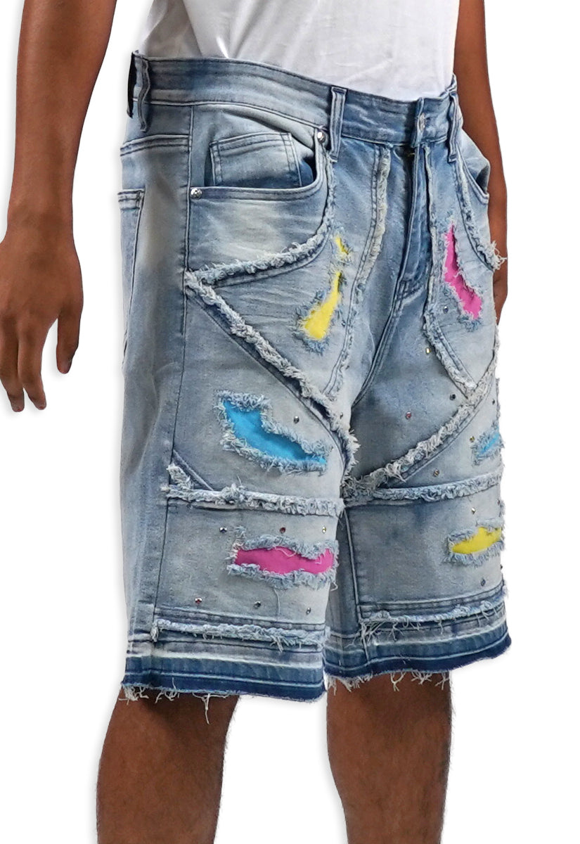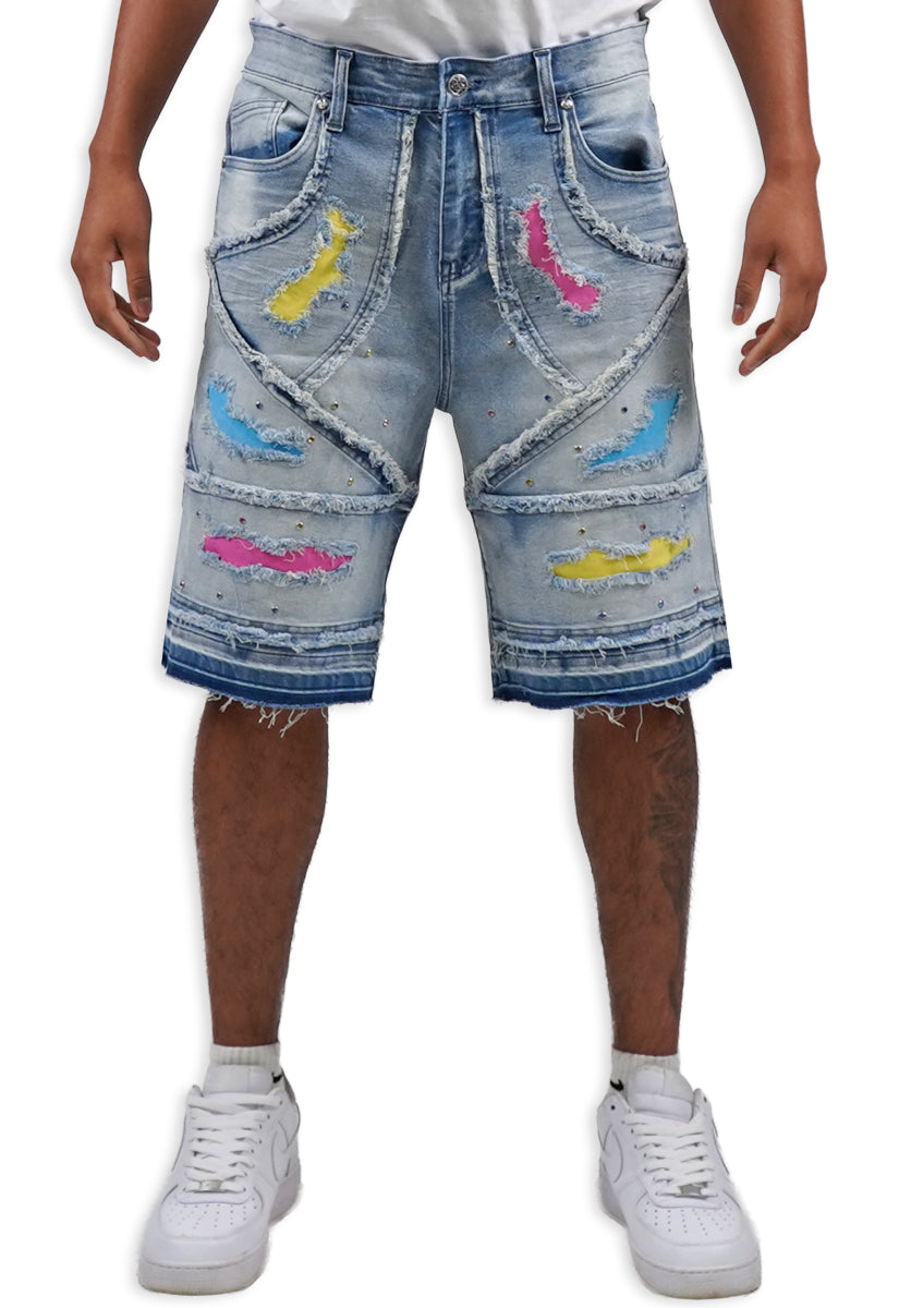 In The Trenches Denim Jean Shorts feature light blue denim with strategic curve fray cuts throughout, revealing vibrant cyan, pink, and yellow tear patches underneath. Matching rhinestones accent the design, adding sparkle and dimension to this bold statement piece. Perfect for those who want edgy style with eye-catching detail.