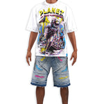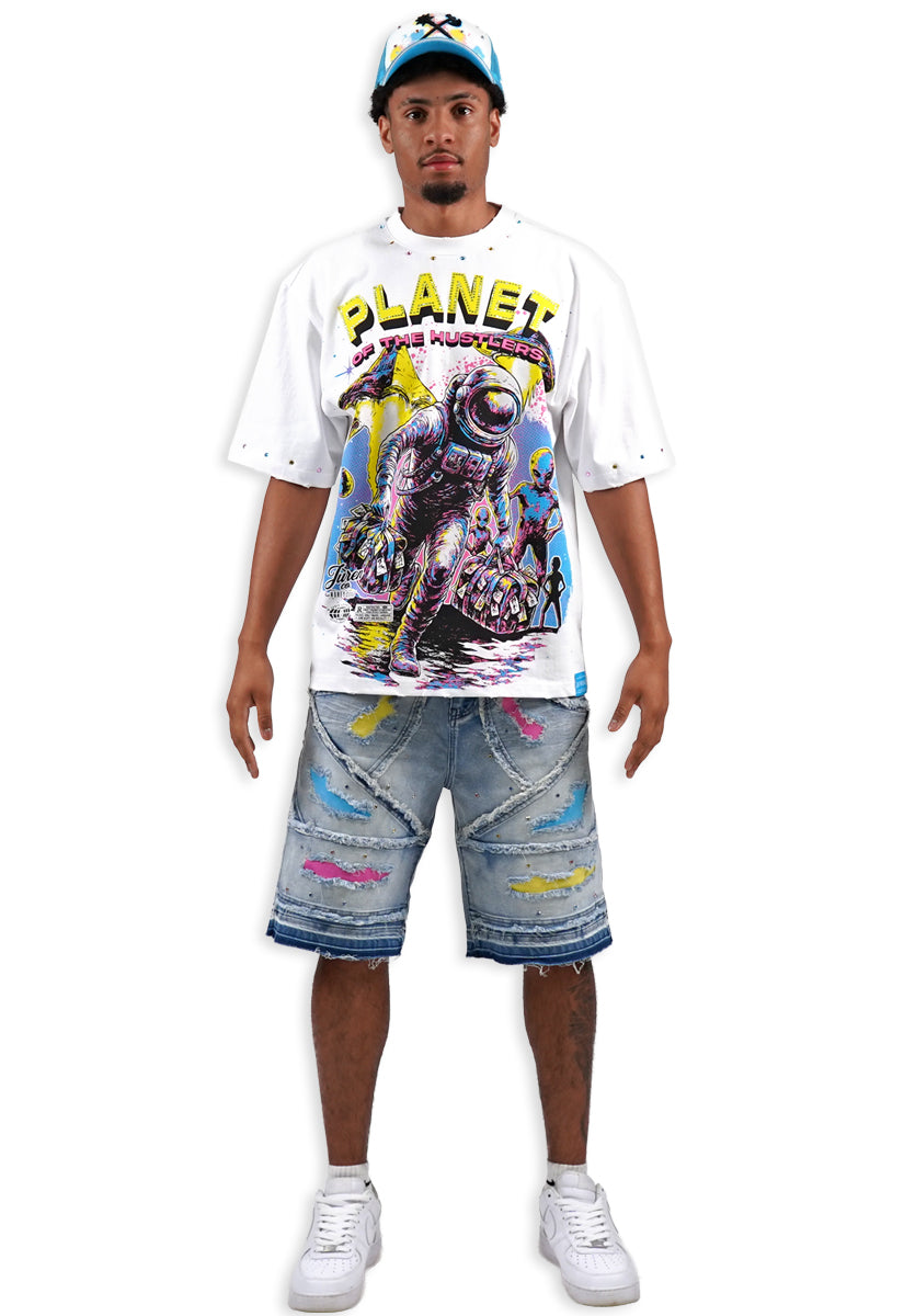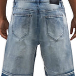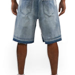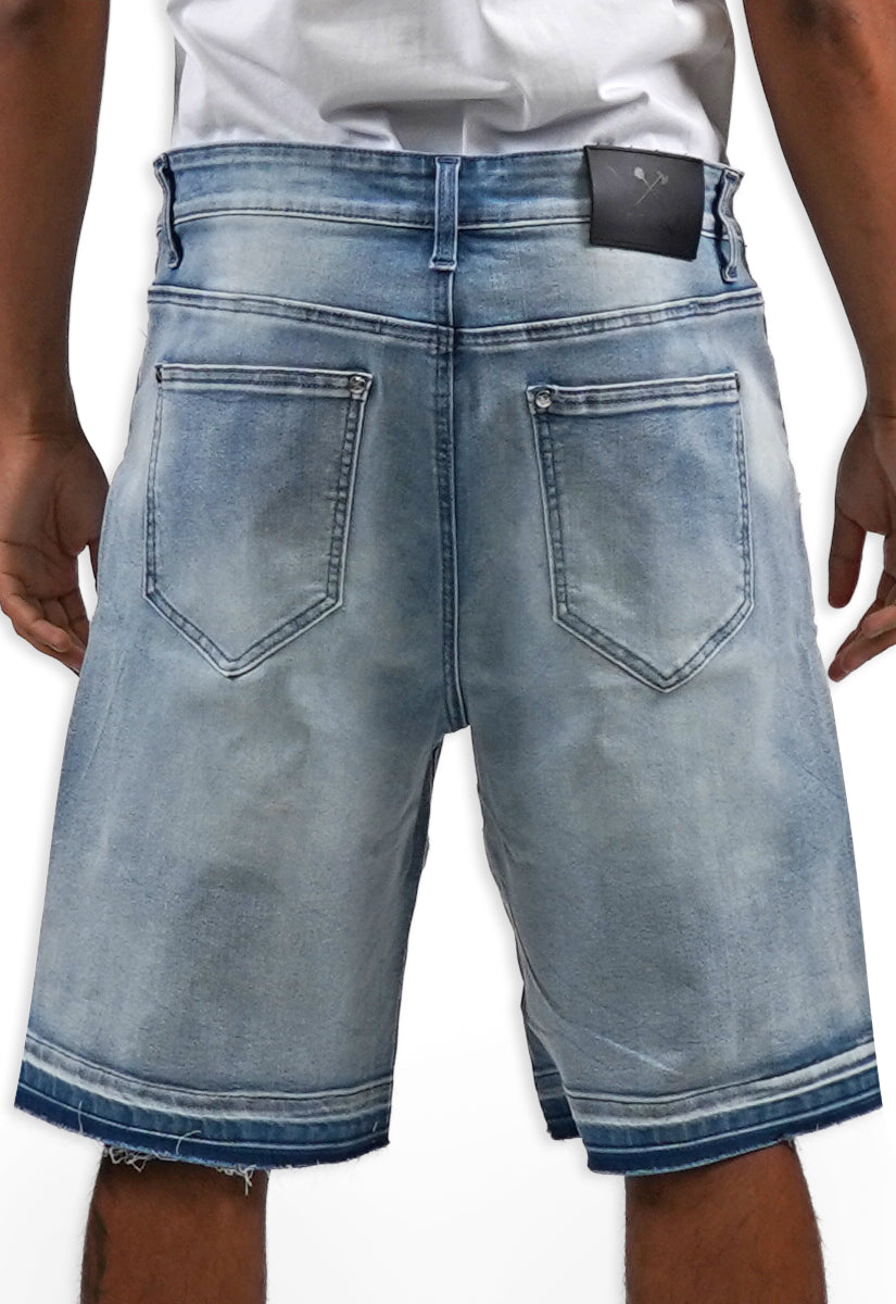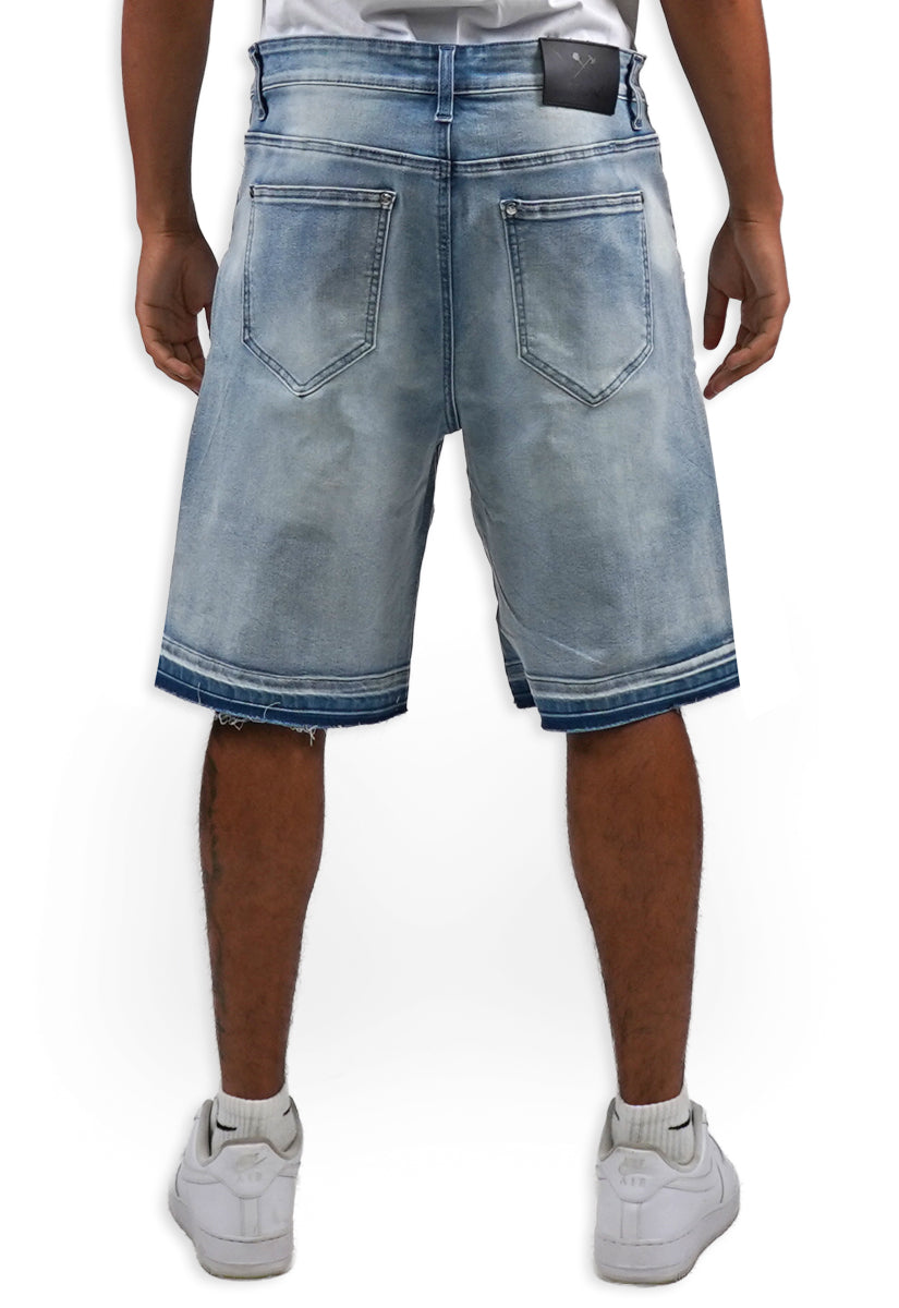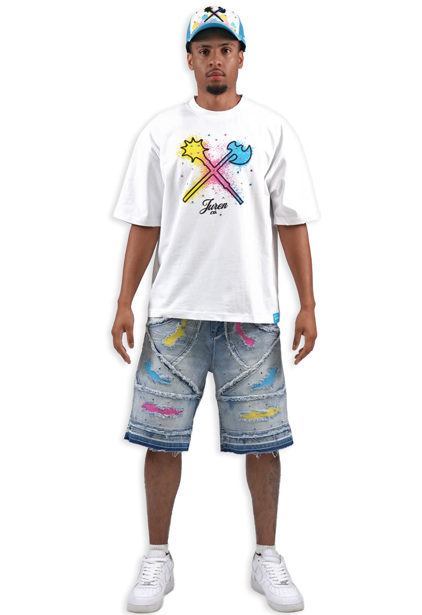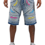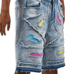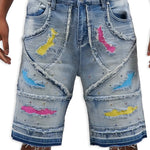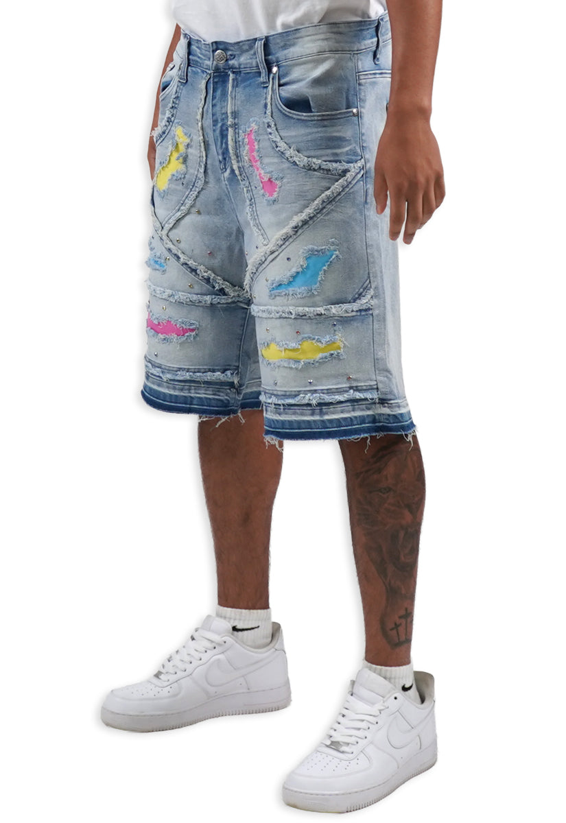 In The Trenches Denim Jean Shorts feature light blue denim with strategic curve fray cuts throughout, revealing vibrant cyan, pink, and yellow tear patches underneath. Matching rhinestones accent the design, adding sparkle and dimension to this bold statement piece. Perfect for those who want edgy style with eye-catching detail.