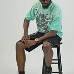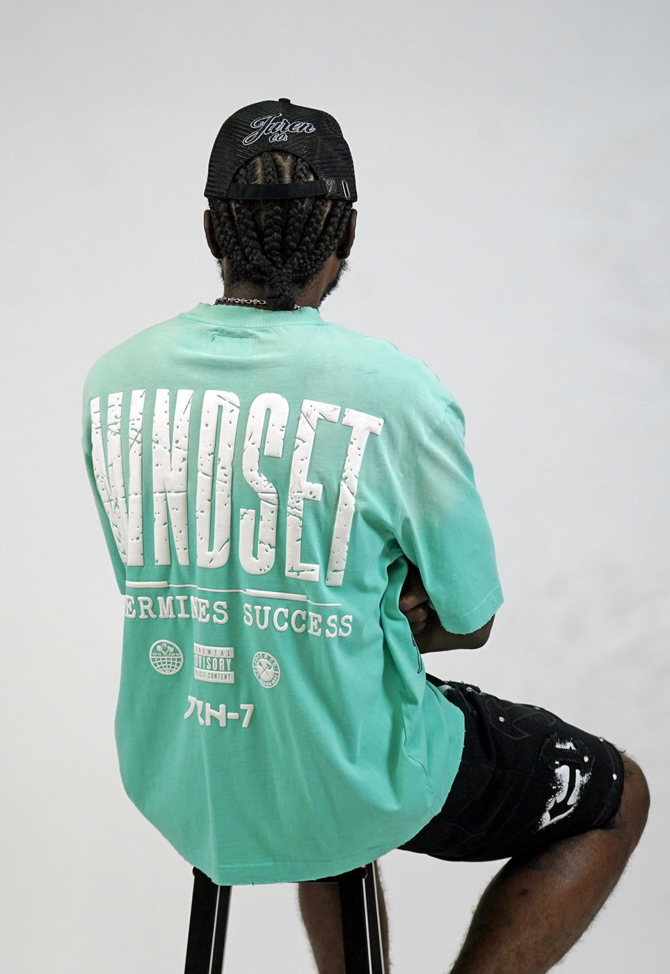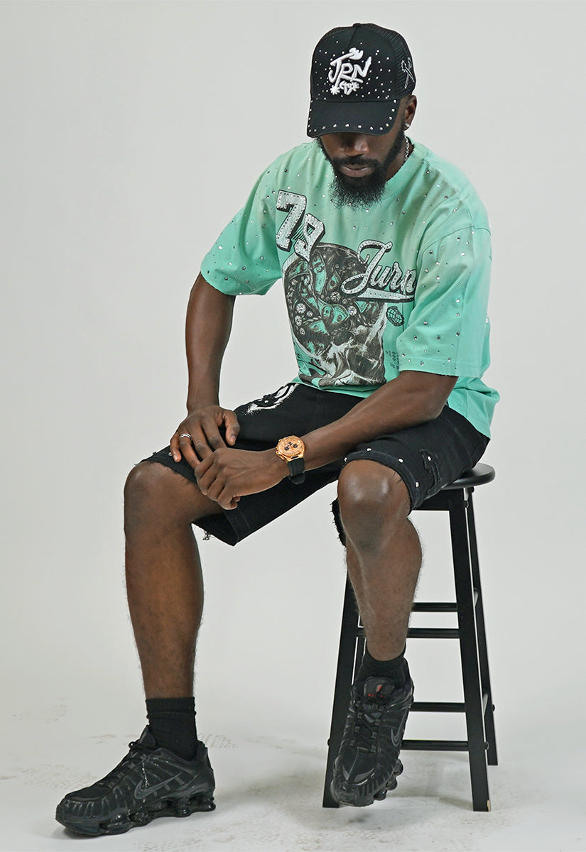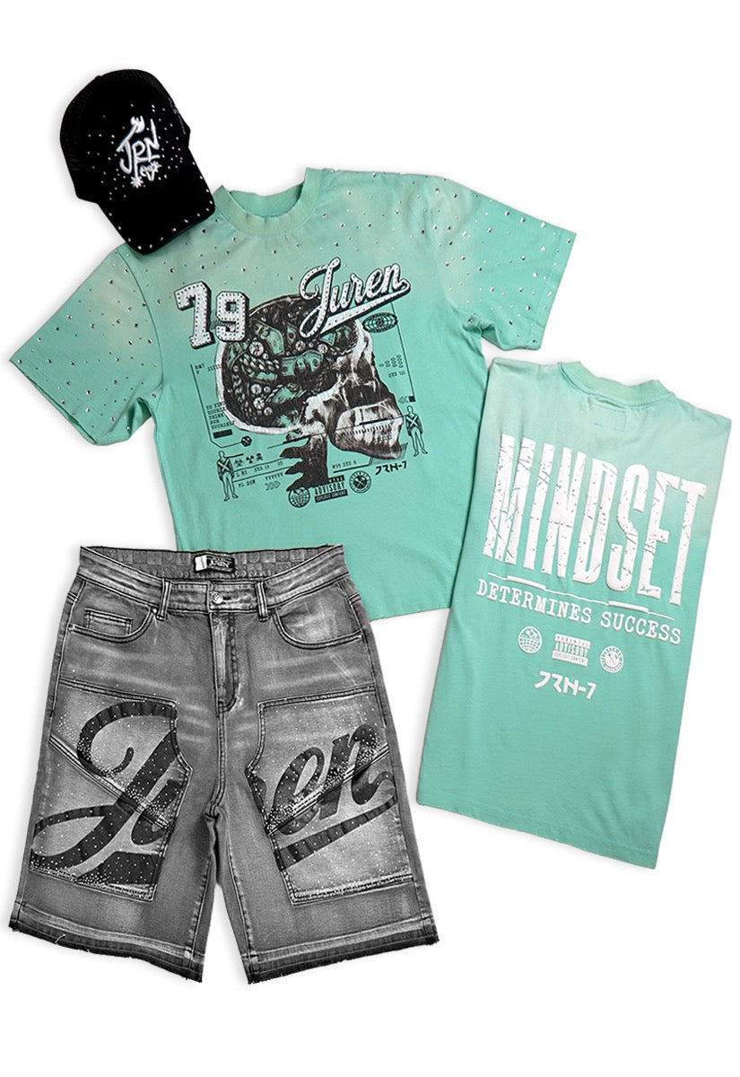 Juren Mindset Mint Shirt - Rhinestones, Grey Denim shorts and Trucker Hat Combo Include: