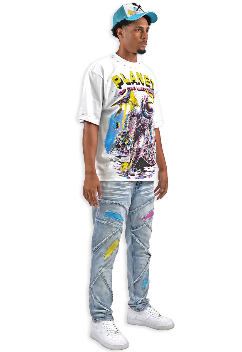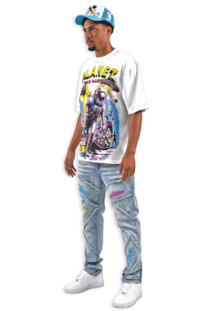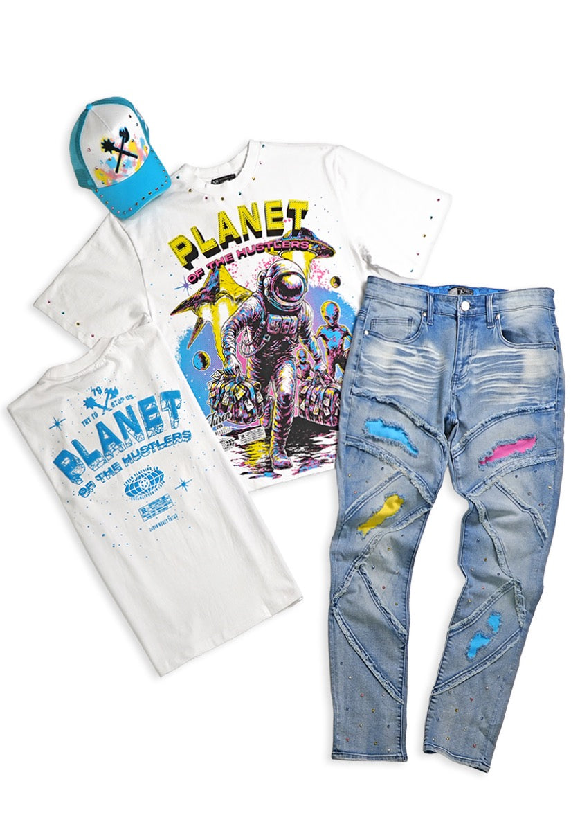 Planet Hustlers White Shirt - Rhinestone, Denim Jeans and Trucker Hat Combo