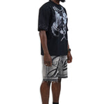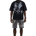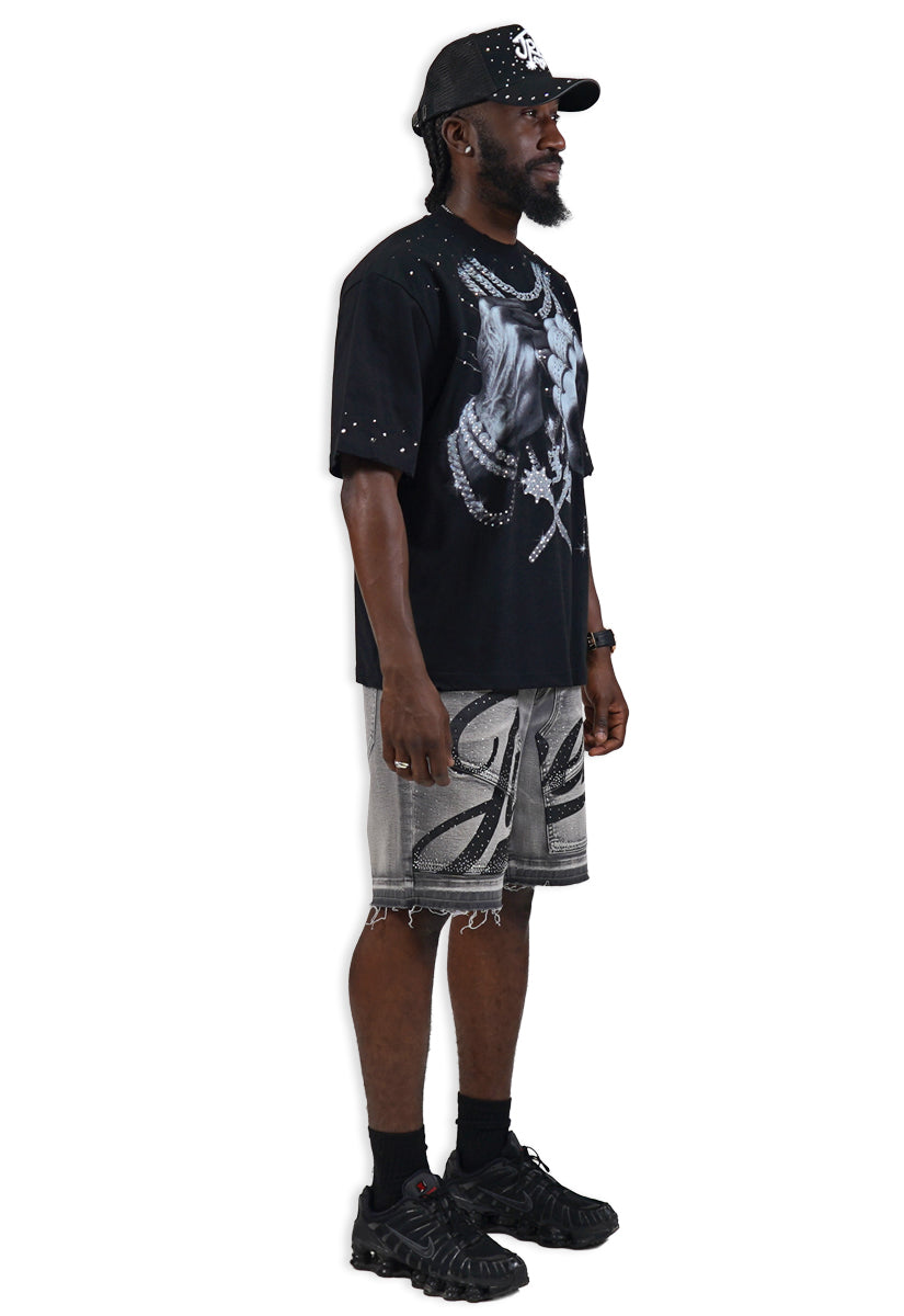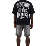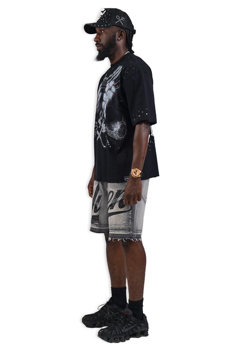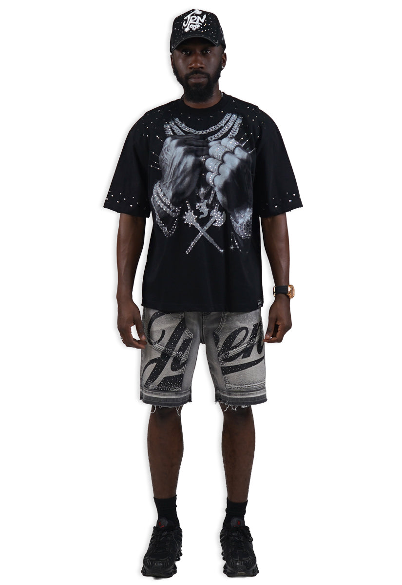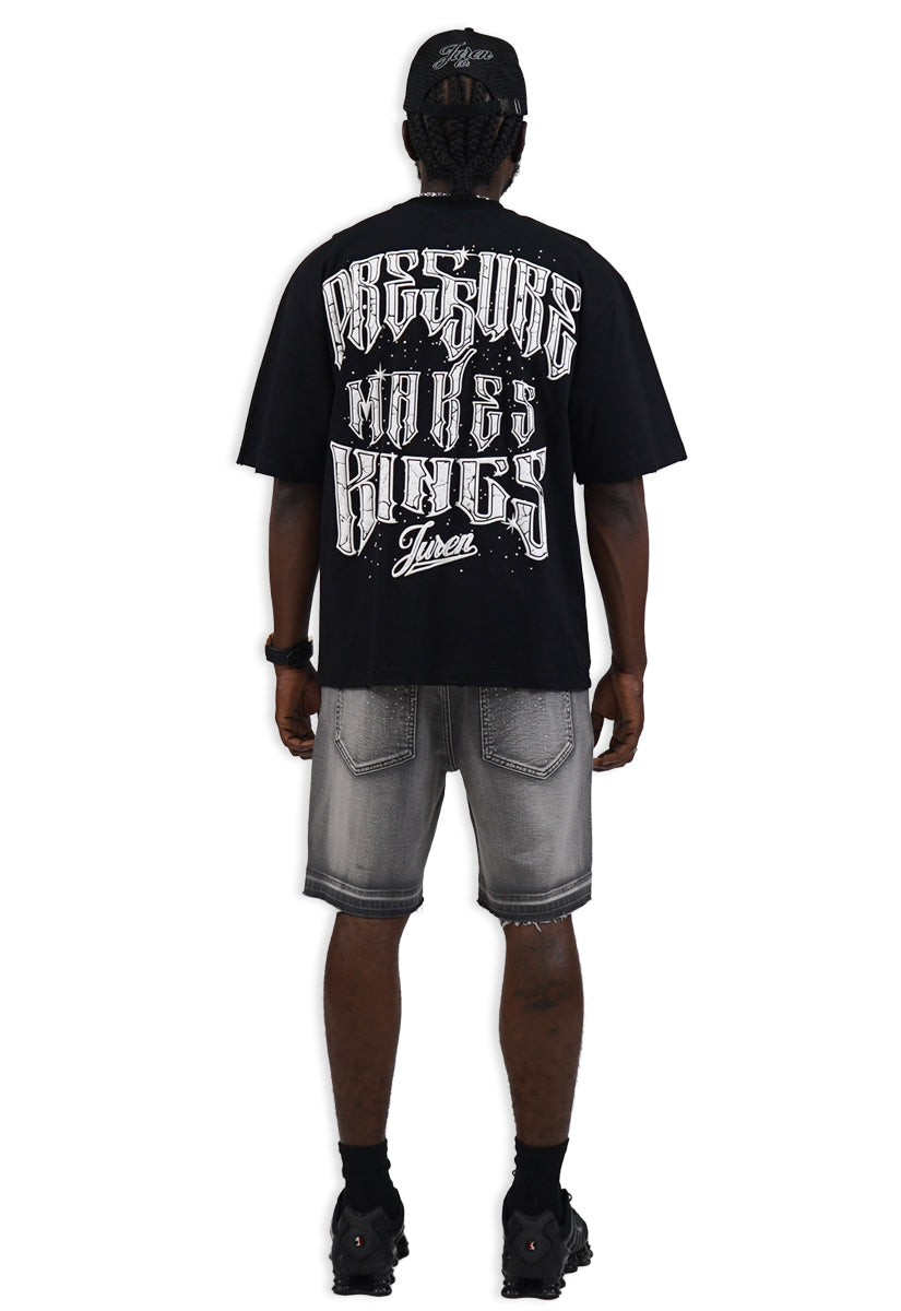 Pressure Makes Kings Black Shirt - Rhinestones, Grey Denim Shorts and Trucker Hat Combo Include: