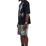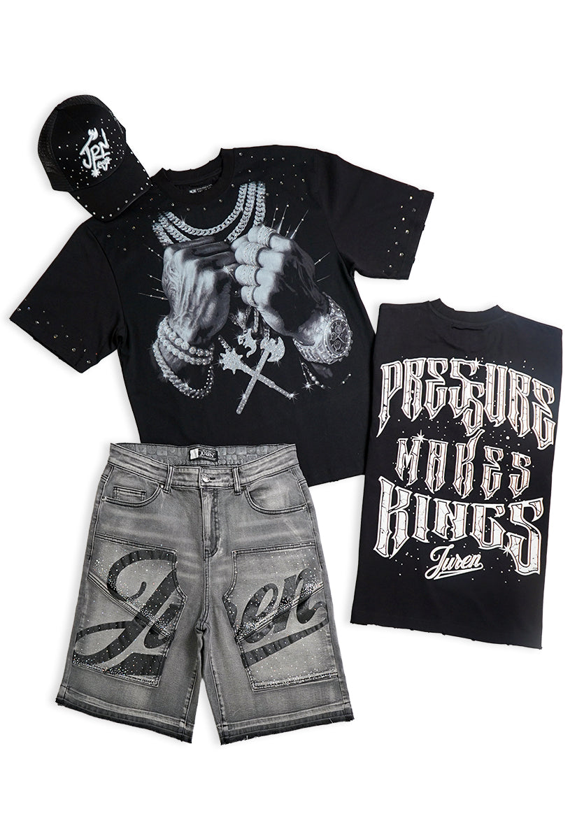 Pressure Makes Kings Black Shirt - Rhinestones, Grey Denim Shorts and Trucker Hat Combo